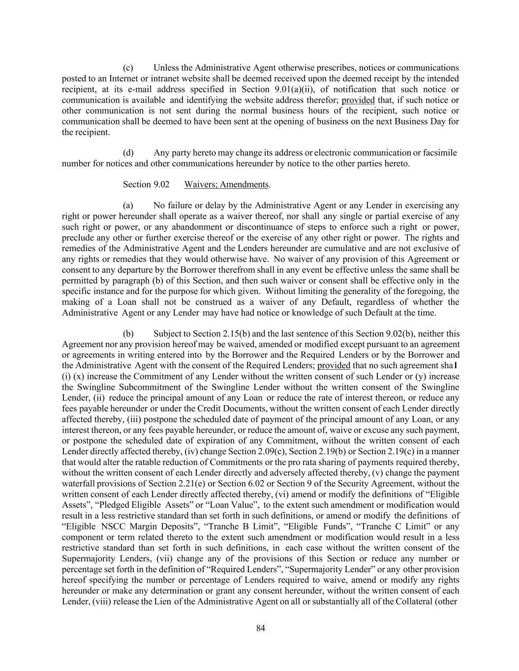 84 (c) Unless the Administrative Agent otherwise prescribes, notices or communications posted to an Internet or intranet website shall be deemed received upon the deemed receipt by the intended recipient, at its e-mail address specified in Section 9.01(a)(ii), of notification that such notice or communication is available and identifying the website address therefor; provided that, if such notice or other communication is not sent during the normal business hours of the recipient, such notice or communication shall be deemed to have been sent at the opening of business on the next Business Day for the recipient. (d) Any party hereto may change its address or electronic communication or facsimile number for notices and other communications hereunder by notice to the other parties hereto. Section 9.02 Waivers; Amendments. (a) No failure or delay by the Administrative Agent or any Lender in exercising any right or power hereunder shall operate as a waiver thereof, nor shall any single or partial exercise of any such right or power, or any abandonment or discontinuance of steps to enforce such a right or power, preclude any other or further exercise thereof or the exercise of any other right or power. The rights and remedies of the Administrative Agent and the Lenders hereunder are cumulative and are not exclusive of any rights or remedies that they would otherwise have. No waiver of any provision of this Agreement or consent to any departure by the Borrower therefrom shall in any event be effective unless the same shall be permitted by paragraph (b) of this Section, and then such waiver or consent shall be effective only in the specific instance and for the purpose for which given. Without limiting the generality of the foregoing, the making of a Loan shall not be construed as a waiver of any Default, regardless of whether the Administrative Agent or any Lender may have had notice or knowledge of such Default at the time. (b) Subject to Section 2.15(b) and the last sentence of this Section 9.02(b), neither this Agreement nor any provision hereof may be waived, amended or modified except pursuant to an agreement or agreements in writing entered into by the Borrower and the Required Lenders or by the Borrower and the Administrative Agent with the consent of the Required Lenders; provided that no such agreement sha l (i) (x) increase the Commitment of any Lender without the written consent of such Lender or (y) increase the Swingline Subcommitment of the Swingline Lender without the written consent of the Swingline Lender, (ii) reduce the principal amount of any Loan or reduce the rate of interest thereon, or reduce any fees payable hereunder or under the Credit Documents, without the written consent of each Lender directly affected thereby, (iii) postpone the scheduled date of payment of the principal amount of any Loan, or any interest thereon, or any fees payable hereunder, or reduce the amount of, waive or excuse any such payment, or postpone the scheduled date of expiration of any Commitment, without the written consent of each Lender directly affected thereby, (iv) change Section 2.09(c), Section 2.19(b) or Section 2.19(c) in a manner that would alter the ratable reduction of Commitments or the pro rata sharing of payments required thereby, without the written consent of each Lender directly and adversely affected thereby, (v) change the payment waterfall provisions of Section 2.21(e) or Section 6.02 or Section 9 of the Security Agreement, without the written consent of each Lender directly affected thereby, (vi) amend or modify the definitions of “Eligible Assets”, “Pledged Eligible Assets” or “Loan Value”, to the extent such amendment or modification would result in a less restrictive standard than set forth in such definitions, or amend or modify the definitions of “Eligible NSCC Margin Deposits”, “Tranche B Limit”, “Eligible Funds”, “Tranche C Limit” or any component or term related thereto to the extent such amendment or modification would result in a less restrictive standard than set forth in such definitions, in each case without the written consent of the Supermajority Lenders, (vii) change any of the provisions of this Section or reduce any number or percentage set forth in the definition of “Required Lenders”, “Supermajority Lender” or any other provision hereof specifying the number or percentage of Lenders required to waive, amend or modify any rights hereunder or make any determination or grant any consent hereunder, without the written consent of each Lender, (viii) release the Lien of the Administrative Agent on all or substantially all of the Collateral (other