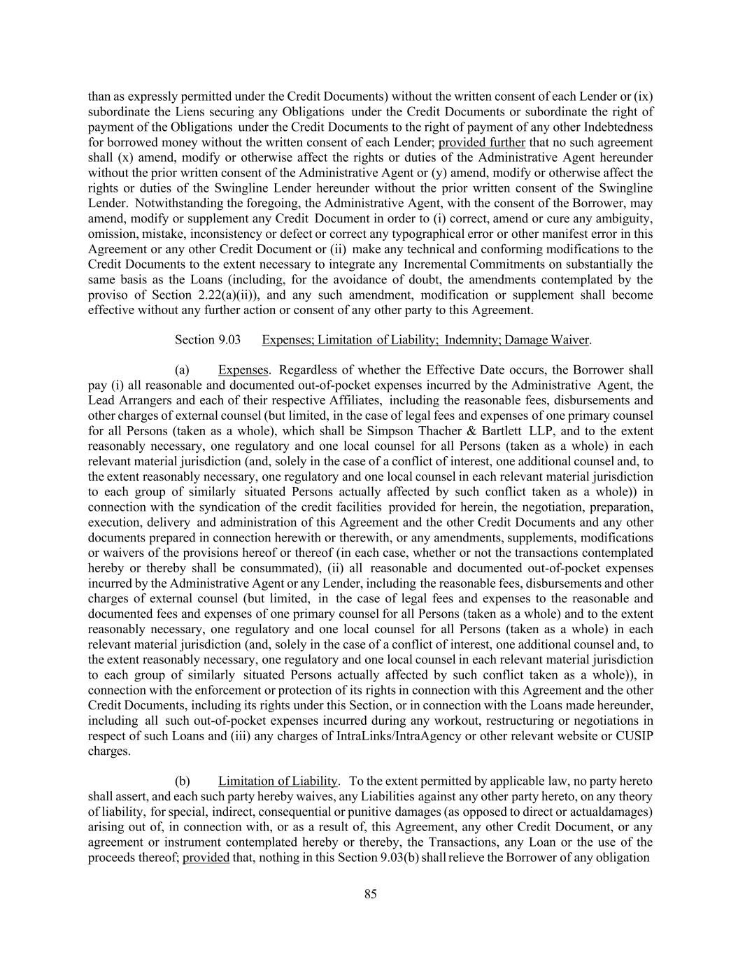 85 than as expressly permitted under the Credit Documents) without the written consent of each Lender or (ix) subordinate the Liens securing any Obligations under the Credit Documents or subordinate the right of payment of the Obligations under the Credit Documents to the right of payment of any other Indebtedness for borrowed money without the written consent of each Lender; provided further that no such agreement shall (x) amend, modify or otherwise affect the rights or duties of the Administrative Agent hereunder without the prior written consent of the Administrative Agent or (y) amend, modify or otherwise affect the rights or duties of the Swingline Lender hereunder without the prior written consent of the Swingline Lender. Notwithstanding the foregoing, the Administrative Agent, with the consent of the Borrower, may amend, modify or supplement any Credit Document in order to (i) correct, amend or cure any ambiguity, omission, mistake, inconsistency or defect or correct any typographical error or other manifest error in this Agreement or any other Credit Document or (ii) make any technical and conforming modifications to the Credit Documents to the extent necessary to integrate any Incremental Commitments on substantially the same basis as the Loans (including, for the avoidance of doubt, the amendments contemplated by the proviso of Section 2.22(a)(ii)), and any such amendment, modification or supplement shall become effective without any further action or consent of any other party to this Agreement. Section 9.03 Expenses; Limitation of Liability; Indemnity; Damage Waiver. (a) Expenses. Regardless of whether the Effective Date occurs, the Borrower shall pay (i) all reasonable and documented out-of-pocket expenses incurred by the Administrative Agent, the Lead Arrangers and each of their respective Affiliates, including the reasonable fees, disbursements and other charges of external counsel (but limited, in the case of legal fees and expenses of one primary counsel for all Persons (taken as a whole), which shall be Simpson Thacher & Bartlett LLP, and to the extent reasonably necessary, one regulatory and one local counsel for all Persons (taken as a whole) in each relevant material jurisdiction (and, solely in the case of a conflict of interest, one additional counsel and, to the extent reasonably necessary, one regulatory and one local counsel in each relevant material jurisdiction to each group of similarly situated Persons actually affected by such conflict taken as a whole)) in connection with the syndication of the credit facilities provided for herein, the negotiation, preparation, execution, delivery and administration of this Agreement and the other Credit Documents and any other documents prepared in connection herewith or therewith, or any amendments, supplements, modifications or waivers of the provisions hereof or thereof (in each case, whether or not the transactions contemplated hereby or thereby shall be consummated), (ii) all reasonable and documented out-of-pocket expenses incurred by the Administrative Agent or any Lender, including the reasonable fees, disbursements and other charges of external counsel (but limited, in the case of legal fees and expenses to the reasonable and documented fees and expenses of one primary counsel for all Persons (taken as a whole) and to the extent reasonably necessary, one regulatory and one local counsel for all Persons (taken as a whole) in each relevant material jurisdiction (and, solely in the case of a conflict of interest, one additional counsel and, to the extent reasonably necessary, one regulatory and one local counsel in each relevant material jurisdiction to each group of similarly situated Persons actually affected by such conflict taken as a whole)), in connection with the enforcement or protection of its rights in connection with this Agreement and the other Credit Documents, including its rights under this Section, or in connection with the Loans made hereunder, including all such out-of-pocket expenses incurred during any workout, restructuring or negotiations in respect of such Loans and (iii) any charges of IntraLinks/IntraAgency or other relevant website or CUSIP charges. (b) Limitation of Liability. To the extent permitted by applicable law, no party hereto shall assert, and each such party hereby waives, any Liabilities against any other party hereto, on any theory of liability, for special, indirect, consequential or punitive damages (as opposed to direct or actualdamages) arising out of, in connection with, or as a result of, this Agreement, any other Credit Document, or any agreement or instrument contemplated hereby or thereby, the Transactions, any Loan or the use of the proceeds thereof; provided that, nothing in this Section 9.03(b) shall relieve the Borrower of any obligation