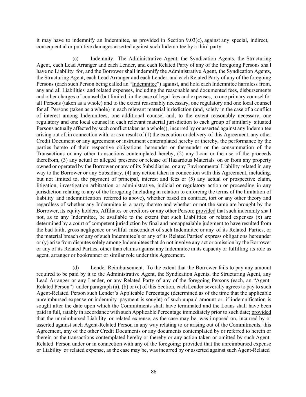 86 it may have to indemnify an Indemnitee, as provided in Section 9.03(c), against any special, indirect, consequential or punitive damages asserted against such Indemnitee by a third party. (c) Indemnity. The Administrative Agent, the Syndication Agents, the Structuring Agent, each Lead Arranger and each Lender, and each Related Party of any of the foregoing Persons sha l have no Liability for, and the Borrower shall indemnify the Administrative Agent, the Syndication Agents, the Structuring Agent, each Lead Arranger and each Lender, and each Related Party of any of the foregoing Persons (each such Person being called an “Indemnitee”) against, and hold each Indemnitee harmless from, any and all Liabilities and related expenses, including the reasonable and documented fees, disbursements and other charges of counsel (but limited, in the case of legal fees and expenses, to one primary counsel for all Persons (taken as a whole) and to the extent reasonably necessary, one regulatory and one local counsel for all Persons (taken as a whole) in each relevant material jurisdiction (and, solely in the case of a conflict of interest among Indemnitees, one additional counsel and, to the extent reasonably necessary, one regulatory and one local counsel in each relevant material jurisdiction to each group of similarly situated Persons actually affected by such conflict taken as a whole)), incurred by or asserted against any Indemnitee arising out of, in connection with, or as a result of (1) the execution or delivery of this Agreement, any other Credit Document or any agreement or instrument contemplated hereby or thereby, the performance by the parties hereto of their respective obligations hereunder or thereunder or the consummation of the Transactions or any other transactions contemplated hereby, (2) any Loan or the use of the proceeds therefrom, (3) any actual or alleged presence or release of Hazardous Materials on or from any property owned or operated by the Borrower or any of its Subsidiaries, or any Environmental Liability related in any way to the Borrower or any Subsidiary, (4) any action taken in connection with this Agreement, including, but not limited to, the payment of principal, interest and fees or (5) any actual or prospective claim, litigation, investigation arbitration or administrative, judicial or regulatory action or proceeding in any jurisdiction relating to any of the foregoing (including in relation to enforcing the terms of the limitation of liability and indemnification referred to above), whether based on contract, tort or any other theory and regardless of whether any Indemnitee is a party thereto and whether or not the same are brought by the Borrower, its equity holders, Affiliates or creditors or any other Person; provided that such indemnity sha l not, as to any Indemnitee, be available to the extent that such Liabilities or related expenses (x) are determined by a court of competent jurisdiction by final and nonappealable judgment to have resulted from the bad faith, gross negligence or willful misconduct of such Indemnitee or any of its Related Parties, or the material breach of any of such Indemnitee’s or any of its Related Parties’ express obligations hereunder or (y) arise from disputes solely among Indemnitees that do not involve any act or omission by the Borrower or any of its Related Parties, other than claims against any Indemnitee in its capacity or fulfilling its role as agent, arranger or bookrunner or similar role under this Agreement. (d) Lender Reimbursement. To the extent that the Borrower fails to pay any amount required to be paid by it to the Administrative Agent, the Syndication Agents, the Structuring Agent, any Lead Arranger or any Lender, or any Related Party of any of the foregoing Persons (each, an “Agent- Related Person”) under paragraph (a), (b) or (c) of this Section, each Lender severally agrees to pay to such Agent-Related Person such Lender’s Applicable Percentage (determined as of the time that the applicable unreimbursed expense or indemnity payment is sought) of such unpaid amount or, if indemnification is sought after the date upon which the Commitments shall have terminated and the Loans shall have been paid in full, ratably in accordance with such Applicable Percentage immediately prior to such date; provided that the unreimbursed Liability or related expense, as the case may be, was imposed on, incurred by or asserted against such Agent-Related Person in any way relating to or arising out of the Commitments, this Agreement, any of the other Credit Documents or any documents contemplated by or referred to herein or therein or the transactions contemplated hereby or thereby or any action taken or omitted by such Agent- Related Person under or in connection with any of the foregoing; provided that the unreimbursed expense or Liability or related expense, as the case may be, was incurred by or asserted against such Agent-Related