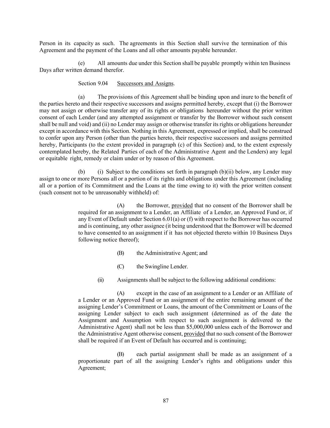 87 Person in its capacity as such. The agreements in this Section shall survive the termination of this Agreement and the payment of the Loans and all other amounts payable hereunder. (e) All amounts due under this Section shall be payable promptly within ten Business Days after written demand therefor. Section 9.04 Successors and Assigns. (a) The provisions of this Agreement shall be binding upon and inure to the benefit of the parties hereto and their respective successors and assigns permitted hereby, except that (i) the Borrower may not assign or otherwise transfer any of its rights or obligations hereunder without the prior written consent of each Lender (and any attempted assignment or transfer by the Borrower without such consent shall be null and void) and (ii) no Lender may assign or otherwise transfer its rights or obligations hereunder except in accordance with this Section. Nothing in this Agreement, expressed or implied, shall be construed to confer upon any Person (other than the parties hereto, their respective successors and assigns permitted hereby, Participants (to the extent provided in paragraph (c) of this Section) and, to the extent expressly contemplated hereby, the Related Parties of each of the Administrative Agent and the Lenders) any legal or equitable right, remedy or claim under or by reason of this Agreement. (b) (i) Subject to the conditions set forth in paragraph (b)(ii) below, any Lender may assign to one or more Persons all or a portion of its rights and obligations under this Agreement (including all or a portion of its Commitment and the Loans at the time owing to it) with the prior written consent (such consent not to be unreasonably withheld) of: (A) the Borrower, provided that no consent of the Borrower shall be required for an assignment to a Lender, an Affiliate of a Lender, an Approved Fund or, if any Event of Default under Section 6.01(a) or (f) with respect to the Borrower has occurred and is continuing, any other assignee (it being understood that the Borrower will be deemed to have consented to an assignment if it has not objected thereto within 10 Business Days following notice thereof); (B) the Administrative Agent; and (C) the Swingline Lender. (ii) Assignments shall be subject to the following additional conditions: (A) except in the case of an assignment to a Lender or an Affiliate of a Lender or an Approved Fund or an assignment of the entire remaining amount of the assigning Lender’s Commitment or Loans, the amount of the Commitment or Loans of the assigning Lender subject to each such assignment (determined as of the date the Assignment and Assumption with respect to such assignment is delivered to the Administrative Agent) shall not be less than $5,000,000 unless each of the Borrower and the Administrative Agent otherwise consent, provided that no such consent of the Borrower shall be required if an Event of Default has occurred and is continuing; (B) each partial assignment shall be made as an assignment of a proportionate part of all the assigning Lender’s rights and obligations under this Agreement;
