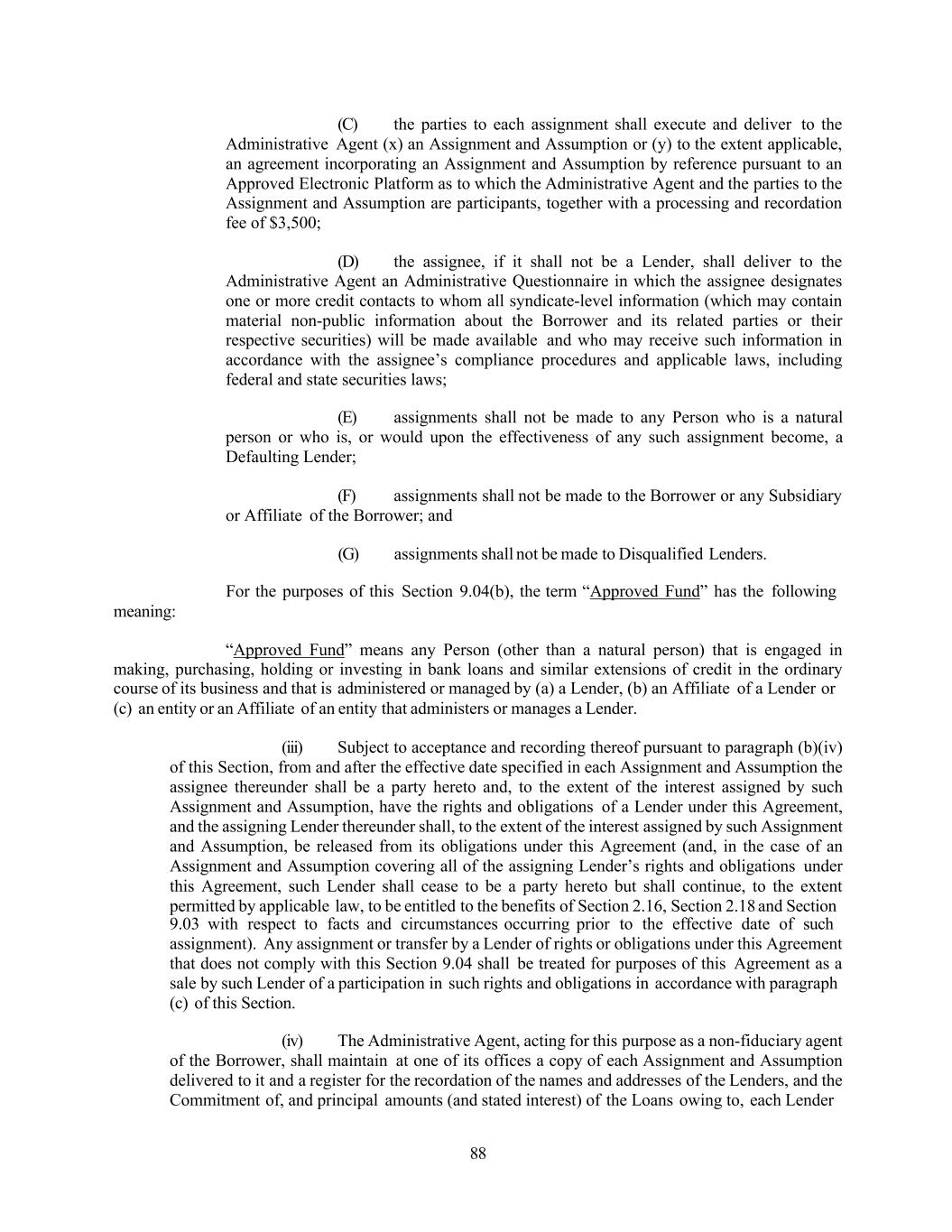 88 (C) the parties to each assignment shall execute and deliver to the Administrative Agent (x) an Assignment and Assumption or (y) to the extent applicable, an agreement incorporating an Assignment and Assumption by reference pursuant to an Approved Electronic Platform as to which the Administrative Agent and the parties to the Assignment and Assumption are participants, together with a processing and recordation fee of $3,500; (D) the assignee, if it shall not be a Lender, shall deliver to the Administrative Agent an Administrative Questionnaire in which the assignee designates one or more credit contacts to whom all syndicate-level information (which may contain material non-public information about the Borrower and its related parties or their respective securities) will be made available and who may receive such information in accordance with the assignee’s compliance procedures and applicable laws, including federal and state securities laws; (E) assignments shall not be made to any Person who is a natural person or who is, or would upon the effectiveness of any such assignment become, a Defaulting Lender; (F) assignments shall not be made to the Borrower or any Subsidiary or Affiliate of the Borrower; and meaning: (G) assignments shall not be made to Disqualified Lenders. For the purposes of this Section 9.04(b), the term “Approved Fund” has the following “Approved Fund” means any Person (other than a natural person) that is engaged in making, purchasing, holding or investing in bank loans and similar extensions of credit in the ordinary course of its business and that is administered or managed by (a) a Lender, (b) an Affiliate of a Lender or (c) an entity or an Affiliate of an entity that administers or manages a Lender. (iii) Subject to acceptance and recording thereof pursuant to paragraph (b)(iv) of this Section, from and after the effective date specified in each Assignment and Assumption the assignee thereunder shall be a party hereto and, to the extent of the interest assigned by such Assignment and Assumption, have the rights and obligations of a Lender under this Agreement, and the assigning Lender thereunder shall, to the extent of the interest assigned by such Assignment and Assumption, be released from its obligations under this Agreement (and, in the case of an Assignment and Assumption covering all of the assigning Lender’s rights and obligations under this Agreement, such Lender shall cease to be a party hereto but shall continue, to the extent permitted by applicable law, to be entitled to the benefits of Section 2.16, Section 2.18 and Section 9.03 with respect to facts and circumstances occurring prior to the effective date of such assignment). Any assignment or transfer by a Lender of rights or obligations under this Agreement that does not comply with this Section 9.04 shall be treated for purposes of this Agreement as a sale by such Lender of a participation in such rights and obligations in accordance with paragraph (c) of this Section. (iv) The Administrative Agent, acting for this purpose as a non-fiduciary agent of the Borrower, shall maintain at one of its offices a copy of each Assignment and Assumption delivered to it and a register for the recordation of the names and addresses of the Lenders, and the Commitment of, and principal amounts (and stated interest) of the Loans owing to, each Lender