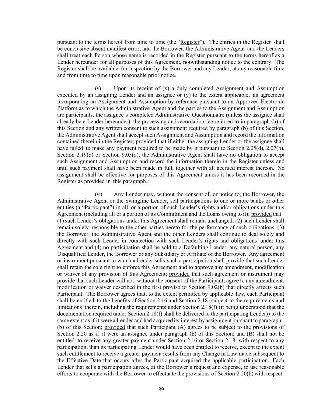 89 pursuant to the terms hereof from time to time (the “Register”). The entries in the Register shall be conclusive absent manifest error, and the Borrower, the Administrative Agent and the Lenders shall treat each Person whose name is recorded in the Register pursuant to the terms hereof as a Lender hereunder for all purposes of this Agreement, notwithstanding notice to the contrary. The Register shall be available for inspection by the Borrower and any Lender, at any reasonable time and from time to time upon reasonable prior notice. (v) Upon its receipt of (x) a duly completed Assignment and Assumption executed by an assigning Lender and an assignee or (y) to the extent applicable, an agreement incorporating an Assignment and Assumption by reference pursuant to an Approved Electronic Platform as to which the Administrative Agent and the parties to the Assignment and Assumption are participants, the assignee’s completed Administrative Questionnaire (unless the assignee shall already be a Lender hereunder), the processing and recordation fee referred to in paragraph (b) of this Section and any written consent to such assignment required by paragraph (b) of this Section, the Administrative Agent shall accept such Assignment and Assumption and record the information contained therein in the Register; provided that if either the assigning Lender or the assignee shall have failed to make any payment required to be made by it pursuant to Section 2.05(d), 2.07(b), Section 2.19(d) or Section 9.03(d), the Administrative Agent shall have no obligation to accept such Assignment and Assumption and record the information therein in the Register unless and until such payment shall have been made in full, together with all accrued interest thereon. No assignment shall be effective for purposes of this Agreement unless it has been recorded in the Register as provided in this paragraph. (vi) Any Lender may, without the consent of, or notice to, the Borrower, the Administrative Agent or the Swingline Lender, sell participations to one or more banks or other entities (a “Participant”) in all or a portion of such Lender’s rights and/or obligations under this Agreement (including all or a portion of its Commitment and the Loans owing to it); provided that (1) such Lender’s obligations under this Agreement shall remain unchanged, (2) such Lender shall remain solely responsible to the other parties hereto for the performance of such obligations, (3) the Borrower, the Administrative Agent and the other Lenders shall continue to deal solely and directly with such Lender in connection with such Lender’s rights and obligations under this Agreement and (4) no participation shall be sold to a Defaulting Lender, any natural person, any Disqualified Lender, the Borrower or any Subsidiary or Affiliate of the Borrower. Any agreement or instrument pursuant to which a Lender sells such a participation shall provide that such Lender shall retain the sole right to enforce this Agreement and to approve any amendment, modification or waiver of any provision of this Agreement; provided that such agreement or instrument may provide that such Lender will not, without the consent of the Participant, agree to any amendment, modification or waiver described in the first proviso to Section 9.02(b) that directly affects such Participant. The Borrower agrees that, to the extent permitted by applicable law, each Participant shall be entitled to the benefits of Section 2.16 and Section 2.18 (subject to the requirements and limitations therein, including the requirements under Section 2.18(f) (it being understood that the documentation required under Section 2.18(f) shall be delivered to the participating Lender)) to the same extent as if it were a Lender and had acquired its interest by assignment pursuant to paragraph (b) of this Section; provided that such Participant (A) agrees to be subject to the provisions of Section 2.20 as if it were an assignee under paragraph (b) of this Section; and (B) shall not be entitled to receive any greater payment under Section 2.16 or Section 2.18, with respect to any participation, than its participating Lender would have been entitled to receive, except to the extent such entitlement to receive a greater payment results from any Change in Law made subsequent to the Effective Date that occurs after the Participant acquired the applicable participation. Each Lender that sells a participation agrees, at the Borrower’s request and expense, to use reasonable efforts to cooperate with the Borrower to effectuate the provisions of Section 2.20(b) with respect