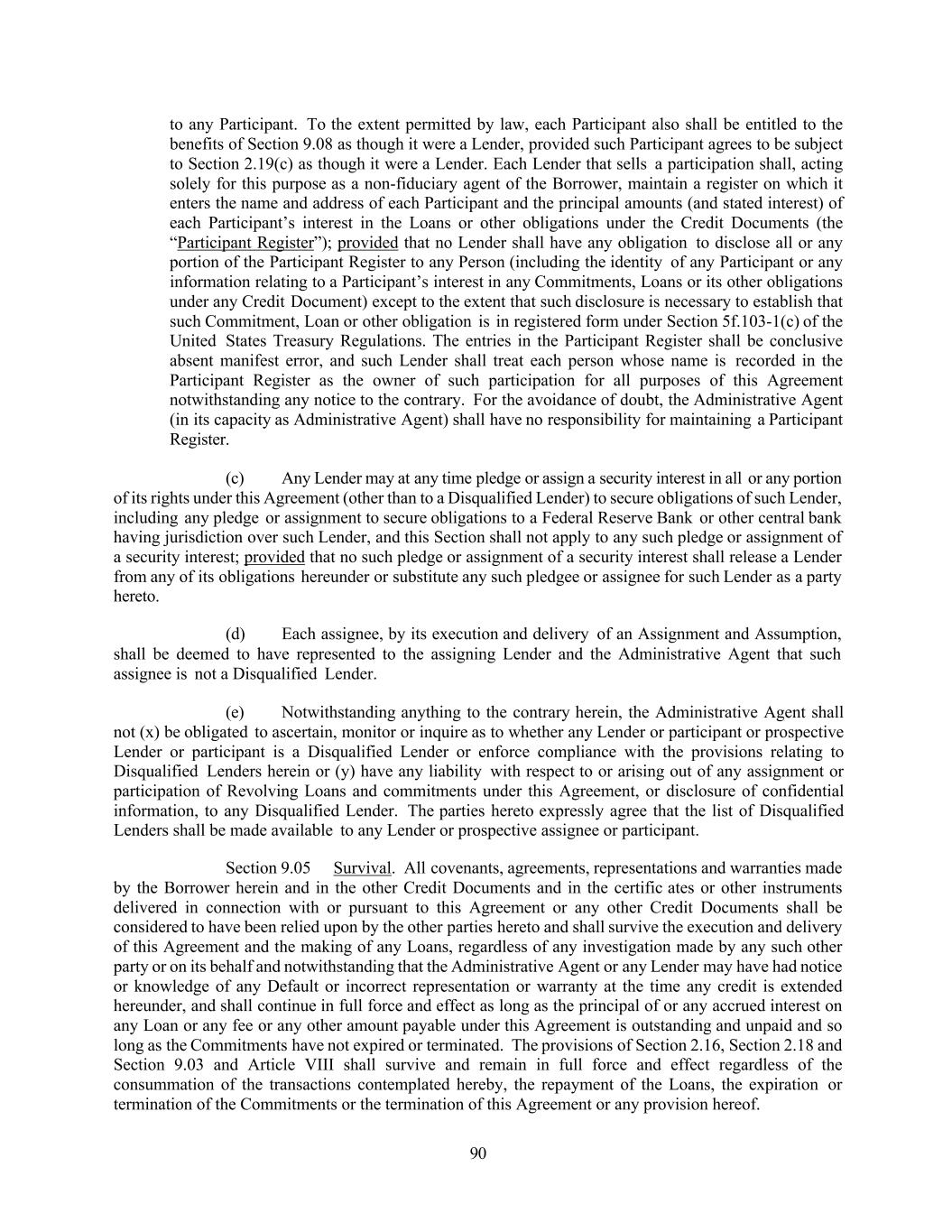 90 to any Participant. To the extent permitted by law, each Participant also shall be entitled to the benefits of Section 9.08 as though it were a Lender, provided such Participant agrees to be subject to Section 2.19(c) as though it were a Lender. Each Lender that sells a participation shall, acting solely for this purpose as a non-fiduciary agent of the Borrower, maintain a register on which it enters the name and address of each Participant and the principal amounts (and stated interest) of each Participant’s interest in the Loans or other obligations under the Credit Documents (the “Participant Register”); provided that no Lender shall have any obligation to disclose all or any portion of the Participant Register to any Person (including the identity of any Participant or any information relating to a Participant’s interest in any Commitments, Loans or its other obligations under any Credit Document) except to the extent that such disclosure is necessary to establish that such Commitment, Loan or other obligation is in registered form under Section 5f.103-1(c) of the United States Treasury Regulations. The entries in the Participant Register shall be conclusive absent manifest error, and such Lender shall treat each person whose name is recorded in the Participant Register as the owner of such participation for all purposes of this Agreement notwithstanding any notice to the contrary. For the avoidance of doubt, the Administrative Agent (in its capacity as Administrative Agent) shall have no responsibility for maintaining a Participant Register. (c) Any Lender may at any time pledge or assign a security interest in all or any portion of its rights under this Agreement (other than to a Disqualified Lender) to secure obligations of such Lender, including any pledge or assignment to secure obligations to a Federal Reserve Bank or other central bank having jurisdiction over such Lender, and this Section shall not apply to any such pledge or assignment of a security interest; provided that no such pledge or assignment of a security interest shall release a Lender from any of its obligations hereunder or substitute any such pledgee or assignee for such Lender as a party hereto. (d) Each assignee, by its execution and delivery of an Assignment and Assumption, shall be deemed to have represented to the assigning Lender and the Administrative Agent that such assignee is not a Disqualified Lender. (e) Notwithstanding anything to the contrary herein, the Administrative Agent shall not (x) be obligated to ascertain, monitor or inquire as to whether any Lender or participant or prospective Lender or participant is a Disqualified Lender or enforce compliance with the provisions relating to Disqualified Lenders herein or (y) have any liability with respect to or arising out of any assignment or participation of Revolving Loans and commitments under this Agreement, or disclosure of confidential information, to any Disqualified Lender. The parties hereto expressly agree that the list of Disqualified Lenders shall be made available to any Lender or prospective assignee or participant. Section 9.05 Survival. All covenants, agreements, representations and warranties made by the Borrower herein and in the other Credit Documents and in the certific ates or other instruments delivered in connection with or pursuant to this Agreement or any other Credit Documents shall be considered to have been relied upon by the other parties hereto and shall survive the execution and delivery of this Agreement and the making of any Loans, regardless of any investigation made by any such other party or on its behalf and notwithstanding that the Administrative Agent or any Lender may have had notice or knowledge of any Default or incorrect representation or warranty at the time any credit is extended hereunder, and shall continue in full force and effect as long as the principal of or any accrued interest on any Loan or any fee or any other amount payable under this Agreement is outstanding and unpaid and so long as the Commitments have not expired or terminated. The provisions of Section 2.16, Section 2.18 and Section 9.03 and Article VIII shall survive and remain in full force and effect regardless of the consummation of the transactions contemplated hereby, the repayment of the Loans, the expiration or termination of the Commitments or the termination of this Agreement or any provision hereof.