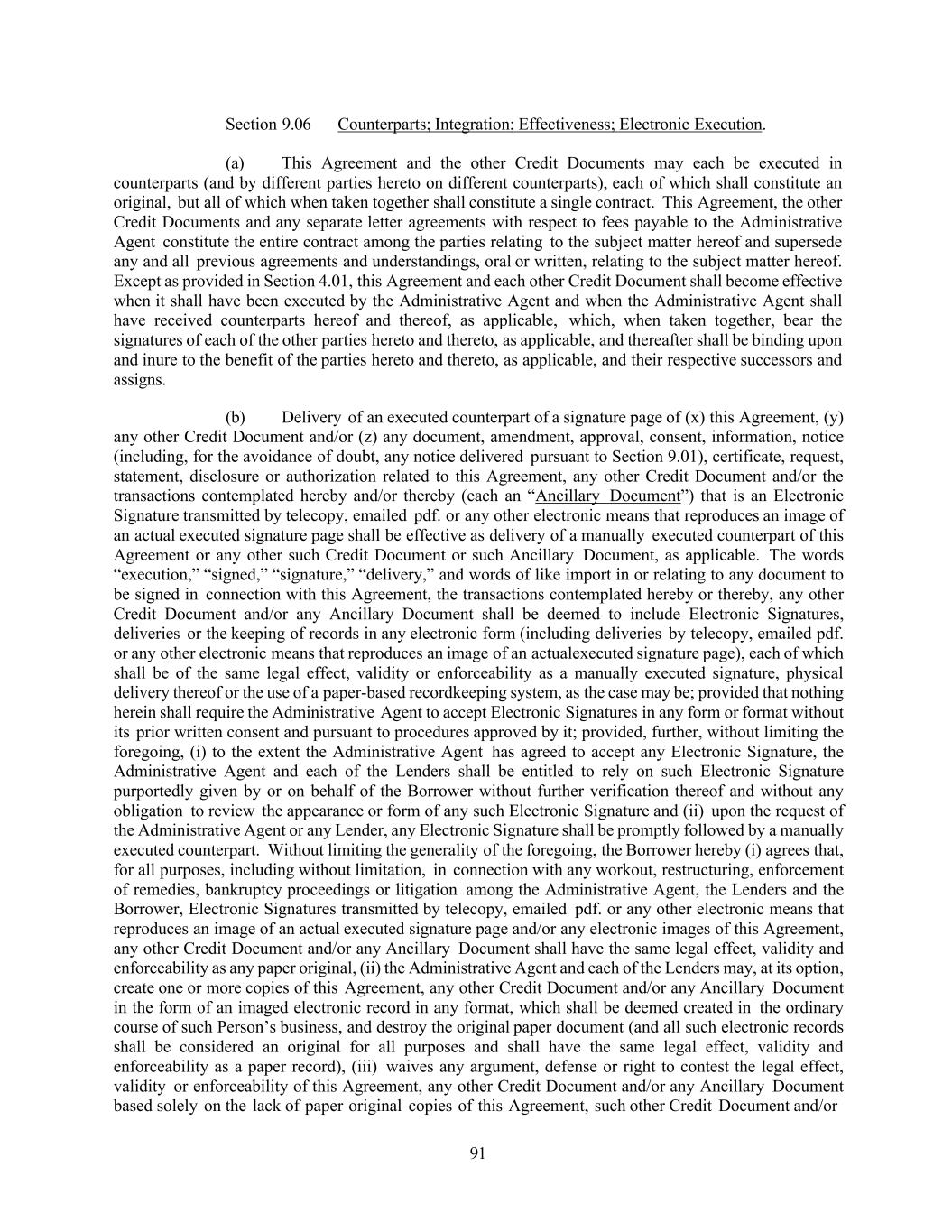 91 Section 9.06 Counterparts; Integration; Effectiveness; Electronic Execution. (a) This Agreement and the other Credit Documents may each be executed in counterparts (and by different parties hereto on different counterparts), each of which shall constitute an original, but all of which when taken together shall constitute a single contract. This Agreement, the other Credit Documents and any separate letter agreements with respect to fees payable to the Administrative Agent constitute the entire contract among the parties relating to the subject matter hereof and supersede any and all previous agreements and understandings, oral or written, relating to the subject matter hereof. Except as provided in Section 4.01, this Agreement and each other Credit Document shall become effective when it shall have been executed by the Administrative Agent and when the Administrative Agent shall have received counterparts hereof and thereof, as applicable, which, when taken together, bear the signatures of each of the other parties hereto and thereto, as applicable, and thereafter shall be binding upon and inure to the benefit of the parties hereto and thereto, as applicable, and their respective successors and assigns. (b) Delivery of an executed counterpart of a signature page of (x) this Agreement, (y) any other Credit Document and/or (z) any document, amendment, approval, consent, information, notice (including, for the avoidance of doubt, any notice delivered pursuant to Section 9.01), certificate, request, statement, disclosure or authorization related to this Agreement, any other Credit Document and/or the transactions contemplated hereby and/or thereby (each an “Ancillary Document”) that is an Electronic Signature transmitted by telecopy, emailed pdf. or any other electronic means that reproduces an image of an actual executed signature page shall be effective as delivery of a manually executed counterpart of this Agreement or any other such Credit Document or such Ancillary Document, as applicable. The words “execution,” “signed,” “signature,” “delivery,” and words of like import in or relating to any document to be signed in connection with this Agreement, the transactions contemplated hereby or thereby, any other Credit Document and/or any Ancillary Document shall be deemed to include Electronic Signatures, deliveries or the keeping of records in any electronic form (including deliveries by telecopy, emailed pdf. or any other electronic means that reproduces an image of an actualexecuted signature page), each of which shall be of the same legal effect, validity or enforceability as a manually executed signature, physical delivery thereof or the use of a paper-based recordkeeping system, as the case may be; provided that nothing herein shall require the Administrative Agent to accept Electronic Signatures in any form or format without its prior written consent and pursuant to procedures approved by it; provided, further, without limiting the foregoing, (i) to the extent the Administrative Agent has agreed to accept any Electronic Signature, the Administrative Agent and each of the Lenders shall be entitled to rely on such Electronic Signature purportedly given by or on behalf of the Borrower without further verification thereof and without any obligation to review the appearance or form of any such Electronic Signature and (ii) upon the request of the Administrative Agent or any Lender, any Electronic Signature shall be promptly followed by a manually executed counterpart. Without limiting the generality of the foregoing, the Borrower hereby (i) agrees that, for all purposes, including without limitation, in connection with any workout, restructuring, enforcement of remedies, bankruptcy proceedings or litigation among the Administrative Agent, the Lenders and the Borrower, Electronic Signatures transmitted by telecopy, emailed pdf. or any other electronic means that reproduces an image of an actual executed signature page and/or any electronic images of this Agreement, any other Credit Document and/or any Ancillary Document shall have the same legal effect, validity and enforceability as any paper original, (ii) the Administrative Agent and each of the Lenders may, at its option, create one or more copies of this Agreement, any other Credit Document and/or any Ancillary Document in the form of an imaged electronic record in any format, which shall be deemed created in the ordinary course of such Person’s business, and destroy the original paper document (and all such electronic records shall be considered an original for all purposes and shall have the same legal effect, validity and enforceability as a paper record), (iii) waives any argument, defense or right to contest the legal effect, validity or enforceability of this Agreement, any other Credit Document and/or any Ancillary Document based solely on the lack of paper original copies of this Agreement, such other Credit Document and/or