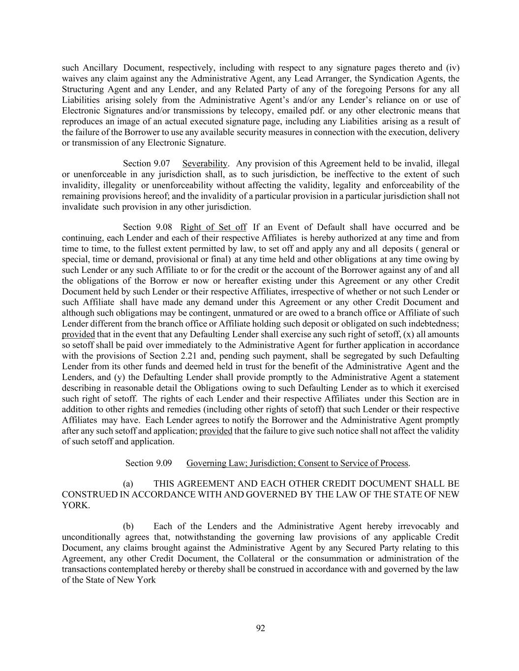 92 such Ancillary Document, respectively, including with respect to any signature pages thereto and (iv) waives any claim against any the Administrative Agent, any Lead Arranger, the Syndication Agents, the Structuring Agent and any Lender, and any Related Party of any of the foregoing Persons for any all Liabilities arising solely from the Administrative Agent’s and/or any Lender’s reliance on or use of Electronic Signatures and/or transmissions by telecopy, emailed pdf. or any other electronic means that reproduces an image of an actual executed signature page, including any Liabilities arising as a result of the failure of the Borrower to use any available security measures in connection with the execution, delivery or transmission of any Electronic Signature. Section 9.07 Severability. Any provision of this Agreement held to be invalid, illegal or unenforceable in any jurisdiction shall, as to such jurisdiction, be ineffective to the extent of such invalidity, illegality or unenforceability without affecting the validity, legality and enforceability of the remaining provisions hereof; and the invalidity of a particular provision in a particular jurisdiction shall not invalidate such provision in any other jurisdiction. Section 9.08 Right of Set off If an Event of Default shall have occurred and be continuing, each Lender and each of their respective Affiliates is hereby authorized at any time and from time to time, to the fullest extent permitted by law, to set off and apply any and all deposits ( general or special, time or demand, provisional or final) at any time held and other obligations at any time owing by such Lender or any such Affiliate to or for the credit or the account of the Borrower against any of and all the obligations of the Borrow er now or hereafter existing under this Agreement or any other Credit Document held by such Lender or their respective Affiliates, irrespective of whether or not such Lender or such Affiliate shall have made any demand under this Agreement or any other Credit Document and although such obligations may be contingent, unmatured or are owed to a branch office or Affiliate of such Lender different from the branch office or Affiliate holding such deposit or obligated on such indebtedness; provided that in the event that any Defaulting Lender shall exercise any such right of setoff, (x) all amounts so setoff shall be paid over immediately to the Administrative Agent for further application in accordance with the provisions of Section 2.21 and, pending such payment, shall be segregated by such Defaulting Lender from its other funds and deemed held in trust for the benefit of the Administrative Agent and the Lenders, and (y) the Defaulting Lender shall provide promptly to the Administrative Agent a statement describing in reasonable detail the Obligations owing to such Defaulting Lender as to which it exercised such right of setoff. The rights of each Lender and their respective Affiliates under this Section are in addition to other rights and remedies (including other rights of setoff) that such Lender or their respective Affiliates may have. Each Lender agrees to notify the Borrower and the Administrative Agent promptly after any such setoff and application; provided that the failure to give such notice shall not affect the validity of such setoff and application. Section 9.09 Governing Law; Jurisdiction; Consent to Service of Process. (a) THIS AGREEMENT AND EACH OTHER CREDIT DOCUMENT SHALL BE CONSTRUED IN ACCORDANCE WITH AND GOVERNED BY THE LAW OF THE STATE OF NEW YORK. (b) Each of the Lenders and the Administrative Agent hereby irrevocably and unconditionally agrees that, notwithstanding the governing law provisions of any applicable Credit Document, any claims brought against the Administrative Agent by any Secured Party relating to this Agreement, any other Credit Document, the Collateral or the consummation or administration of the transactions contemplated hereby or thereby shall be construed in accordance with and governed by the law of the State of New York