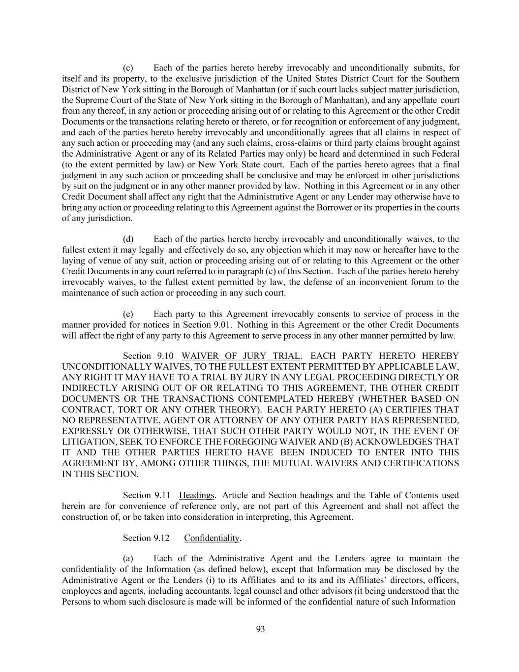 93 (c) Each of the parties hereto hereby irrevocably and unconditionally submits, for itself and its property, to the exclusive jurisdiction of the United States District Court for the Southern District of New York sitting in the Borough of Manhattan (or if such court lacks subject matter jurisdiction, the Supreme Court of the State of New York sitting in the Borough of Manhattan), and any appellate court from any thereof, in any action or proceeding arising out of or relating to this Agreement or the other Credit Documents or the transactions relating hereto or thereto, or for recognition or enforcement of any judgment, and each of the parties hereto hereby irrevocably and unconditionally agrees that all claims in respect of any such action or proceeding may (and any such claims, cross-claims or third party claims brought against the Administrative Agent or any of its Related Parties may only) be heard and determined in such Federal (to the extent permitted by law) or New York State court. Each of the parties hereto agrees that a final judgment in any such action or proceeding shall be conclusive and may be enforced in other jurisdictions by suit on the judgment or in any other manner provided by law. Nothing in this Agreement or in any other Credit Document shall affect any right that the Administrative Agent or any Lender may otherwise have to bring any action or proceeding relating to this Agreement against the Borrower or its properties in the courts of any jurisdiction. (d) Each of the parties hereto hereby irrevocably and unconditionally waives, to the fullest extent it may legally and effectively do so, any objection which it may now or hereafter have to the laying of venue of any suit, action or proceeding arising out of or relating to this Agreement or the other Credit Documents in any court referred to in paragraph (c) of this Section. Each of the parties hereto hereby irrevocably waives, to the fullest extent permitted by law, the defense of an inconvenient forum to the maintenance of such action or proceeding in any such court. (e) Each party to this Agreement irrevocably consents to service of process in the manner provided for notices in Section 9.01. Nothing in this Agreement or the other Credit Documents will affect the right of any party to this Agreement to serve process in any other manner permitted by law. Section 9.10 WAIVER OF JURY TRIAL. EACH PARTY HERETO HEREBY UNCONDITIONALLY WAIVES, TO THE FULLEST EXTENT PERMITTED BY APPLICABLE LAW, ANY RIGHT IT MAY HAVE TO A TRIAL BY JURY IN ANY LEGAL PROCEEDING DIRECTLY OR INDIRECTLY ARISING OUT OF OR RELATING TO THIS AGREEMENT, THE OTHER CREDIT DOCUMENTS OR THE TRANSACTIONS CONTEMPLATED HEREBY (WHETHER BASED ON CONTRACT, TORT OR ANY OTHER THEORY). EACH PARTY HERETO (A) CERTIFIES THAT NO REPRESENTATIVE, AGENT OR ATTORNEY OF ANY OTHER PARTY HAS REPRESENTED, EXPRESSLY OR OTHERWISE, THAT SUCH OTHER PARTY WOULD NOT, IN THE EVENT OF LITIGATION, SEEK TO ENFORCE THE FOREGOING WAIVER AND (B) ACKNOWLEDGES THAT IT AND THE OTHER PARTIES HERETO HAVE BEEN INDUCED TO ENTER INTO THIS AGREEMENT BY, AMONG OTHER THINGS, THE MUTUAL WAIVERS AND CERTIFICATIONS IN THIS SECTION. Section 9.11 Headings. Article and Section headings and the Table of Contents used herein are for convenience of reference only, are not part of this Agreement and shall not affect the construction of, or be taken into consideration in interpreting, this Agreement. Section 9.12 Confidentiality. (a) Each of the Administrative Agent and the Lenders agree to maintain the confidentiality of the Information (as defined below), except that Information may be disclosed by the Administrative Agent or the Lenders (i) to its Affiliates and to its and its Affiliates’ directors, officers, employees and agents, including accountants, legal counsel and other advisors (it being understood that the Persons to whom such disclosure is made will be informed of the confidential nature of such Information