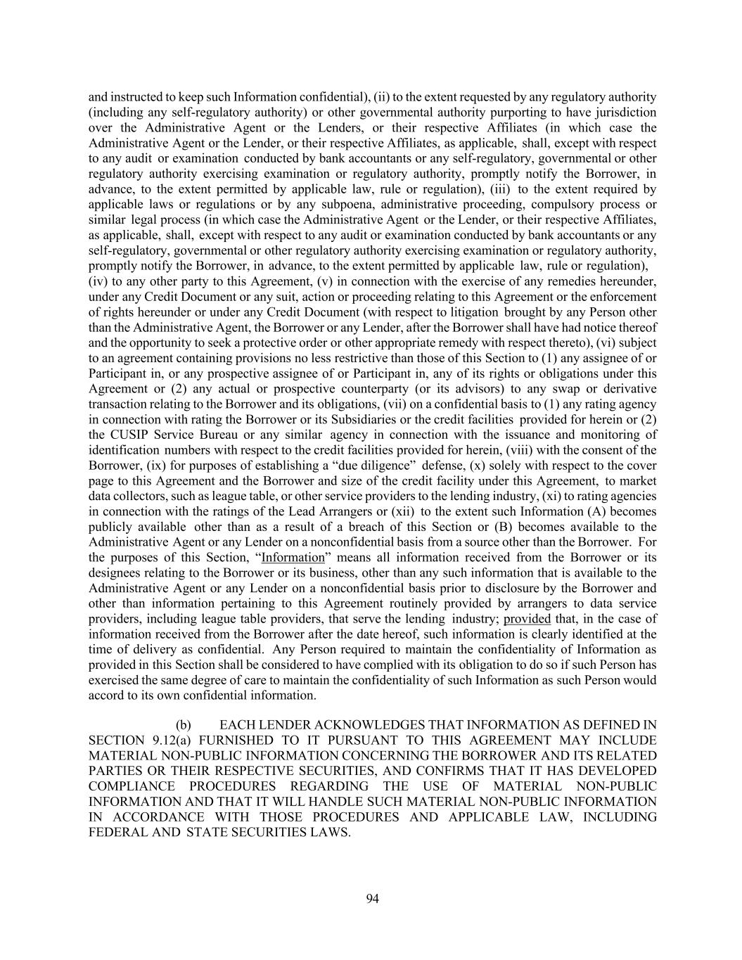 94 and instructed to keep such Information confidential), (ii) to the extent requested by any regulatory authority (including any self-regulatory authority) or other governmental authority purporting to have jurisdiction over the Administrative Agent or the Lenders, or their respective Affiliates (in which case the Administrative Agent or the Lender, or their respective Affiliates, as applicable, shall, except with respect to any audit or examination conducted by bank accountants or any self-regulatory, governmental or other regulatory authority exercising examination or regulatory authority, promptly notify the Borrower, in advance, to the extent permitted by applicable law, rule or regulation), (iii) to the extent required by applicable laws or regulations or by any subpoena, administrative proceeding, compulsory process or similar legal process (in which case the Administrative Agent or the Lender, or their respective Affiliates, as applicable, shall, except with respect to any audit or examination conducted by bank accountants or any self-regulatory, governmental or other regulatory authority exercising examination or regulatory authority, promptly notify the Borrower, in advance, to the extent permitted by applicable law, rule or regulation), (iv) to any other party to this Agreement, (v) in connection with the exercise of any remedies hereunder, under any Credit Document or any suit, action or proceeding relating to this Agreement or the enforcement of rights hereunder or under any Credit Document (with respect to litigation brought by any Person other than the Administrative Agent, the Borrower or any Lender, after the Borrower shall have had notice thereof and the opportunity to seek a protective order or other appropriate remedy with respect thereto), (vi) subject to an agreement containing provisions no less restrictive than those of this Section to (1) any assignee of or Participant in, or any prospective assignee of or Participant in, any of its rights or obligations under this Agreement or (2) any actual or prospective counterparty (or its advisors) to any swap or derivative transaction relating to the Borrower and its obligations, (vii) on a confidential basis to (1) any rating agency in connection with rating the Borrower or its Subsidiaries or the credit facilities provided for herein or (2) the CUSIP Service Bureau or any similar agency in connection with the issuance and monitoring of identification numbers with respect to the credit facilities provided for herein, (viii) with the consent of the Borrower, (ix) for purposes of establishing a “due diligence” defense, (x) solely with respect to the cover page to this Agreement and the Borrower and size of the credit facility under this Agreement, to market data collectors, such as league table, or other service providers to the lending industry, (xi) to rating agencies in connection with the ratings of the Lead Arrangers or (xii) to the extent such Information (A) becomes publicly available other than as a result of a breach of this Section or (B) becomes available to the Administrative Agent or any Lender on a nonconfidential basis from a source other than the Borrower. For the purposes of this Section, “Information” means all information received from the Borrower or its designees relating to the Borrower or its business, other than any such information that is available to the Administrative Agent or any Lender on a nonconfidential basis prior to disclosure by the Borrower and other than information pertaining to this Agreement routinely provided by arrangers to data service providers, including league table providers, that serve the lending industry; provided that, in the case of information received from the Borrower after the date hereof, such information is clearly identified at the time of delivery as confidential. Any Person required to maintain the confidentiality of Information as provided in this Section shall be considered to have complied with its obligation to do so if such Person has exercised the same degree of care to maintain the confidentiality of such Information as such Person would accord to its own confidential information. (b) EACH LENDER ACKNOWLEDGES THAT INFORMATION AS DEFINED IN SECTION 9.12(a) FURNISHED TO IT PURSUANT TO THIS AGREEMENT MAY INCLUDE MATERIAL NON-PUBLIC INFORMATION CONCERNING THE BORROWER AND ITS RELATED PARTIES OR THEIR RESPECTIVE SECURITIES, AND CONFIRMS THAT IT HAS DEVELOPED COMPLIANCE PROCEDURES REGARDING THE USE OF MATERIAL NON-PUBLIC INFORMATION AND THAT IT WILL HANDLE SUCH MATERIAL NON-PUBLIC INFORMATION IN ACCORDANCE WITH THOSE PROCEDURES AND APPLICABLE LAW, INCLUDING FEDERAL AND STATE SECURITIES LAWS.