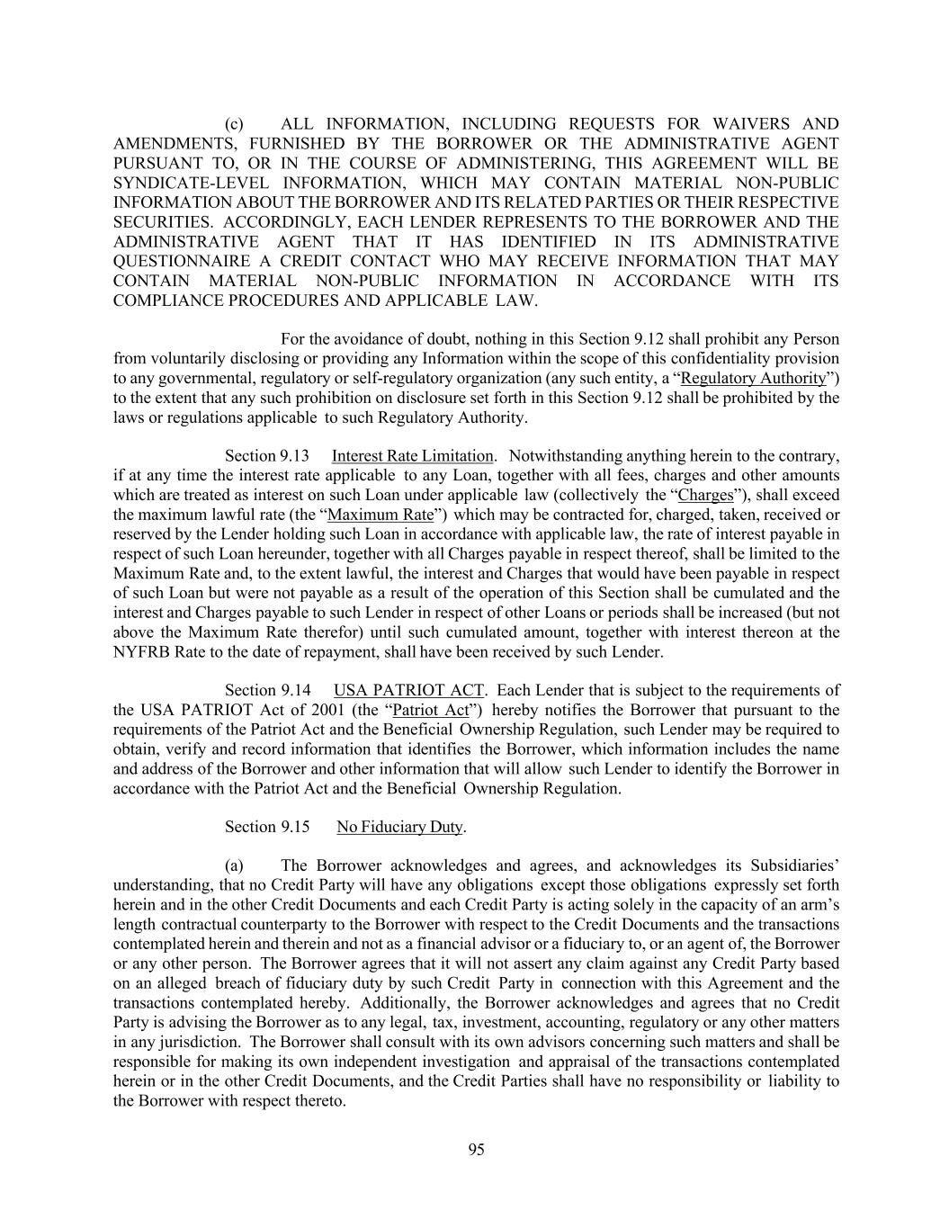 95 (c) ALL INFORMATION, INCLUDING REQUESTS FOR WAIVERS AND AMENDMENTS, FURNISHED BY THE BORROWER OR THE ADMINISTRATIVE AGENT PURSUANT TO, OR IN THE COURSE OF ADMINISTERING, THIS AGREEMENT WILL BE SYNDICATE-LEVEL INFORMATION, WHICH MAY CONTAIN MATERIAL NON-PUBLIC INFORMATION ABOUT THE BORROWER AND ITS RELATED PARTIES OR THEIR RESPECTIVE SECURITIES. ACCORDINGLY, EACH LENDER REPRESENTS TO THE BORROWER AND THE ADMINISTRATIVE AGENT THAT IT HAS IDENTIFIED IN ITS ADMINISTRATIVE QUESTIONNAIRE A CREDIT CONTACT WHO MAY RECEIVE INFORMATION THAT MAY CONTAIN MATERIAL NON-PUBLIC INFORMATION IN ACCORDANCE WITH ITS COMPLIANCE PROCEDURES AND APPLICABLE LAW. For the avoidance of doubt, nothing in this Section 9.12 shall prohibit any Person from voluntarily disclosing or providing any Information within the scope of this confidentiality provision to any governmental, regulatory or self-regulatory organization (any such entity, a “Regulatory Authority”) to the extent that any such prohibition on disclosure set forth in this Section 9.12 shall be prohibited by the laws or regulations applicable to such Regulatory Authority. Section 9.13 Interest Rate Limitation. Notwithstanding anything herein to the contrary, if at any time the interest rate applicable to any Loan, together with all fees, charges and other amounts which are treated as interest on such Loan under applicable law (collectively the “Charges”), shall exceed the maximum lawful rate (the “Maximum Rate”) which may be contracted for, charged, taken, received or reserved by the Lender holding such Loan in accordance with applicable law, the rate of interest payable in respect of such Loan hereunder, together with all Charges payable in respect thereof, shall be limited to the Maximum Rate and, to the extent lawful, the interest and Charges that would have been payable in respect of such Loan but were not payable as a result of the operation of this Section shall be cumulated and the interest and Charges payable to such Lender in respect of other Loans or periods shall be increased (but not above the Maximum Rate therefor) until such cumulated amount, together with interest thereon at the NYFRB Rate to the date of repayment, shall have been received by such Lender. Section 9.14 USA PATRIOT ACT. Each Lender that is subject to the requirements of the USA PATRIOT Act of 2001 (the “Patriot Act”) hereby notifies the Borrower that pursuant to the requirements of the Patriot Act and the Beneficial Ownership Regulation, such Lender may be required to obtain, verify and record information that identifies the Borrower, which information includes the name and address of the Borrower and other information that will allow such Lender to identify the Borrower in accordance with the Patriot Act and the Beneficial Ownership Regulation. Section 9.15 No Fiduciary Duty. (a) The Borrower acknowledges and agrees, and acknowledges its Subsidiaries’ understanding, that no Credit Party will have any obligations except those obligations expressly set forth herein and in the other Credit Documents and each Credit Party is acting solely in the capacity of an arm’s length contractual counterparty to the Borrower with respect to the Credit Documents and the transactions contemplated herein and therein and not as a financial advisor or a fiduciary to, or an agent of, the Borrower or any other person. The Borrower agrees that it will not assert any claim against any Credit Party based on an alleged breach of fiduciary duty by such Credit Party in connection with this Agreement and the transactions contemplated hereby. Additionally, the Borrower acknowledges and agrees that no Credit Party is advising the Borrower as to any legal, tax, investment, accounting, regulatory or any other matters in any jurisdiction. The Borrower shall consult with its own advisors concerning such matters and shall be responsible for making its own independent investigation and appraisal of the transactions contemplated herein or in the other Credit Documents, and the Credit Parties shall have no responsibility or liability to the Borrower with respect thereto.