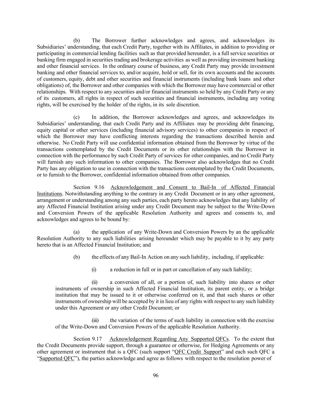 96 (b) The Borrower further acknowledges and agrees, and acknowledges its Subsidiaries’ understanding, that each Credit Party, together with its Affiliates, in addition to providing or participating in commercial lending facilities such as that provided hereunder, is a full service securities or banking firm engaged in securities trading and brokerage activities as well as providing investment banking and other financial services. In the ordinary course of business, any Credit Party may provide investment banking and other financial services to, and/or acquire, hold or sell, for its own accounts and the accounts of customers, equity, debt and other securities and financial instruments (including bank loans and other obligations) of, the Borrower and other companies with which the Borrower may have commercial or other relationships. With respect to any securities and/or financial instruments so held by any Credit Party or any of its customers, all rights in respect of such securities and financial instruments, including any voting rights, will be exercised by the holder of the rights, in its sole discretion. (c) In addition, the Borrower acknowledges and agrees, and acknowledges its Subsidiaries’ understanding, that each Credit Party and its Affiliates may be providing debt financing, equity capital or other services (including financial advisory services) to other companies in respect of which the Borrower may have conflicting interests regarding the transactions described herein and otherwise. No Credit Party will use confidential information obtained from the Borrower by virtue of the transactions contemplated by the Credit Documents or its other relationships with the Borrower in connection with the performance by such Credit Party of services for other companies, and no Credit Party will furnish any such information to other companies. The Borrower also acknowledges that no Credit Party has any obligation to use in connection with the transactions contemplated by the Credit Documents, or to furnish to the Borrower, confidential information obtained from other companies. Section 9.16 Acknowledgement and Consent to Bail-In of Affected Financial Institutions. Notwithstanding anything to the contrary in any Credit Document or in any other agreement, arrangement or understanding among any such parties, each party hereto acknowledges that any liability of any Affected Financial Institution arising under any Credit Document may be subject to the Write-Down and Conversion Powers of the applicable Resolution Authority and agrees and consents to, and acknowledges and agrees to be bound by: (a) the application of any Write-Down and Conversion Powers by an the applicable Resolution Authority to any such liabilities arising hereunder which may be payable to it by any party hereto that is an Affected Financial Institution; and (b) the effects of any Bail-In Action on any such liability, including, if applicable: (i) a reduction in full or in part or cancellation of any such liability; (ii) a conversion of all, or a portion of, such liability into shares or other instruments of ownership in such Affected Financial Institution, its parent entity, or a bridge institution that may be issued to it or otherwise conferred on it, and that such shares or other instruments of ownership will be accepted by it in lieu of any rights with respect to any such liability under this Agreement or any other Credit Document; or (iii) the variation of the terms of such liability in connection with the exercise of the Write-Down and Conversion Powers of the applicable Resolution Authority. Section 9.17 Acknowledgement Regarding Any Supported QFCs. To the extent that the Credit Documents provide support, through a guarantee or otherwise, for Hedging Agreements or any other agreement or instrument that is a QFC (such support “QFC Credit Support” and each such QFC a “Supported QFC”), the parties acknowledge and agree as follows with respect to the resolution power of
