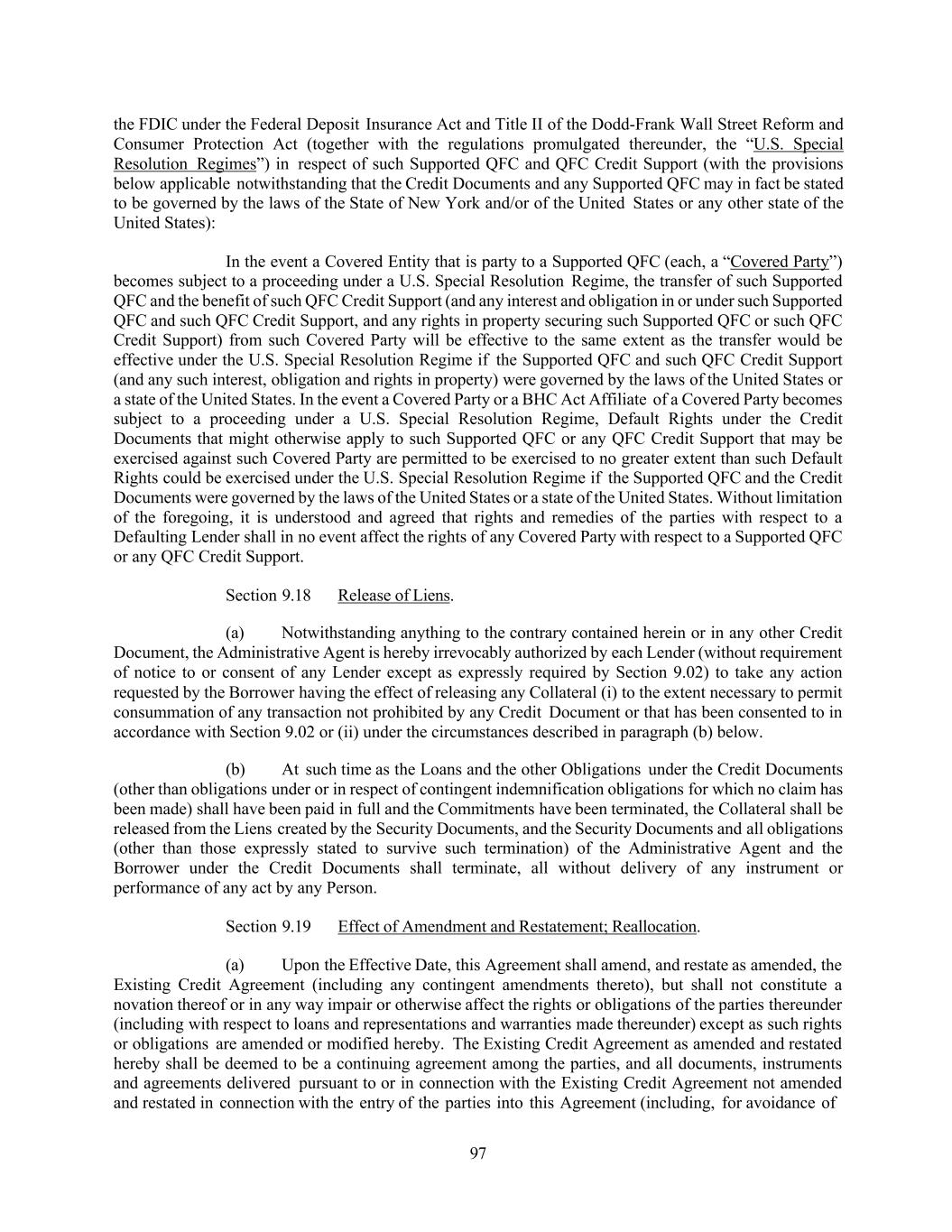 97 the FDIC under the Federal Deposit Insurance Act and Title II of the Dodd-Frank Wall Street Reform and Consumer Protection Act (together with the regulations promulgated thereunder, the “U.S. Special Resolution Regimes”) in respect of such Supported QFC and QFC Credit Support (with the provisions below applicable notwithstanding that the Credit Documents and any Supported QFC may in fact be stated to be governed by the laws of the State of New York and/or of the United States or any other state of the United States): In the event a Covered Entity that is party to a Supported QFC (each, a “Covered Party”) becomes subject to a proceeding under a U.S. Special Resolution Regime, the transfer of such Supported QFC and the benefit of such QFC Credit Support (and any interest and obligation in or under such Supported QFC and such QFC Credit Support, and any rights in property securing such Supported QFC or such QFC Credit Support) from such Covered Party will be effective to the same extent as the transfer would be effective under the U.S. Special Resolution Regime if the Supported QFC and such QFC Credit Support (and any such interest, obligation and rights in property) were governed by the laws of the United States or a state of the United States. In the event a Covered Party or a BHC Act Affiliate of a Covered Party becomes subject to a proceeding under a U.S. Special Resolution Regime, Default Rights under the Credit Documents that might otherwise apply to such Supported QFC or any QFC Credit Support that may be exercised against such Covered Party are permitted to be exercised to no greater extent than such Default Rights could be exercised under the U.S. Special Resolution Regime if the Supported QFC and the Credit Documents were governed by the laws of the United States or a state of the United States. Without limitation of the foregoing, it is understood and agreed that rights and remedies of the parties with respect to a Defaulting Lender shall in no event affect the rights of any Covered Party with respect to a Supported QFC or any QFC Credit Support. Section 9.18 Release of Liens. (a) Notwithstanding anything to the contrary contained herein or in any other Credit Document, the Administrative Agent is hereby irrevocably authorized by each Lender (without requirement of notice to or consent of any Lender except as expressly required by Section 9.02) to take any action requested by the Borrower having the effect of releasing any Collateral (i) to the extent necessary to permit consummation of any transaction not prohibited by any Credit Document or that has been consented to in accordance with Section 9.02 or (ii) under the circumstances described in paragraph (b) below. (b) At such time as the Loans and the other Obligations under the Credit Documents (other than obligations under or in respect of contingent indemnification obligations for which no claim has been made) shall have been paid in full and the Commitments have been terminated, the Collateral shall be released from the Liens created by the Security Documents, and the Security Documents and all obligations (other than those expressly stated to survive such termination) of the Administrative Agent and the Borrower under the Credit Documents shall terminate, all without delivery of any instrument or performance of any act by any Person. Section 9.19 Effect of Amendment and Restatement; Reallocation. (a) Upon the Effective Date, this Agreement shall amend, and restate as amended, the Existing Credit Agreement (including any contingent amendments thereto), but shall not constitute a novation thereof or in any way impair or otherwise affect the rights or obligations of the parties thereunder (including with respect to loans and representations and warranties made thereunder) except as such rights or obligations are amended or modified hereby. The Existing Credit Agreement as amended and restated hereby shall be deemed to be a continuing agreement among the parties, and all documents, instruments and agreements delivered pursuant to or in connection with the Existing Credit Agreement not amended and restated in connection with the entry of the parties into this Agreement (including, for avoidance of