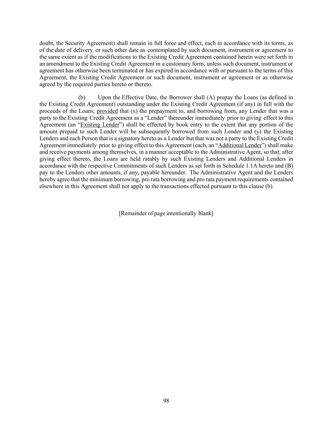98 doubt, the Security Agreement) shall remain in full force and effect, each in accordance with its terms, as of the date of delivery or such other date as contemplated by such document, instrument or agreement to the same extent as if the modifications to the Existing Credit Agreement contained herein were set forth in an amendment to the Existing Credit Agreement in a customary form, unless such document, instrument or agreement has otherwise been terminated or has expired in accordance with or pursuant to the terms of this Agreement, the Existing Credit Agreement or such document, instrument or agreement or as otherwise agreed by the required parties hereto or thereto. (b) Upon the Effective Date, the Borrower shall (A) prepay the Loans (as defined in the Existing Credit Agreement) outstanding under the Existing Credit Agreement (if any) in full with the proceeds of the Loans; provided that (x) the prepayment to, and borrowing from, any Lender that was a party to the Existing Credit Agreement as a “Lender” thereunder immediately prior to giving effect to this Agreement (an “Existing Lender”) shall be effected by book entry to the extent that any portion of the amount prepaid to such Lender will be subsequently borrowed from such Lender and (y) the Existing Lenders and each Person that is a signatory hereto as a Lender but that was not a party to the Existing Credit Agreement immediately prior to giving effect to this Agreement (each, an “Additional Lender”) shall make and receive payments among themselves, in a manner acceptable to the Administrative Agent, so that, after giving effect thereto, the Loans are held ratably by such Existing Lenders and Additional Lenders in accordance with the respective Commitments of such Lenders as set forth in Schedule 1.1A hereto and (B) pay to the Lenders other amounts, if any, payable hereunder. The Administrative Agent and the Lenders hereby agree that the minimum borrowing, pro rata borrowing and pro rata payment requirements contained elsewhere in this Agreement shall not apply to the transactions effected pursuant to this clause (b). [Remainder of page intentionally blank]