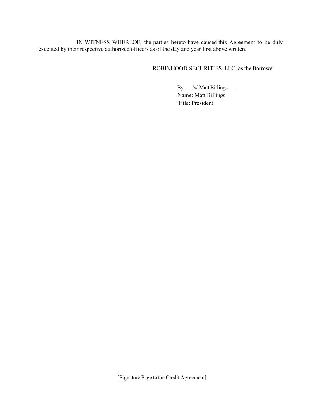 [Signature Page to the Credit Agreement] IN WITNESS WHEREOF, the parties hereto have caused this Agreement to be duly executed by their respective authorized officers as of the day and year first above written. ROBINHOOD SECURITIES, LLC, as the Borrower By: /s/ Matt Billings Name: Matt Billings Title: President
