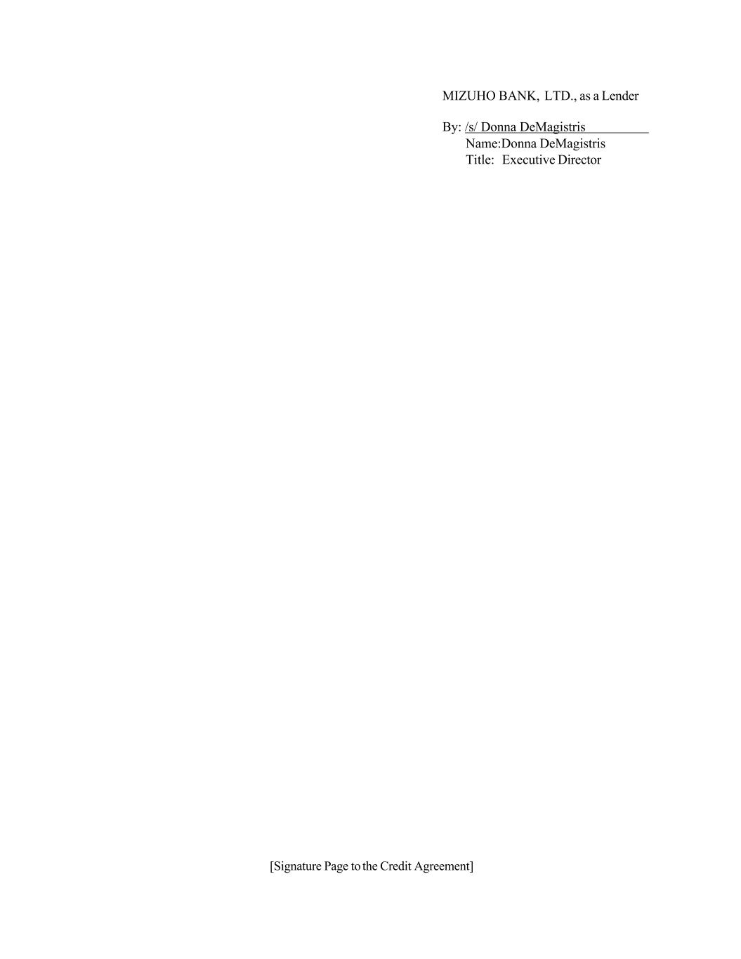 [Signature Page to the Credit Agreement] MIZUHO BANK, LTD., as a Lender By: /s/ Donna DeMagistris Name:Donna DeMagistris Title: Executive Director