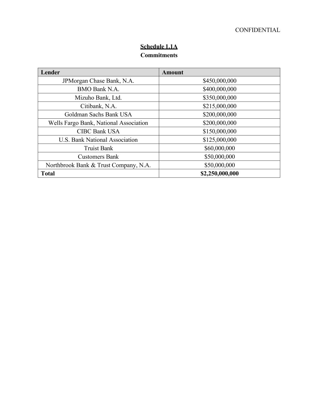 CONFIDENTIAL Schedule 1.1A Commitments Lender Amount JPMorgan Chase Bank, N.A. $450,000,000 BMO Bank N.A. $400,000,000 Mizuho Bank, Ltd. $350,000,000 Citibank, N.A. $215,000,000 Goldman Sachs Bank USA $200,000,000 Wells Fargo Bank, National Association $200,000,000 CIBC Bank USA $150,000,000 U.S. Bank National Association $125,000,000 Truist Bank $60,000,000 Customers Bank $50,000,000 Northbrook Bank & Trust Company, N.A. $50,000,000 Total $2,250,000,000