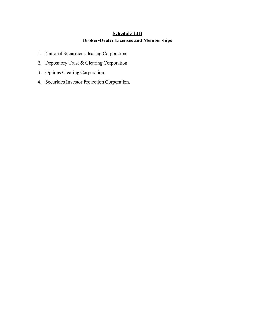 Schedule 1.1B Broker-Dealer Licenses and Memberships 1. National Securities Clearing Corporation. 2. Depository Trust & Clearing Corporation. 3. Options Clearing Corporation. 4. Securities Investor Protection Corporation.