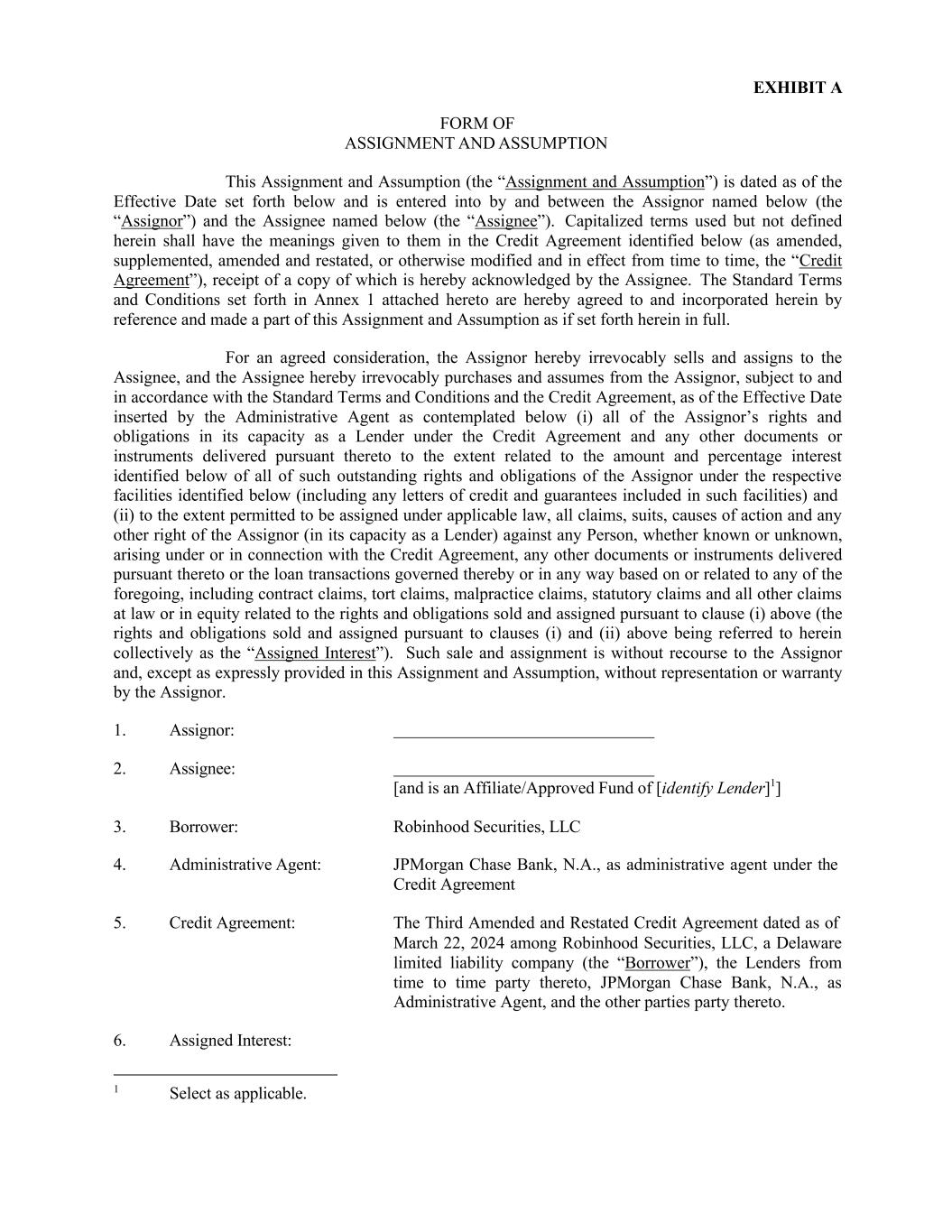 1 Select as applicable. EXHIBIT A FORM OF ASSIGNMENT AND ASSUMPTION This Assignment and Assumption (the “Assignment and Assumption”) is dated as of the Effective Date set forth below and is entered into by and between the Assignor named below (the “Assignor”) and the Assignee named below (the “Assignee”). Capitalized terms used but not defined herein shall have the meanings given to them in the Credit Agreement identified below (as amended, supplemented, amended and restated, or otherwise modified and in effect from time to time, the “Credit Agreement”), receipt of a copy of which is hereby acknowledged by the Assignee. The Standard Terms and Conditions set forth in Annex 1 attached hereto are hereby agreed to and incorporated herein by reference and made a part of this Assignment and Assumption as if set forth herein in full. For an agreed consideration, the Assignor hereby irrevocably sells and assigns to the Assignee, and the Assignee hereby irrevocably purchases and assumes from the Assignor, subject to and in accordance with the Standard Terms and Conditions and the Credit Agreement, as of the Effective Date inserted by the Administrative Agent as contemplated below (i) all of the Assignor’s rights and obligations in its capacity as a Lender under the Credit Agreement and any other documents or instruments delivered pursuant thereto to the extent related to the amount and percentage interest identified below of all of such outstanding rights and obligations of the Assignor under the respective facilities identified below (including any letters of credit and guarantees included in such facilities) and (ii) to the extent permitted to be assigned under applicable law, all claims, suits, causes of action and any other right of the Assignor (in its capacity as a Lender) against any Person, whether known or unknown, arising under or in connection with the Credit Agreement, any other documents or instruments delivered pursuant thereto or the loan transactions governed thereby or in any way based on or related to any of the foregoing, including contract claims, tort claims, malpractice claims, statutory claims and all other claims at law or in equity related to the rights and obligations sold and assigned pursuant to clause (i) above (the rights and obligations sold and assigned pursuant to clauses (i) and (ii) above being referred to herein collectively as the “Assigned Interest”). Such sale and assignment is without recourse to the Assignor and, except as expressly provided in this Assignment and Assumption, without representation or warranty by the Assignor. 1. Assignor: 2. Assignee: [and is an Affiliate/Approved Fund of [identify Lender]1] 3. Borrower: Robinhood Securities, LLC 4. Administrative Agent: JPMorgan Chase Bank, N.A., as administrative agent under the Credit Agreement 5. Credit Agreement: The Third Amended and Restated Credit Agreement dated as of March 22, 2024 among Robinhood Securities, LLC, a Delaware limited liability company (the “Borrower”), the Lenders from time to time party thereto, JPMorgan Chase Bank, N.A., as Administrative Agent, and the other parties party thereto. 6. Assigned Interest: