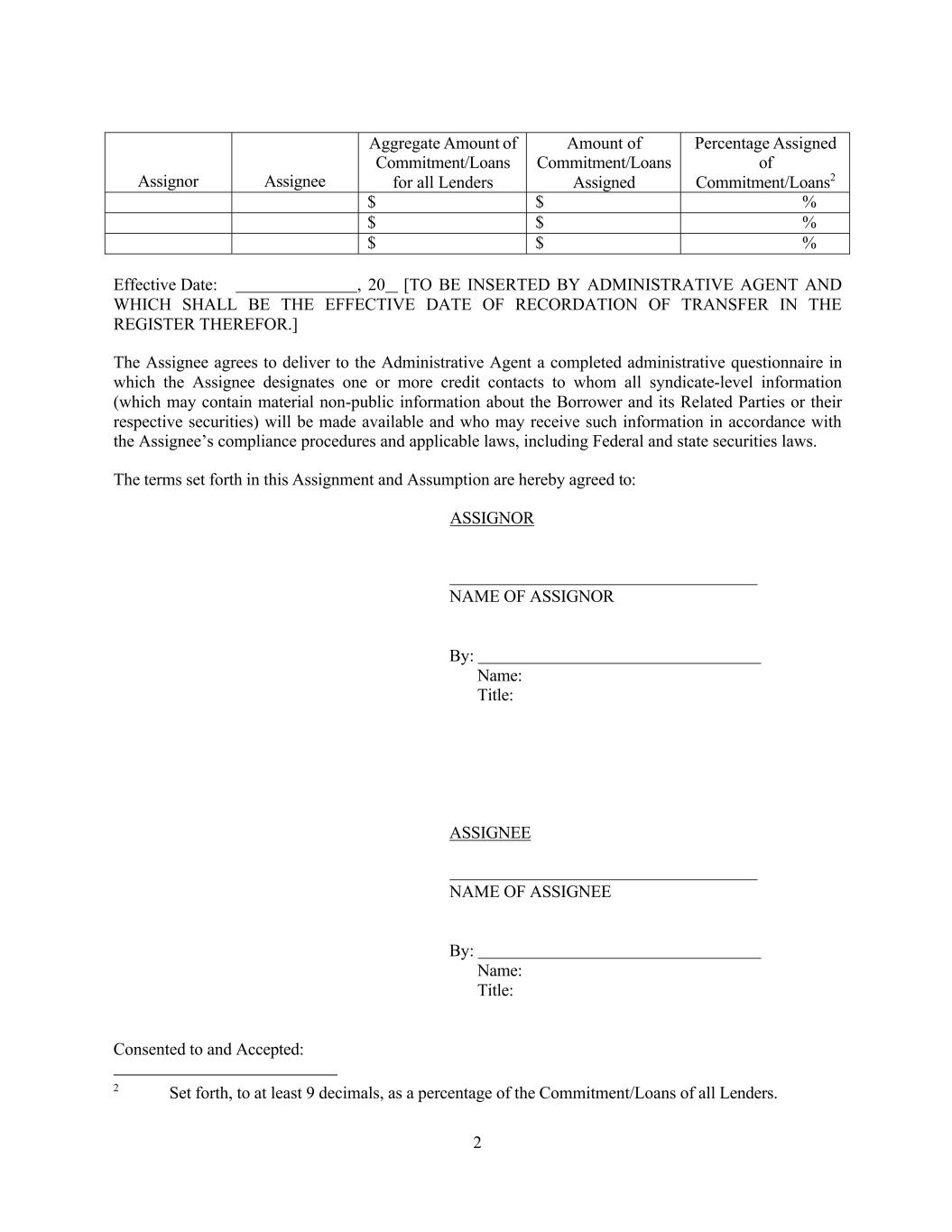 2 Assignor Assignee Aggregate Amount of Commitment/Loans for all Lenders Amount of Commitment/Loans Assigned Percentage Assigned of Commitment/Loans2 $ $ % $ $ % $ $ % Effective Date: , 20 [TO BE INSERTED BY ADMINISTRATIVE AGENT AND WHICH SHALL BE THE EFFECTIVE DATE OF RECORDATION OF TRANSFER IN THE REGISTER THEREFOR.] The Assignee agrees to deliver to the Administrative Agent a completed administrative questionnaire in which the Assignee designates one or more credit contacts to whom all syndicate-level information (which may contain material non-public information about the Borrower and its Related Parties or their respective securities) will be made available and who may receive such information in accordance with the Assignee’s compliance procedures and applicable laws, including Federal and state securities laws. The terms set forth in this Assignment and Assumption are hereby agreed to: ASSIGNOR NAME OF ASSIGNOR By: Name: Title: ASSIGNEE NAME OF ASSIGNEE By: Name: Title: Consented to and Accepted: 2 Set forth, to at least 9 decimals, as a percentage of the Commitment/Loans of all Lenders.