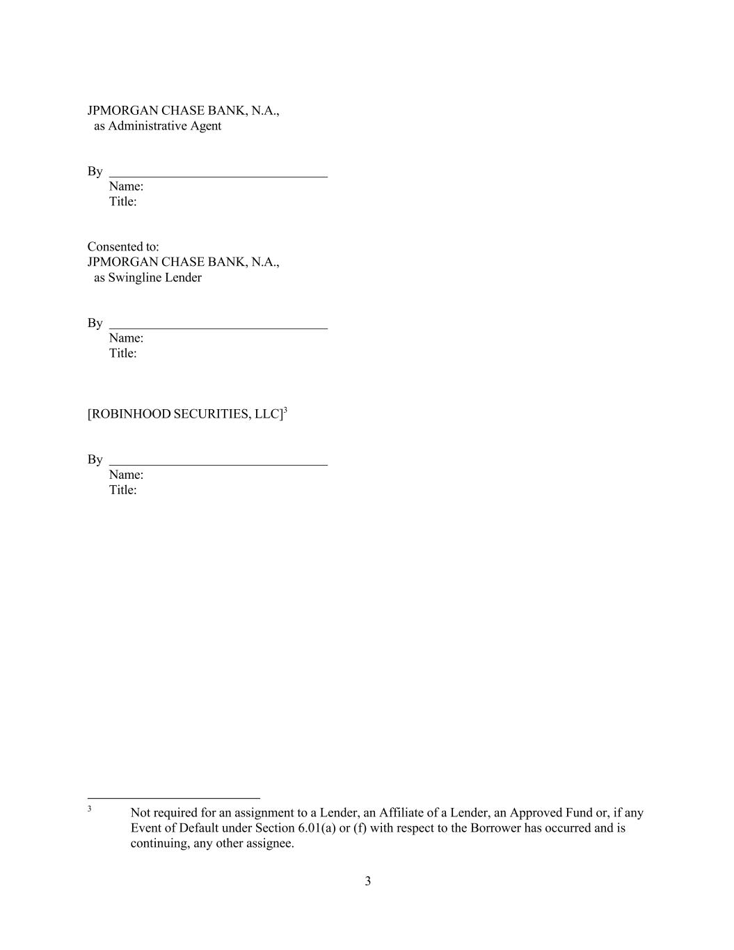 3 JPMORGAN CHASE BANK, N.A., as Administrative Agent By Name: Title: Consented to: JPMORGAN CHASE BANK, N.A., as Swingline Lender By Name: Title: [ROBINHOOD SECURITIES, LLC]3 By Name: Title: 3 Not required for an assignment to a Lender, an Affiliate of a Lender, an Approved Fund or, if any Event of Default under Section 6.01(a) or (f) with respect to the Borrower has occurred and is continuing, any other assignee.