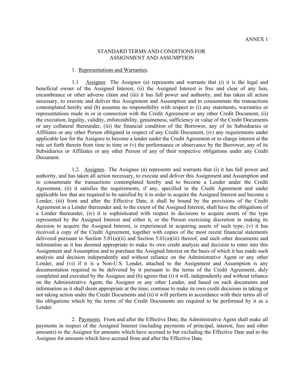 ANNEX 1 STANDARD TERMS AND CONDITIONS FOR ASSIGNMENT AND ASSUMPTION 1. Representations and Warranties. 1.1 Assignor. The Assignor (a) represents and warrants that (i) it is the legal and beneficial owner of the Assigned Interest, (ii) the Assigned Interest is free and clear of any lien, encumbrance or other adverse claim and (iii) it has full power and authority, and has taken all action necessary, to execute and deliver this Assignment and Assumption and to consummate the transactions contemplated hereby and (b) assumes no responsibility with respect to (i) any statements, warranties or representations made in or in connection with the Credit Agreement or any other Credit Document, (ii) the execution, legality, validity, enforceability, genuineness, sufficiency or value of the Credit Documents or any collateral thereunder, (iii) the financial condition of the Borrower, any of its Subsidiaries or Affiliates or any other Person obligated in respect of any Credit Document, (iv) any requirements under applicable law for the Assignee to become a lender under the Credit Agreement or to charge interest at the rate set forth therein from time to time or (v) the performance or observance by the Borrower, any of its Subsidiaries or Affiliates or any other Person of any of their respective obligations under any Credit Document. 1.2. Assignee. The Assignee (a) represents and warrants that (i) it has full power and authority, and has taken all action necessary, to execute and deliver this Assignment and Assumption and to consummate the transactions contemplated hereby and to become a Lender under the Credit Agreement, (ii) it satisfies the requirements, if any, specified in the Credit Agreement and under applicable law that are required to be satisfied by it in order to acquire the Assigned Interest and become a Lender, (iii) from and after the Effective Date, it shall be bound by the provisions of the Credit Agreement as a Lender thereunder and, to the extent of the Assigned Interest, shall have the obligations of a Lender thereunder, (iv) it is sophisticated with respect to decisions to acquire assets of the type represented by the Assigned Interest and either it, or the Person exercising discretion in making its decision to acquire the Assigned Interest, is experienced in acquiring assets of such type, (v) it has received a copy of the Credit Agreement, together with copies of the most recent financial statements delivered pursuant to Section 5.01(a)(ii) and Section 5.01(a)(iii) thereof, and such other documents and information as it has deemed appropriate to make its own credit analysis and decision to enter into this Assignment and Assumption and to purchase the Assigned Interest on the basis of which it has made such analysis and decision independently and without reliance on the Administrative Agent or any other Lender, and (vi) if it is a Non-U.S. Lender, attached to the Assignment and Assumption is any documentation required to be delivered by it pursuant to the terms of the Credit Agreement, duly completed and executed by the Assignee and (b) agrees that (i) it will, independently and without reliance on the Administrative Agent, the Assignor or any other Lender, and based on such documents and information as it shall deem appropriate at the time, continue to make its own credit decisions in taking or not taking action under the Credit Documents and (ii) it will perform in accordance with their terms all of the obligations which by the terms of the Credit Documents are required to be performed by it as a Lender. 2. Payments. From and after the Effective Date, the Administrative Agent shall make all payments in respect of the Assigned Interest (including payments of principal, interest, fees and other amounts) to the Assignor for amounts which have accrued to but excluding the Effective Date and to the Assignee for amounts which have accrued from and after the Effective Date.