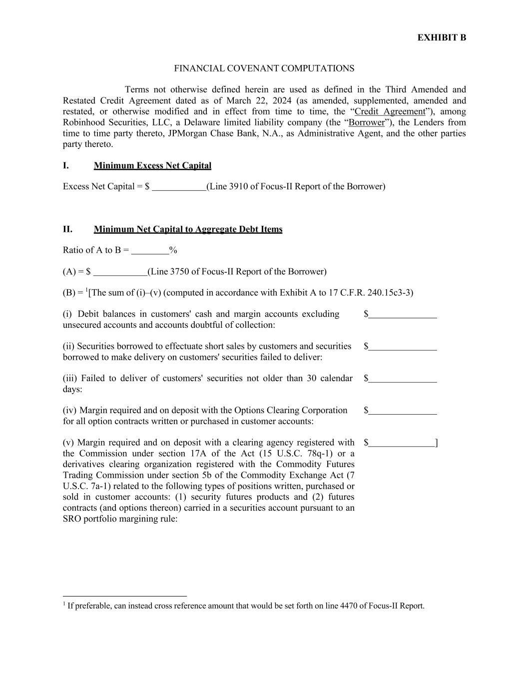 EXHIBIT B FINANCIAL COVENANT COMPUTATIONS Terms not otherwise defined herein are used as defined in the Third Amended and Restated Credit Agreement dated as of March 22, 2024 (as amended, supplemented, amended and restated, or otherwise modified and in effect from time to time, the “Credit Agreement”), among Robinhood Securities, LLC, a Delaware limited liability company (the “Borrower”), the Lenders from time to time party thereto, JPMorgan Chase Bank, N.A., as Administrative Agent, and the other parties party thereto. I. Minimum Excess Net Capital Excess Net Capital = $ (Line 3910 of Focus-II Report of the Borrower) II. Minimum Net Capital to Aggregate Debt Items Ratio of A to B = % (A) = $ (Line 3750 of Focus-II Report of the Borrower) (B) = 1[The sum of (i)–(v) (computed in accordance with Exhibit A to 17 C.F.R. 240.15c3-3) (i) Debit balances in customers' cash and margin accounts excluding $ unsecured accounts and accounts doubtful of collection: (ii) Securities borrowed to effectuate short sales by customers and securities $ borrowed to make delivery on customers' securities failed to deliver: (iii) Failed to deliver of customers' securities not older than 30 calendar $ days: (iv) Margin required and on deposit with the Options Clearing Corporation $ for all option contracts written or purchased in customer accounts: (v) Margin required and on deposit with a clearing agency registered with the Commission under section 17A of the Act (15 U.S.C. 78q-1) or a derivatives clearing organization registered with the Commodity Futures Trading Commission under section 5b of the Commodity Exchange Act (7 U.S.C. 7a-1) related to the following types of positions written, purchased or sold in customer accounts: (1) security futures products and (2) futures contracts (and options thereon) carried in a securities account pursuant to an SRO portfolio margining rule: $ ] 1 If preferable, can instead cross reference amount that would be set forth on line 4470 of Focus-II Report.