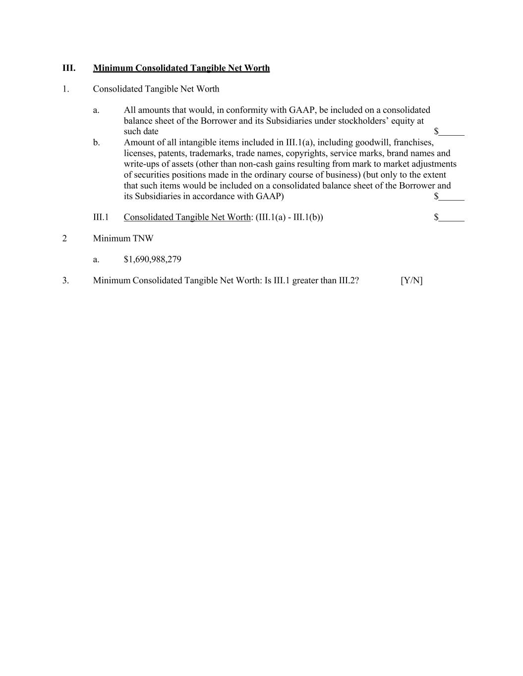 III. Minimum Consolidated Tangible Net Worth 1. Consolidated Tangible Net Worth a. All amounts that would, in conformity with GAAP, be included on a consolidated balance sheet of the Borrower and its Subsidiaries under stockholders’ equity at such date $ b. Amount of all intangible items included in III.1(a), including goodwill, franchises, licenses, patents, trademarks, trade names, copyrights, service marks, brand names and write-ups of assets (other than non-cash gains resulting from mark to market adjustments of securities positions made in the ordinary course of business) (but only to the extent that such items would be included on a consolidated balance sheet of the Borrower and its Subsidiaries in accordance with GAAP) $ III.1 Consolidated Tangible Net Worth: (III.1(a) - III.1(b)) $ 2 Minimum TNW a. $1,690,988,279 3. Minimum Consolidated Tangible Net Worth: Is III.1 greater than III.2? [Y/N]