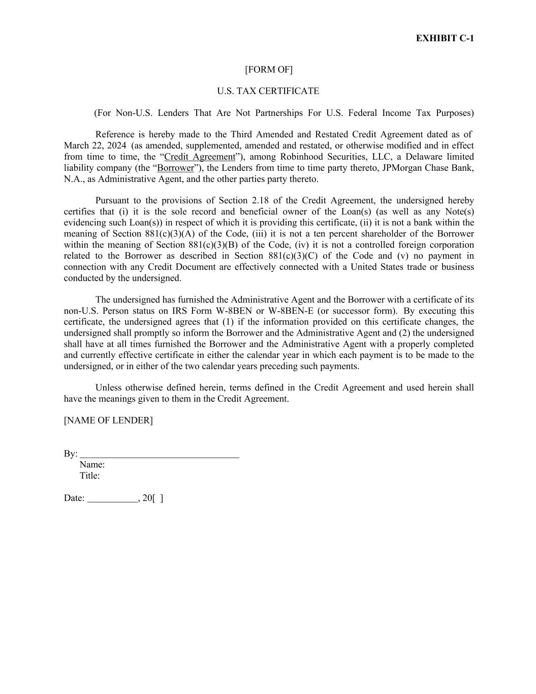 EXHIBIT C-1 [FORM OF] U.S. TAX CERTIFICATE (For Non-U.S. Lenders That Are Not Partnerships For U.S. Federal Income Tax Purposes) Reference is hereby made to the Third Amended and Restated Credit Agreement dated as of March 22, 2024 (as amended, supplemented, amended and restated, or otherwise modified and in effect from time to time, the “Credit Agreement”), among Robinhood Securities, LLC, a Delaware limited liability company (the “Borrower”), the Lenders from time to time party thereto, JPMorgan Chase Bank, N.A., as Administrative Agent, and the other parties party thereto. Pursuant to the provisions of Section 2.18 of the Credit Agreement, the undersigned hereby certifies that (i) it is the sole record and beneficial owner of the Loan(s) (as well as any Note(s) evidencing such Loan(s)) in respect of which it is providing this certificate, (ii) it is not a bank within the meaning of Section 881(c)(3)(A) of the Code, (iii) it is not a ten percent shareholder of the Borrower within the meaning of Section 881(c)(3)(B) of the Code, (iv) it is not a controlled foreign corporation related to the Borrower as described in Section 881(c)(3)(C) of the Code and (v) no payment in connection with any Credit Document are effectively connected with a United States trade or business conducted by the undersigned. The undersigned has furnished the Administrative Agent and the Borrower with a certificate of its non-U.S. Person status on IRS Form W-8BEN or W-8BEN-E (or successor form). By executing this certificate, the undersigned agrees that (1) if the information provided on this certificate changes, the undersigned shall promptly so inform the Borrower and the Administrative Agent and (2) the undersigned shall have at all times furnished the Borrower and the Administrative Agent with a properly completed and currently effective certificate in either the calendar year in which each payment is to be made to the undersigned, or in either of the two calendar years preceding such payments. Unless otherwise defined herein, terms defined in the Credit Agreement and used herein shall have the meanings given to them in the Credit Agreement. [NAME OF LENDER] By: Name: Title: Date: , 20[ ]