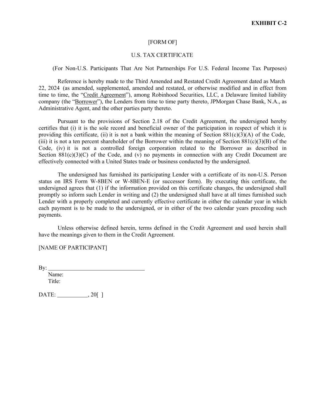 EXHIBIT C-2 [FORM OF] U.S. TAX CERTIFICATE (For Non-U.S. Participants That Are Not Partnerships For U.S. Federal Income Tax Purposes) Reference is hereby made to the Third Amended and Restated Credit Agreement dated as March 22, 2024 (as amended, supplemented, amended and restated, or otherwise modified and in effect from time to time, the “Credit Agreement”), among Robinhood Securities, LLC, a Delaware limited liability company (the “Borrower”), the Lenders from time to time party thereto, JPMorgan Chase Bank, N.A., as Administrative Agent, and the other parties party thereto. Pursuant to the provisions of Section 2.18 of the Credit Agreement, the undersigned hereby certifies that (i) it is the sole record and beneficial owner of the participation in respect of which it is providing this certificate, (ii) it is not a bank within the meaning of Section 881(c)(3)(A) of the Code, (iii) it is not a ten percent shareholder of the Borrower within the meaning of Section 881(c)(3)(B) of the Code, (iv) it is not a controlled foreign corporation related to the Borrower as described in Section 881(c)(3)(C) of the Code, and (v) no payments in connection with any Credit Document are effectively connected with a United States trade or business conducted by the undersigned. The undersigned has furnished its participating Lender with a certificate of its non-U.S. Person status on IRS Form W-8BEN or W-8BEN-E (or successor form). By executing this certificate, the undersigned agrees that (1) if the information provided on this certificate changes, the undersigned shall promptly so inform such Lender in writing and (2) the undersigned shall have at all times furnished such Lender with a properly completed and currently effective certificate in either the calendar year in which each payment is to be made to the undersigned, or in either of the two calendar years preceding such payments. Unless otherwise defined herein, terms defined in the Credit Agreement and used herein shall have the meanings given to them in the Credit Agreement. [NAME OF PARTICIPANT] By: Name: Title: DATE: , 20[ ]