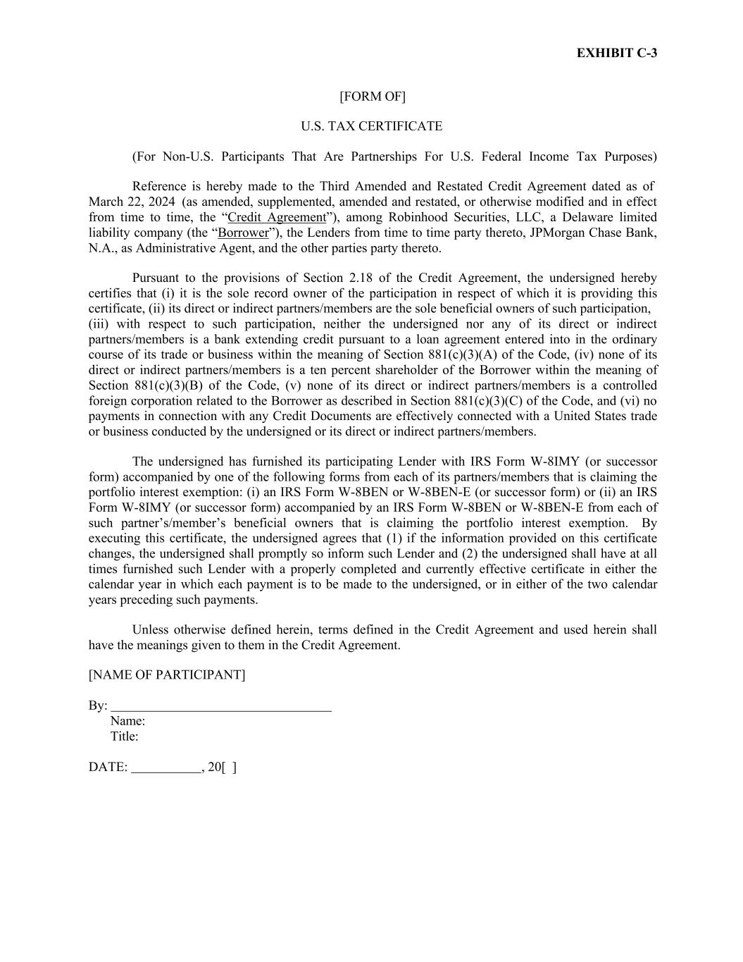 EXHIBIT C-3 [FORM OF] U.S. TAX CERTIFICATE (For Non-U.S. Participants That Are Partnerships For U.S. Federal Income Tax Purposes) Reference is hereby made to the Third Amended and Restated Credit Agreement dated as of March 22, 2024 (as amended, supplemented, amended and restated, or otherwise modified and in effect from time to time, the “Credit Agreement”), among Robinhood Securities, LLC, a Delaware limited liability company (the “Borrower”), the Lenders from time to time party thereto, JPMorgan Chase Bank, N.A., as Administrative Agent, and the other parties party thereto. Pursuant to the provisions of Section 2.18 of the Credit Agreement, the undersigned hereby certifies that (i) it is the sole record owner of the participation in respect of which it is providing this certificate, (ii) its direct or indirect partners/members are the sole beneficial owners of such participation, (iii) with respect to such participation, neither the undersigned nor any of its direct or indirect partners/members is a bank extending credit pursuant to a loan agreement entered into in the ordinary course of its trade or business within the meaning of Section 881(c)(3)(A) of the Code, (iv) none of its direct or indirect partners/members is a ten percent shareholder of the Borrower within the meaning of Section 881(c)(3)(B) of the Code, (v) none of its direct or indirect partners/members is a controlled foreign corporation related to the Borrower as described in Section 881(c)(3)(C) of the Code, and (vi) no payments in connection with any Credit Documents are effectively connected with a United States trade or business conducted by the undersigned or its direct or indirect partners/members. The undersigned has furnished its participating Lender with IRS Form W-8IMY (or successor form) accompanied by one of the following forms from each of its partners/members that is claiming the portfolio interest exemption: (i) an IRS Form W-8BEN or W-8BEN-E (or successor form) or (ii) an IRS Form W-8IMY (or successor form) accompanied by an IRS Form W-8BEN or W-8BEN-E from each of such partner’s/member’s beneficial owners that is claiming the portfolio interest exemption. By executing this certificate, the undersigned agrees that (1) if the information provided on this certificate changes, the undersigned shall promptly so inform such Lender and (2) the undersigned shall have at all times furnished such Lender with a properly completed and currently effective certificate in either the calendar year in which each payment is to be made to the undersigned, or in either of the two calendar years preceding such payments. Unless otherwise defined herein, terms defined in the Credit Agreement and used herein shall have the meanings given to them in the Credit Agreement. [NAME OF PARTICIPANT] By: Name: Title: DATE: , 20[ ]