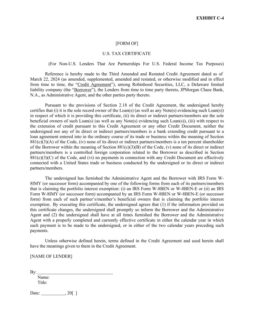 EXHIBIT C-4 [FORM OF] U.S. TAX CERTIFICATE (For Non-U.S. Lenders That Are Partnerships For U.S. Federal Income Tax Purposes) Reference is hereby made to the Third Amended and Restated Credit Agreement dated as of March 22, 2024 (as amended, supplemented, amended and restated, or otherwise modified and in effect from time to time, the “Credit Agreement”), among Robinhood Securities, LLC, a Delaware limited liability company (the “Borrower”), the Lenders from time to time party thereto, JPMorgan Chase Bank, N.A., as Administrative Agent, and the other parties party thereto. Pursuant to the provisions of Section 2.18 of the Credit Agreement, the undersigned hereby certifies that (i) it is the sole record owner of the Loan(s) (as well as any Note(s) evidencing such Loan(s)) in respect of which it is providing this certificate, (ii) its direct or indirect partners/members are the sole beneficial owners of such Loan(s) (as well as any Note(s) evidencing such Loan(s)), (iii) with respect to the extension of credit pursuant to this Credit Agreement or any other Credit Document, neither the undersigned nor any of its direct or indirect partners/members is a bank extending credit pursuant to a loan agreement entered into in the ordinary course of its trade or business within the meaning of Section 881(c)(3)(A) of the Code, (iv) none of its direct or indirect partners/members is a ten percent shareholder of the Borrower within the meaning of Section 881(c)(3)(B) of the Code, (v) none of its direct or indirect partners/members is a controlled foreign corporation related to the Borrower as described in Section 881(c)(3)(C) of the Code, and (vi) no payments in connection with any Credit Document are effectively connected with a United States trade or business conducted by the undersigned or its direct or indirect partners/members. The undersigned has furnished the Administrative Agent and the Borrower with IRS Form W- 8IMY (or successor form) accompanied by one of the following forms from each of its partners/members that is claiming the portfolio interest exemption: (i) an IRS Form W-8BEN or W-8BEN-E or (ii) an IRS Form W-8IMY (or successor form) accompanied by an IRS Form W-8BEN or W-8BEN-E (or successor form) from each of such partner’s/member’s beneficial owners that is claiming the portfolio interest exemption. By executing this certificate, the undersigned agrees that (1) if the information provided on this certificate changes, the undersigned shall promptly so inform the Borrower and the Administrative Agent and (2) the undersigned shall have at all times furnished the Borrower and the Administrative Agent with a properly completed and currently effective certificate in either the calendar year in which each payment is to be made to the undersigned, or in either of the two calendar years preceding such payments. Unless otherwise defined herein, terms defined in the Credit Agreement and used herein shall have the meanings given to them in the Credit Agreement. [NAME OF LENDER] By: Name: Title: Date: , 20[ ]