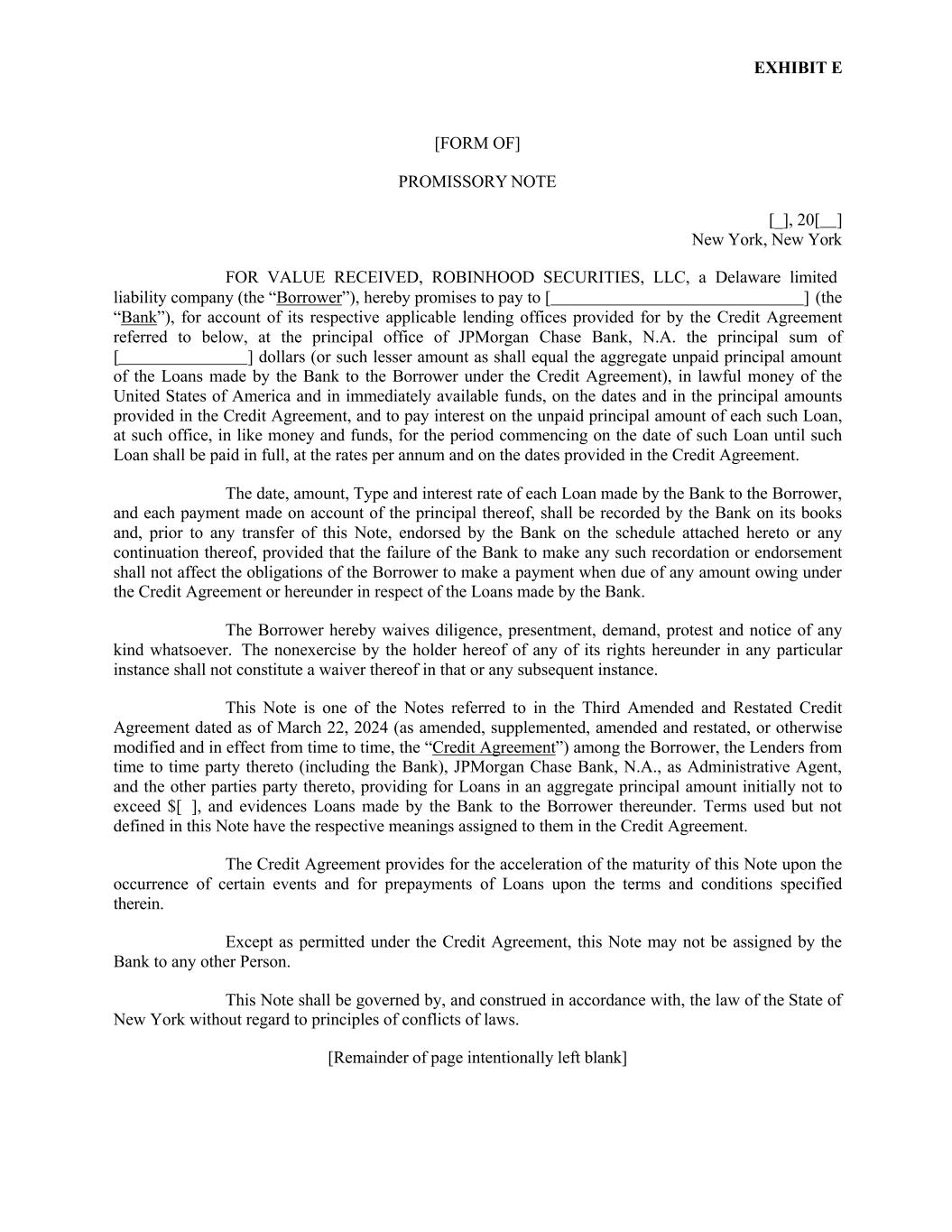 EXHIBIT E [FORM OF] PROMISSORY NOTE [_], 20[ ] New York, New York FOR VALUE RECEIVED, ROBINHOOD SECURITIES, LLC, a Delaware limited liability company (the “Borrower”), hereby promises to pay to [ ] (the “Bank”), for account of its respective applicable lending offices provided for by the Credit Agreement referred to below, at the principal office of JPMorgan Chase Bank, N.A. the principal sum of [ ] dollars (or such lesser amount as shall equal the aggregate unpaid principal amount of the Loans made by the Bank to the Borrower under the Credit Agreement), in lawful money of the United States of America and in immediately available funds, on the dates and in the principal amounts provided in the Credit Agreement, and to pay interest on the unpaid principal amount of each such Loan, at such office, in like money and funds, for the period commencing on the date of such Loan until such Loan shall be paid in full, at the rates per annum and on the dates provided in the Credit Agreement. The date, amount, Type and interest rate of each Loan made by the Bank to the Borrower, and each payment made on account of the principal thereof, shall be recorded by the Bank on its books and, prior to any transfer of this Note, endorsed by the Bank on the schedule attached hereto or any continuation thereof, provided that the failure of the Bank to make any such recordation or endorsement shall not affect the obligations of the Borrower to make a payment when due of any amount owing under the Credit Agreement or hereunder in respect of the Loans made by the Bank. The Borrower hereby waives diligence, presentment, demand, protest and notice of any kind whatsoever. The nonexercise by the holder hereof of any of its rights hereunder in any particular instance shall not constitute a waiver thereof in that or any subsequent instance. This Note is one of the Notes referred to in the Third Amended and Restated Credit Agreement dated as of March 22, 2024 (as amended, supplemented, amended and restated, or otherwise modified and in effect from time to time, the “Credit Agreement”) among the Borrower, the Lenders from time to time party thereto (including the Bank), JPMorgan Chase Bank, N.A., as Administrative Agent, and the other parties party thereto, providing for Loans in an aggregate principal amount initially not to exceed $[ ], and evidences Loans made by the Bank to the Borrower thereunder. Terms used but not defined in this Note have the respective meanings assigned to them in the Credit Agreement. The Credit Agreement provides for the acceleration of the maturity of this Note upon the occurrence of certain events and for prepayments of Loans upon the terms and conditions specified therein. Except as permitted under the Credit Agreement, this Note may not be assigned by the Bank to any other Person. This Note shall be governed by, and construed in accordance with, the law of the State of New York without regard to principles of conflicts of laws. [Remainder of page intentionally left blank]