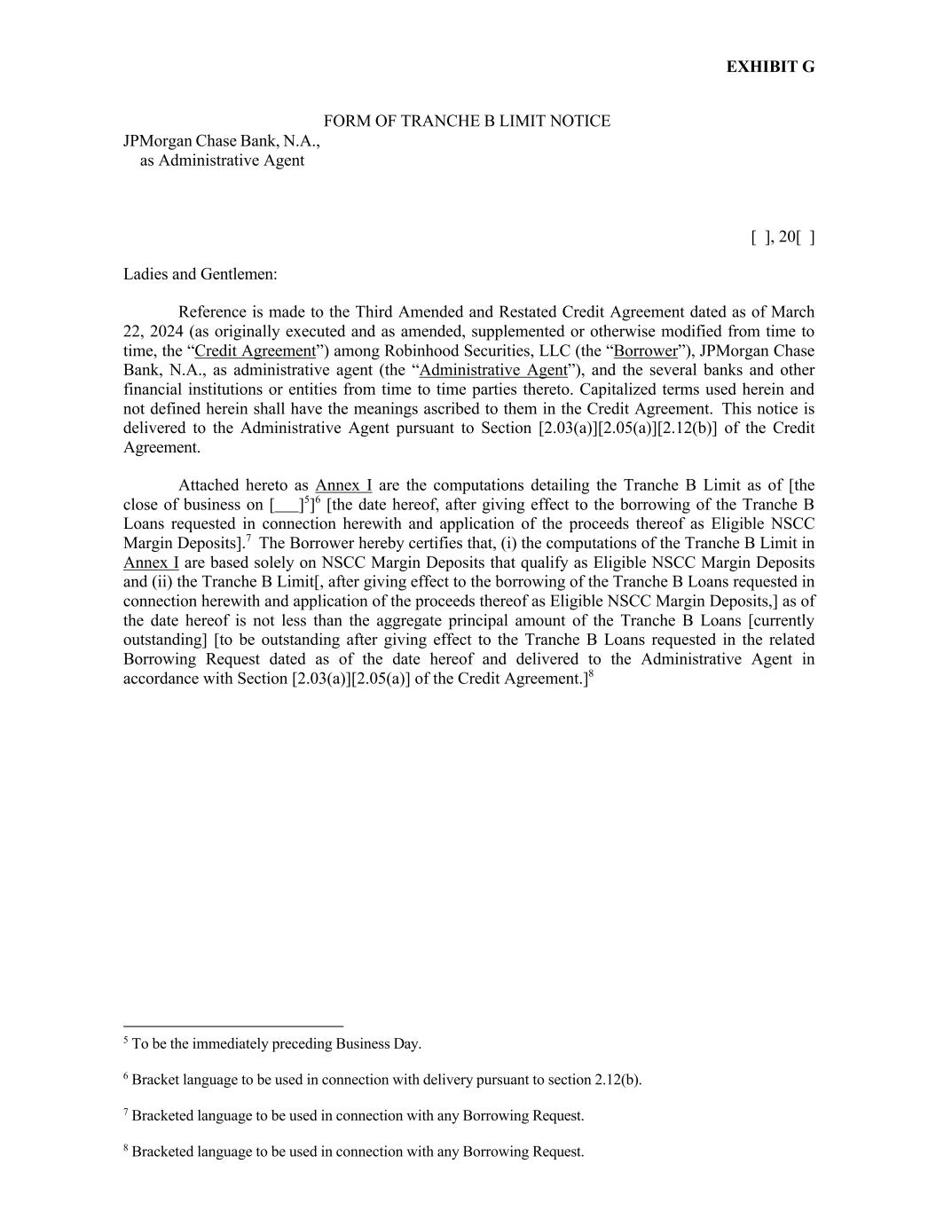 EXHIBIT G FORM OF TRANCHE B LIMIT NOTICE JPMorgan Chase Bank, N.A., as Administrative Agent [ ], 20[ ] Ladies and Gentlemen: Reference is made to the Third Amended and Restated Credit Agreement dated as of March 22, 2024 (as originally executed and as amended, supplemented or otherwise modified from time to time, the “Credit Agreement”) among Robinhood Securities, LLC (the “Borrower”), JPMorgan Chase Bank, N.A., as administrative agent (the “Administrative Agent”), and the several banks and other financial institutions or entities from time to time parties thereto. Capitalized terms used herein and not defined herein shall have the meanings ascribed to them in the Credit Agreement. This notice is delivered to the Administrative Agent pursuant to Section [2.03(a)][2.05(a)][2.12(b)] of the Credit Agreement. Attached hereto as Annex I are the computations detailing the Tranche B Limit as of [the close of business on [ ]5]6 [the date hereof, after giving effect to the borrowing of the Tranche B Loans requested in connection herewith and application of the proceeds thereof as Eligible NSCC Margin Deposits].7 The Borrower hereby certifies that, (i) the computations of the Tranche B Limit in Annex I are based solely on NSCC Margin Deposits that qualify as Eligible NSCC Margin Deposits and (ii) the Tranche B Limit[, after giving effect to the borrowing of the Tranche B Loans requested in connection herewith and application of the proceeds thereof as Eligible NSCC Margin Deposits,] as of the date hereof is not less than the aggregate principal amount of the Tranche B Loans [currently outstanding] [to be outstanding after giving effect to the Tranche B Loans requested in the related Borrowing Request dated as of the date hereof and delivered to the Administrative Agent in accordance with Section [2.03(a)][2.05(a)] of the Credit Agreement.]8 5 To be the immediately preceding Business Day. 6 Bracket language to be used in connection with delivery pursuant to section 2.12(b). 7 Bracketed language to be used in connection with any Borrowing Request. 8 Bracketed language to be used in connection with any Borrowing Request.