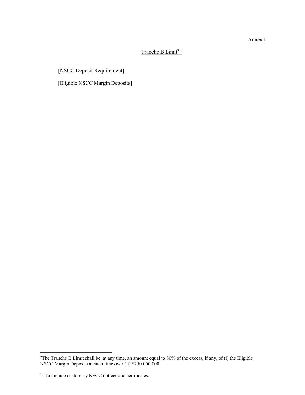 10 To include customary NSCC notices and certificates. Annex I Tranche B Limit910 [NSCC Deposit Requirement] [Eligible NSCC Margin Deposits] 9The Tranche B Limit shall be, at any time, an amount equal to 80% of the excess, if any, of (i) the Eligible NSCC Margin Deposits at such time over (ii) $250,000,000.