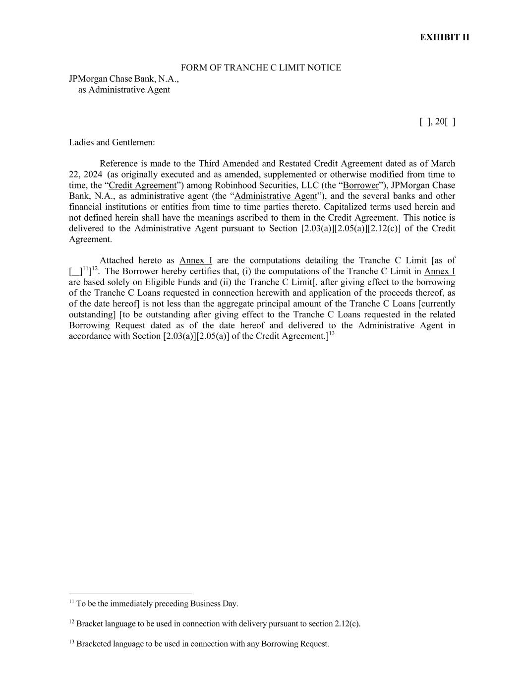 13 Bracketed language to be used in connection with any Borrowing Request. EXHIBIT H FORM OF TRANCHE C LIMIT NOTICE JPMorgan Chase Bank, N.A., as Administrative Agent [ ], 20[ ] Ladies and Gentlemen: Reference is made to the Third Amended and Restated Credit Agreement dated as of March 22, 2024 (as originally executed and as amended, supplemented or otherwise modified from time to time, the “Credit Agreement”) among Robinhood Securities, LLC (the “Borrower”), JPMorgan Chase Bank, N.A., as administrative agent (the “Administrative Agent”), and the several banks and other financial institutions or entities from time to time parties thereto. Capitalized terms used herein and not defined herein shall have the meanings ascribed to them in the Credit Agreement. This notice is delivered to the Administrative Agent pursuant to Section [2.03(a)][2.05(a)][2.12(c)] of the Credit Agreement. Attached hereto as Annex I are the computations detailing the Tranche C Limit [as of [ ]11]12. The Borrower hereby certifies that, (i) the computations of the Tranche C Limit in Annex I are based solely on Eligible Funds and (ii) the Tranche C Limit[, after giving effect to the borrowing of the Tranche C Loans requested in connection herewith and application of the proceeds thereof, as of the date hereof] is not less than the aggregate principal amount of the Tranche C Loans [currently outstanding] [to be outstanding after giving effect to the Tranche C Loans requested in the related Borrowing Request dated as of the date hereof and delivered to the Administrative Agent in accordance with Section [2.03(a)][2.05(a)] of the Credit Agreement.]13 11 To be the immediately preceding Business Day. 12 Bracket language to be used in connection with delivery pursuant to section 2.12(c).