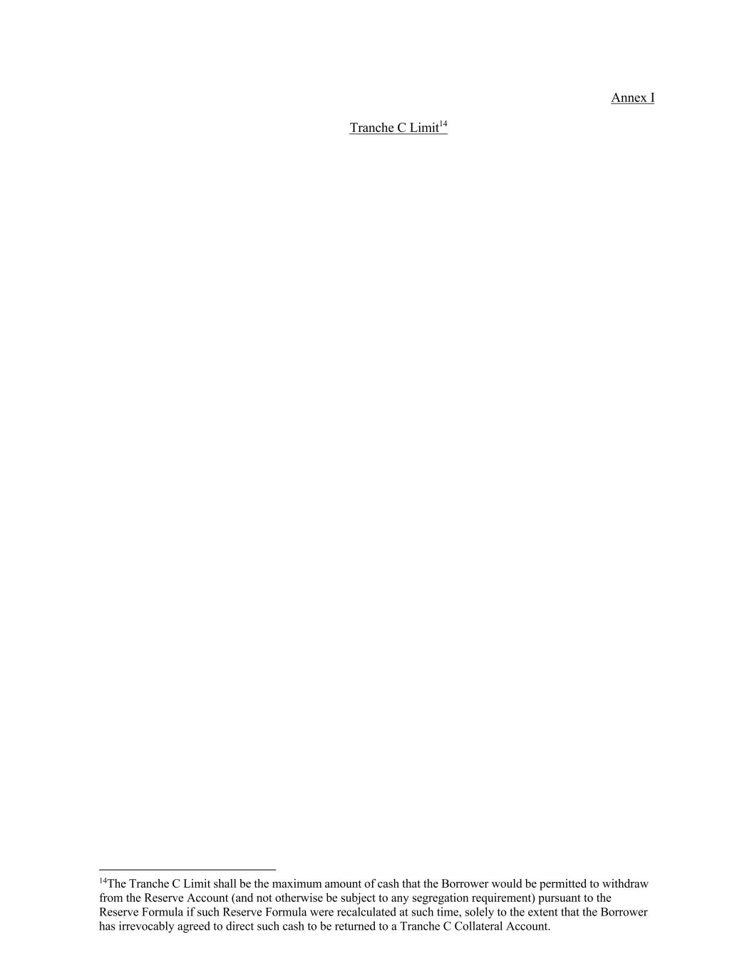 Annex I Tranche C Limit14 14The Tranche C Limit shall be the maximum amount of cash that the Borrower would be permitted to withdraw from the Reserve Account (and not otherwise be subject to any segregation requirement) pursuant to the Reserve Formula if such Reserve Formula were recalculated at such time, solely to the extent that the Borrower has irrevocably agreed to direct such cash to be returned to a Tranche C Collateral Account.