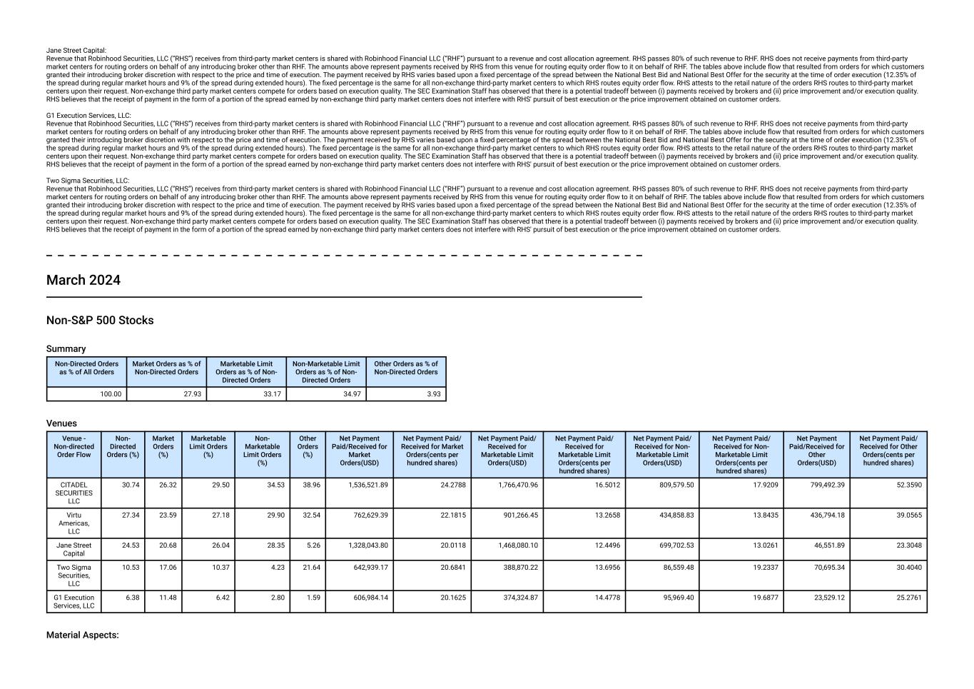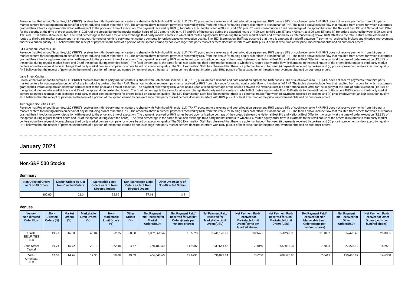 Jane Street Capital: Revenue that Robinhood Securities, LLC (“RHS”) receives from third-party market centers is shared with Robinhood Financial LLC (“RHF”) pursuant to a revenue and cost allocation agreement. RHS passes 80% of such revenue to RHF. RHS does not receive payments from third-party market centers for routing orders on behalf of any introducing broker other than RHF. The amounts above represent payments received by RHS from this venue for routing equity order flow to it on behalf of RHF. The tables above include flow that resulted from orders for which customers granted their introducing broker discretion with respect to the price and time of execution. The payment received by RHS varies based upon a fixed percentage of the spread between the National Best Bid and National Best Offer for the security at the time of order execution (12.35% of the spread during regular market hours and 9% of the spread during extended hours). The fixed percentage is the same for all non-exchange third-party market centers to which RHS routes equity order flow. RHS attests to the retail nature of the orders RHS routes to third-party market centers upon their request. Non-exchange third party market centers compete for orders based on execution quality. The SEC Examination Staff has observed that there is a potential tradeoff between (i) payments received by brokers and (ii) price improvement and/or execution quality. RHS believes that the receipt of payment in the form of a portion of the spread earned by non-exchange third party market centers does not interfere with RHS' pursuit of best execution or the price improvement obtained on customer orders. G1 Execution Services, LLC: Revenue that Robinhood Securities, LLC (“RHS”) receives from third-party market centers is shared with Robinhood Financial LLC (“RHF”) pursuant to a revenue and cost allocation agreement. RHS passes 80% of such revenue to RHF. RHS does not receive payments from third-party market centers for routing orders on behalf of any introducing broker other than RHF. The amounts above represent payments received by RHS from this venue for routing equity order flow to it on behalf of RHF. The tables above include flow that resulted from orders for which customers granted their introducing broker discretion with respect to the price and time of execution. The payment received by RHS varies based upon a fixed percentage of the spread between the National Best Bid and National Best Offer for the security at the time of order execution (12.35% of the spread during regular market hours and 9% of the spread during extended hours). The fixed percentage is the same for all non-exchange third-party market centers to which RHS routes equity order flow. RHS attests to the retail nature of the orders RHS routes to third-party market centers upon their request. Non-exchange third party market centers compete for orders based on execution quality. The SEC Examination Staff has observed that there is a potential tradeoff between (i) payments received by brokers and (ii) price improvement and/or execution quality. RHS believes that the receipt of payment in the form of a portion of the spread earned by non-exchange third party market centers does not interfere with RHS' pursuit of best execution or the price improvement obtained on customer orders. Two Sigma Securities, LLC: Revenue that Robinhood Securities, LLC (“RHS”) receives from third-party market centers is shared with Robinhood Financial LLC (“RHF”) pursuant to a revenue and cost allocation agreement. RHS passes 80% of such revenue to RHF. RHS does not receive payments from third-party market centers for routing orders on behalf of any introducing broker other than RHF. The amounts above represent payments received by RHS from this venue for routing equity order flow to it on behalf of RHF. The tables above include flow that resulted from orders for which customers granted their introducing broker discretion with respect to the price and time of execution. The payment received by RHS varies based upon a fixed percentage of the spread between the National Best Bid and National Best Offer for the security at the time of order execution (12.35% of the spread during regular market hours and 9% of the spread during extended hours). The fixed percentage is the same for all non-exchange third-party market centers to which RHS routes equity order flow. RHS attests to the retail nature of the orders RHS routes to third-party market centers upon their request. Non-exchange third party market centers compete for orders based on execution quality. The SEC Examination Staff has observed that there is a potential tradeoff between (i) payments received by brokers and (ii) price improvement and/or execution quality. RHS believes that the receipt of payment in the form of a portion of the spread earned by non-exchange third party market centers does not interfere with RHS' pursuit of best execution or the price improvement obtained on customer orders. March 2024 Non-S&P 500 Stocks Summary Non-Directed Orders as % of All Orders Market Orders as % of Non-Directed Orders Marketable Limit Orders as % of Non- Directed Orders Non-Marketable Limit Orders as % of Non- Directed Orders Other Orders as % of Non-Directed Orders 100.00 27.93 33.17 34.97 3.93 Venues Venue - Non-directed Order Flow Non- Directed Orders (%) Market Orders (%) Marketable Limit Orders (%) Non- Marketable Limit Orders (%) Other Orders (%) Net Payment Paid/Received for Market Orders(USD) Net Payment Paid/ Received for Market Orders(cents per hundred shares) Net Payment Paid/ Received for Marketable Limit Orders(USD) Net Payment Paid/ Received for Marketable Limit Orders(cents per hundred shares) Net Payment Paid/ Received for Non- Marketable Limit Orders(USD) Net Payment Paid/ Received for Non- Marketable Limit Orders(cents per hundred shares) Net Payment Paid/Received for Other Orders(USD) Net Payment Paid/ Received for