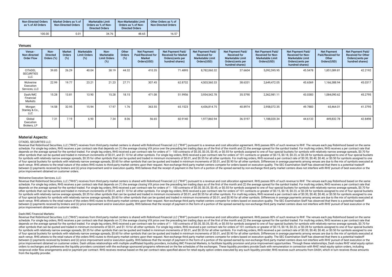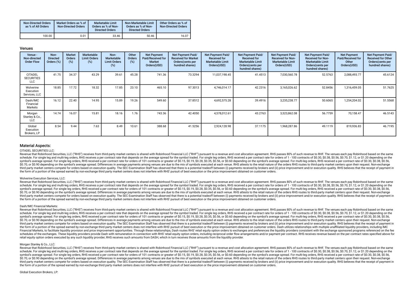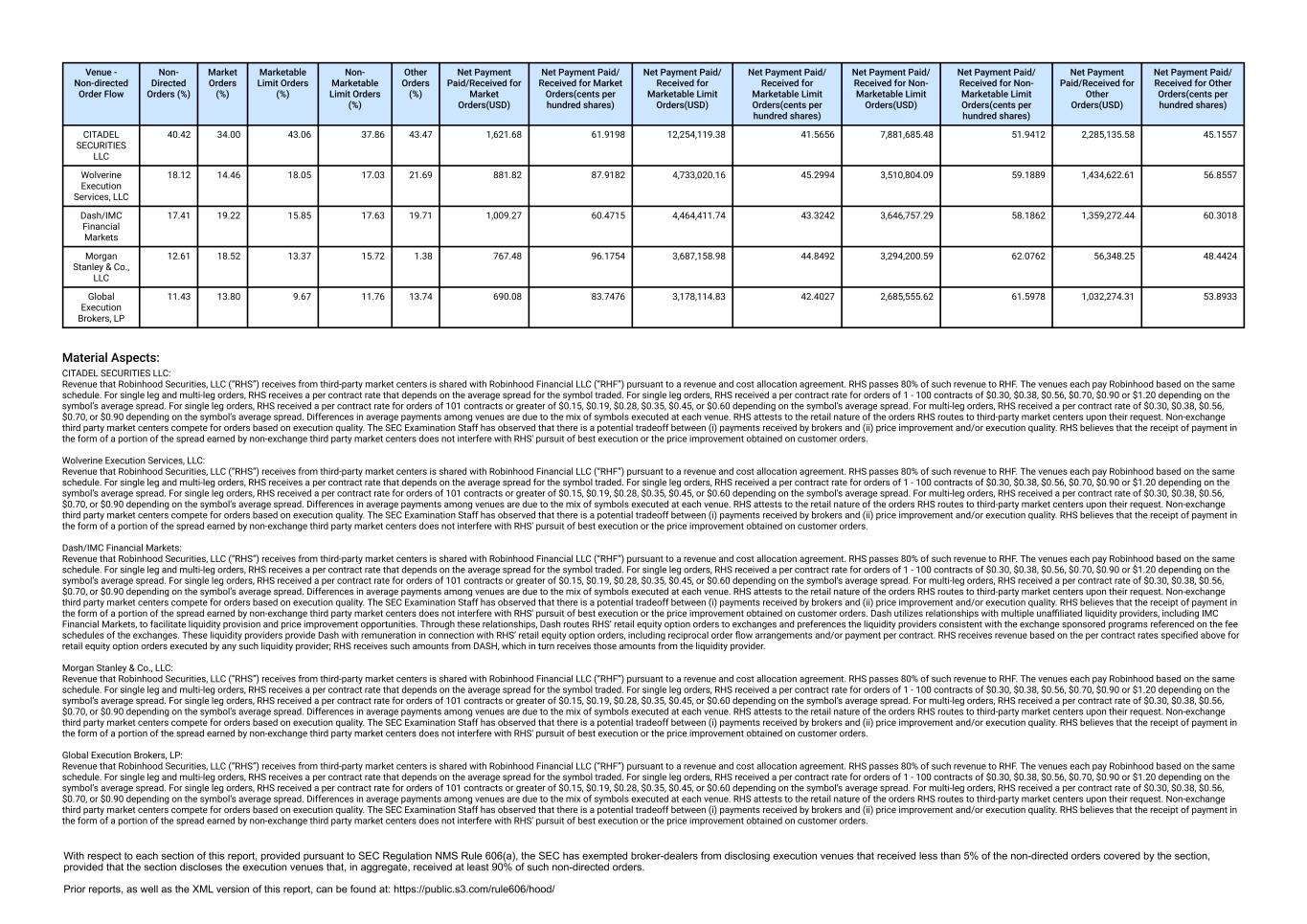 Non-Directed Orders as % of All Orders Market Orders as % of Non-Directed Orders Marketable Limit Orders as % of Non- Directed Orders Non-Marketable Limit Orders as % of Non- Directed Orders Other Orders as % of Non-Directed Orders 100.00 0.01 34.76 48.65 16.57 Venues Venue - Non-directed Order Flow Non- Directed Orders (%) Market Orders (%) Marketable Limit Orders (%) Non- Marketable Limit Orders (%) Other Orders (%) Net Payment Paid/Received for Market Orders(USD) Net Payment Paid/ Received for Market Orders(cents per hundred shares) Net Payment Paid/ Received for Marketable Limit Orders(USD) Net Payment Paid/ Received for Marketable Limit Orders(cents per hundred shares) Net Payment Paid/ Received for Non- Marketable Limit Orders(USD) Net Payment Paid/ Received for Non- Marketable Limit Orders(cents per hundred shares) Net Payment Paid/Received for Other Orders(USD) Net Payment Paid/ Received for Other Orders(cents per hundred shares) CITADEL SECURITIES LLC 39.85 26.29 40.04 38.19 44.32 410.35 71.4895 8,782,060.32 37.6604 5,092,595.95 45.5478 1,851,089.81 42.2192 Wolverine Execution Services, LLC 22.99 19.77 23.21 21.23 27.71 307.45 62.8732 4,503,560.33 38.6331 2,649,472.05 45.6569 1,166,388.94 45.0317 Dash/IMC Financial Markets 15.28 13.81 13.90 15.28 18.15 471.08 51.9956 3,934,542.78 35.5790 2,362,981.11 43.0383 1,084,090.62 45.2795 Morgan Stanley & Co., LLC 14.58 32.95 15.94 17.97 1.76 363.55 65.1523 4,436,814.75 40.8974 2,958,072.35 49.7883 65,464.01 41.3795 Global Execution Brokers, LP 7.31 7.19 6.90 7.34 8.06 56.65 60.9140 1,977,860.94 36.5197 1,188,020.34 44.6133 449,832.78 42.8498 Material Aspects: CITADEL SECURITIES LLC: Revenue that Robinhood Securities, LLC (“RHS”) receives from third-party market centers is shared with Robinhood Financial LLC (“RHF”) pursuant to a revenue and cost allocation agreement. RHS passes 80% of such revenue to RHF. The venues each pay Robinhood based on the same schedule. For single leg orders, RHS receives a per contract rate that depends on (1) the average closing VIX price over the preceding ten trading days as of the first of the month and (2) the average spread for the symbol traded. For multi-leg orders, RHS receives a per contract rate that depends on the average spread for the symbol traded. For single leg orders, RHS received a per contract rate for orders of 1 - 100 contracts of $0.30, $0.35, $0.45, or $0.55 for symbols assigned to one of four special buckets for symbols with relatively narrow average spreads, $0.70 for other symbols that can be quoted and traded in minimum increments of $0.01, and $1.10 for all other symbols. For single leg orders, RHS received a per contract rate for orders of 101 contracts or greater of $0.15, $0.18, $0.23, or $0.28 for symbols assigned to one of four special buckets for symbols with relatively narrow average spreads, $0.35 for other symbols that can be quoted and traded in minimum increments of $0.01, and $0.55 for all other symbols. For multi-leg orders, RHS received a per contract rate of $0.30, $0.40, $0.40, or $0.50 for symbols assigned to one of four special buckets for symbols with relatively narrow average spreads, $0.60 for other symbols that can be quoted and traded in minimum increments of $0.01, and $0.90 for all other symbols. Differences in average payments among venues are due to the mix of symbols executed at each venue. RHS attests to the retail nature of the orders RHS routes to third-party market centers upon their request. Non-exchange third party market centers compete for orders based on execution quality. The SEC Examination Staff has observed that there is a potential tradeoff between (i) payments received by brokers and (ii) price improvement and/or execution quality. RHS believes that the receipt of payment in the form of a portion of the spread earned by non-exchange third party market centers does not interfere with RHS' pursuit of best execution or the price improvement obtained on customer orders. Wolverine Execution Services, LLC: Revenue that Robinhood Securities, LLC (“RHS”) receives from third-party market centers is shared with Robinhood Financial LLC (“RHF”) pursuant to a revenue and cost allocation agreement. RHS passes 80% of such revenue to RHF. The venues each pay Robinhood based on the same schedule. For single leg orders, RHS receives a per contract rate that depends on (1) the average closing VIX price over the preceding ten trading days as of the first of the month and (2) the average spread for the symbol traded. For multi-leg orders, RHS receives a per contract rate that depends on the average spread for the symbol traded. For single leg orders, RHS received a per contract rate for orders of 1 - 100 contracts of $0.30, $0.35, $0.45, or $0.55 for symbols assigned to one of four special buckets for symbols with relatively narrow average spreads, $0.70 for other symbols that can be quoted and traded in minimum increments of $0.01, and $1.10 for all other symbols. For single leg orders, RHS received a per contract rate for orders of 101 contracts or greater of $0.15, $0.18, $0.23, or $0.28 for symbols assigned to one of four special buckets for symbols with relatively narrow average spreads, $0.35 for other symbols that can be quoted and traded in minimum increments of $0.01, and $0.55 for all other symbols. For multi-leg orders, RHS received a per contract rate of $0.30, $0.40, $0.40, or $0.50 for symbols assigned to one of four special buckets for symbols with relatively narrow average spreads, $0.60 for other symbols that can be quoted and traded in minimum increments of $0.01, and $0.90 for all other symbols. Differences in average payments among venues are due to the mix of symbols executed at each venue. RHS attests to the retail nature of the orders RHS routes to third-party market centers upon their request. Non-exchange third party market centers compete for orders based on execution quality. The SEC Examination Staff has observed that