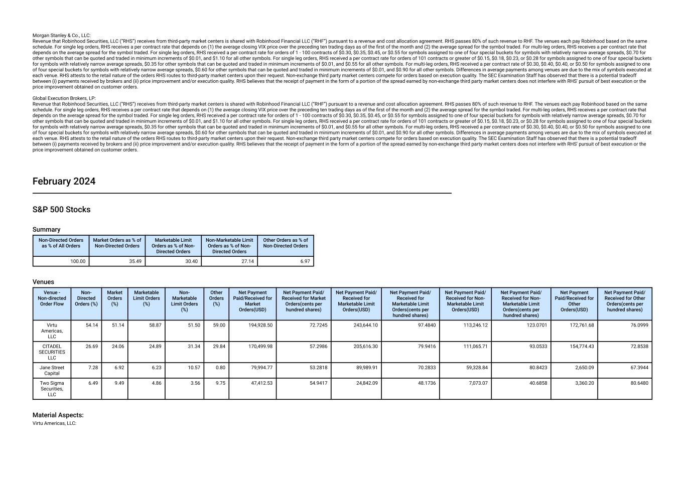 Morgan Stanley & Co., LLC: Revenue that Robinhood Securities, LLC (“RHS”) receives from third-party market centers is shared with Robinhood Financial LLC (“RHF”) pursuant to a revenue and cost allocation agreement. RHS passes 80% of such revenue to RHF. The venues each pay Robinhood based on the same schedule. For single leg orders, RHS receives a per contract rate that depends on (1) the average closing VIX price over the preceding ten trading days as of the first of the month and (2) the average spread for the symbol traded. For multi-leg orders, RHS receives a per contract rate that depends on the average spread for the symbol traded. For single leg orders, RHS received a per contract rate for orders of 1 - 100 contracts of $0.30, $0.35, $0.45, or $0.55 for symbols assigned to one of four special buckets for symbols with relatively narrow average spreads, $0.70 for other symbols that can be quoted and traded in minimum increments of $0.01, and $1.10 for all other symbols. For single leg orders, RHS received a per contract rate for orders of 101 contracts or greater of $0.15, $0.18, $0.23, or $0.28 for symbols assigned to one of four special buckets for symbols with relatively narrow average spreads, $0.35 for other symbols that can be quoted and traded in minimum increments of $0.01, and $0.55 for all other symbols. For multi-leg orders, RHS received a per contract rate of $0.30, $0.40, $0.40, or $0.50 for symbols assigned to one of four special buckets for symbols with relatively narrow average spreads, $0.60 for other symbols that can be quoted and traded in minimum increments of $0.01, and $0.90 for all other symbols. Differences in average payments among venues are due to the mix of symbols executed at each venue. RHS attests to the retail nature of the orders RHS routes to third-party market centers upon their request. Non-exchange third party market centers compete for orders based on execution quality. The SEC Examination Staff has observed that there is a potential tradeoff between (i) payments received by brokers and (ii) price improvement and/or execution quality. RHS believes that the receipt of payment in the form of a portion of the spread earned by non-exchange third party market centers does not interfere with RHS' pursuit of best execution or the price improvement obtained on customer orders. Global Execution Brokers, LP: Revenue that Robinhood Securities, LLC (“RHS”) receives from third-party market centers is shared with Robinhood Financial LLC (“RHF”) pursuant to a revenue and cost allocation agreement. RHS passes 80% of such revenue to RHF. The venues each pay Robinhood based on the same schedule. For single leg orders, RHS receives a per contract rate that depends on (1) the average closing VIX price over the preceding ten trading days as of the first of the month and (2) the average spread for the symbol traded. For multi-leg orders, RHS receives a per contract rate that depends on the average spread for the symbol traded. For single leg orders, RHS received a per contract rate for orders of 1 - 100 contracts of $0.30, $0.35, $0.45, or $0.55 for symbols assigned to one of four special buckets for symbols with relatively narrow average spreads, $0.70 for other symbols that can be quoted and traded in minimum increments of $0.01, and $1.10 for all other symbols. For single leg orders, RHS received a per contract rate for orders of 101 contracts or greater of $0.15, $0.18, $0.23, or $0.28 for symbols assigned to one of four special buckets for symbols with relatively narrow average spreads, $0.35 for other symbols that can be quoted and traded in minimum increments of $0.01, and $0.55 for all other symbols. For multi-leg orders, RHS received a per contract rate of $0.30, $0.40, $0.40, or $0.50 for symbols assigned to one of four special buckets for symbols with relatively narrow average spreads, $0.60 for other symbols that can be quoted and traded in minimum increments of $0.01, and $0.90 for all other symbols. Differences in average payments among venues are due to the mix of symbols executed at each venue. RHS attests to the retail nature of the orders RHS routes to third-party market centers upon their request. Non-exchange third party market centers compete for orders based on execution quality. The SEC Examination Staff has observed that there is a potential tradeoff between (i) payments received by brokers and (ii) price improvement and/or execution quality. RHS believes that the receipt of payment in the form of a portion of the spread earned by non-exchange third party market centers does not interfere with RHS' pursuit of best execution or the price improvement obtained on customer orders. February 2024 S&P 500 Stocks Summary Non-Directed Orders as % of All Orders Market Orders as % of Non-Directed Orders Marketable Limit Orders as % of Non- Directed Orders Non-Marketable Limit Orders as % of Non- Directed Orders Other Orders as % of Non-Directed Orders 100.00 35.49 30.40 27.14 6.97 Venues Venue - Non-directed Order Flow Non- Directed Orders (%) Market Orders (%) Marketable Limit Orders (%) Non- Marketable Limit Orders (%) Other Orders (%) Net Payment Paid/Received for Market Orders(USD) Net Payment Paid/ Received for Market Orders(cents per hundred shares) Net Payment Paid/ Received for Marketable Limit Orders(USD) Net Payment Paid/ Received for Marketable Limit Orders(cents per hundred shares) Net Payment Paid/ Received for Non- Marketable Limit Orders(USD) Net Payment Paid/ Received for Non- Marketable Limit Orders(cents per hundred shares) Net Payment Paid/Received for Other Orders(USD) Net Payment Paid/ Received for Other Orders(cents per hundred shares) Virtu Americas, LLC 54.14 51.14 58.87 51.50 59.00 194,928.50 72.7245 243,644.10 97.4840 113,246.12 123.0701 172,761.68 76.0999 CITADEL SECURITIES LLC 26.69 24.06 24.89 31.34 29.84 170,499.98 57.2986 205,616.30 79.9416 111,065.71 93.0533 154,774.43 72.8538 Jane Street Capital 7.28 6.92 