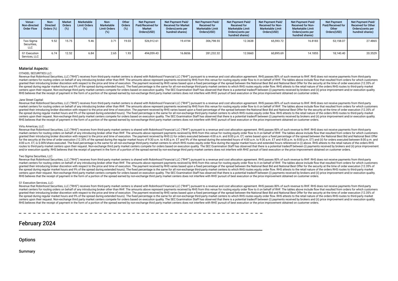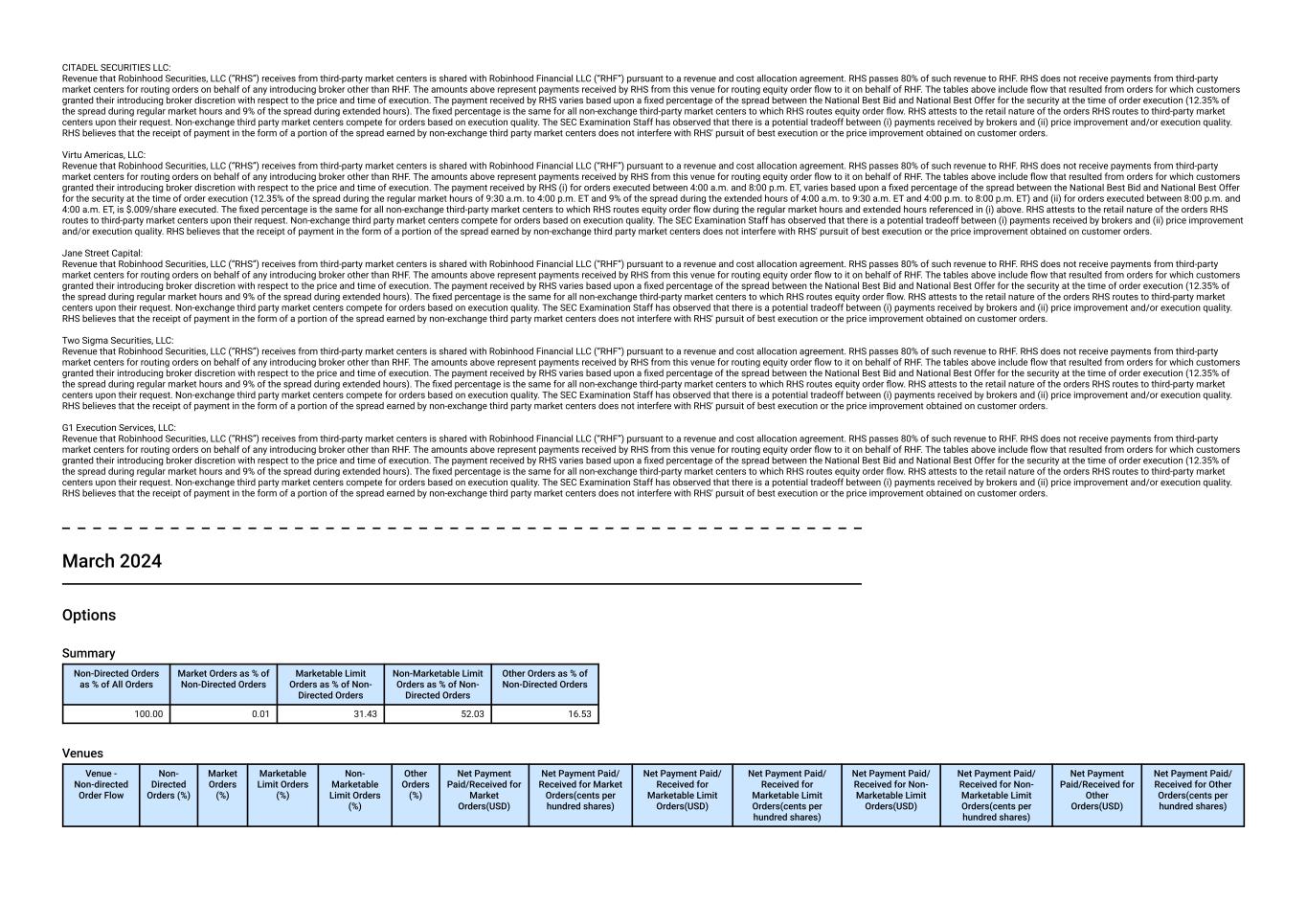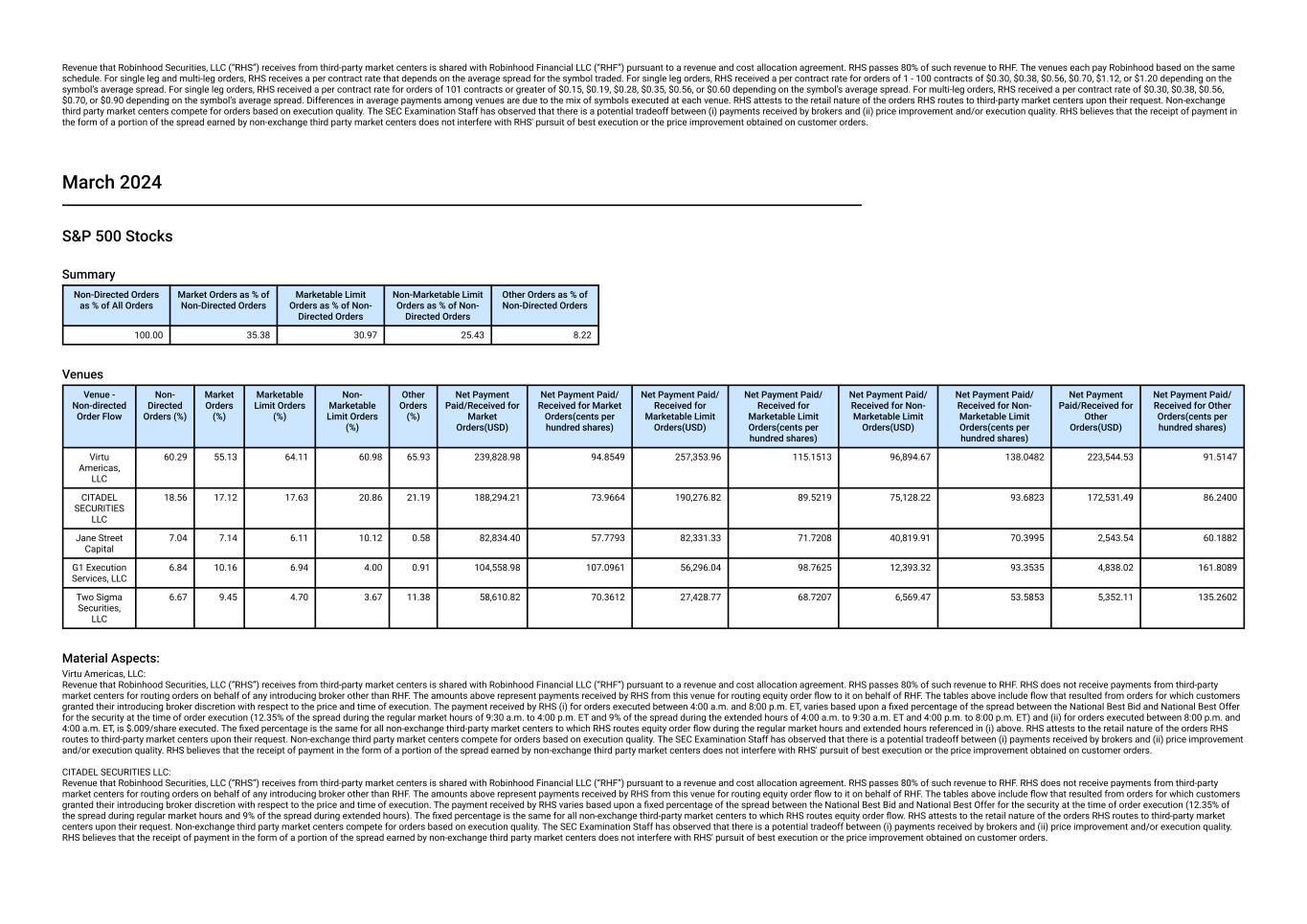 Revenue that Robinhood Securities, LLC (“RHS”) receives from third-party market centers is shared with Robinhood Financial LLC (“RHF”) pursuant to a revenue and cost allocation agreement. RHS passes 80% of such revenue to RHF. The venues each pay Robinhood based on the same schedule. For single leg and multi-leg orders, RHS receives a per contract rate that depends on the average spread for the symbol traded. For single leg orders, RHS received a per contract rate for orders of 1 - 100 contracts of $0.30, $0.38, $0.56, $0.70, $1.12, or $1.20 depending on the symbol’s average spread. For single leg orders, RHS received a per contract rate for orders of 101 contracts or greater of $0.15, $0.19, $0.28, $0.35, $0.56, or $0.60 depending on the symbol’s average spread. For multi-leg orders, RHS received a per contract rate of $0.30, $0.38, $0.56, $0.70, or $0.90 depending on the symbol’s average spread. Differences in average payments among venues are due to the mix of symbols executed at each venue. RHS attests to the retail nature of the orders RHS routes to third-party market centers upon their request. Non-exchange third party market centers compete for orders based on execution quality. The SEC Examination Staff has observed that there is a potential tradeoff between (i) payments received by brokers and (ii) price improvement and/or execution quality. RHS believes that the receipt of payment in the form of a portion of the spread earned by non-exchange third party market centers does not interfere with RHS' pursuit of best execution or the price improvement obtained on customer orders. March 2024 S&P 500 Stocks Summary Non-Directed Orders as % of All Orders Market Orders as % of Non-Directed Orders Marketable Limit Orders as % of Non- Directed Orders Non-Marketable Limit Orders as % of Non- Directed Orders Other Orders as % of Non-Directed Orders 100.00 35.38 30.97 25.43 8.22 Venues Venue - Non-directed Order Flow Non- Directed Orders (%) Market Orders (%) Marketable Limit Orders (%) Non- Marketable Limit Orders (%) Other Orders (%) Net Payment Paid/Received for Market Orders(USD) Net Payment Paid/ Received for Market Orders(cents per hundred shares) Net Payment Paid/ Received for Marketable Limit Orders(USD) Net Payment Paid/ Received for Marketable Limit Orders(cents per hundred shares) Net Payment Paid/ Received for Non- Marketable Limit Orders(USD) Net Payment Paid/ Received for Non- Marketable Limit Orders(cents per hundred shares) Net Payment Paid/Received for Other Orders(USD) Net Payment Paid/ Received for Other Orders(cents per hundred shares) Virtu Americas, LLC 60.29 55.13 64.11 60.98 65.93 239,828.98 94.8549 257,353.96 115.1513 96,894.67 138.0482 223,544.53 91.5147 CITADEL SECURITIES LLC 18.56 17.12 17.63 20.86 21.19 188,294.21 73.9664 190,276.82 89.5219 75,128.22 93.6823 172,531.49 86.2400 Jane Street Capital 7.04 7.14 6.11 10.12 0.58 82,834.40 57.7793 82,331.33 71.7208 40,819.91 70.3995 2,543.54 60.1882 G1 Execution Services, LLC 6.84 10.16 6.94 4.00 0.91 104,558.98 107.0961 56,296.04 98.7625 12,393.32 93.3535 4,838.02 161.8089 Two Sigma Securities, LLC 6.67 9.45 4.70 3.67 11.38 58,610.82 70.3612 27,428.77 68.7207 6,569.47 53.5853 5,352.11 135.2602 Material Aspects: Virtu Americas, LLC: Revenue that Robinhood Securities, LLC (“RHS”) receives from third-party market centers is shared with Robinhood Financial LLC (“RHF”) pursuant to a revenue and cost allocation agreement. RHS passes 80% of such revenue to RHF. RHS does not receive payments from third-party market centers for routing orders on behalf of any introducing broker other than RHF. The amounts above represent payments received by RHS from this venue for routing equity order flow to it on behalf of RHF. The tables above include flow that resulted from orders for which customers granted their introducing broker discretion with respect to the price and time of execution. The payment received by RHS (i) for orders executed between 4:00 a.m. and 8:00 p.m. ET, varies based upon a fixed percentage of the spread between the National Best Bid and National Best Offer for the security at the time of order execution (12.35% of the spread during the regular market hours of 9:30 a.m. to 4:00 p.m. ET and 9% of the spread during the extended hours of 4:00 a.m. to 9:30 a.m. ET and 4:00 p.m. to 8:00 p.m. ET) and (ii) for orders executed between 8:00 p.m. and 4:00 a.m. ET, is $.009/share executed. The fixed percentage is the same for all non-exchange third-party market centers to which RHS routes equity order flow during the regular market hours and extended hours referenced in (i) above. RHS attests to the retail nature of the orders RHS routes to third-party market centers upon their request. Non-exchange third party market centers compete for orders based on execution quality. The SEC Examination Staff has observed that there is a potential tradeoff between (i) payments received by brokers and (ii) price improvement and/or execution quality. RHS believes that the receipt of payment in the form of a portion of the spread earned by non-exchange third party market centers does not interfere with RHS' pursuit of best execution or the price improvement obtained on customer orders. CITADEL SECURITIES LLC: Revenue that Robinhood Securities, LLC (“RHS”) receives from third-party market centers is shared with Robinhood Financial LLC (“RHF”) pursuant to a revenue and cost allocation agreement. RHS passes 80% of such revenue to RHF. RHS does not receive payments from third-party market centers for routing orders on behalf of any introducing broker other than RHF. The amounts above represent payments received by RHS from this venue for routing equity order flow to it on behalf of RHF. The tables above include flow that resulted from orders for which customers granted their introducing broker discretion with respect to the price and time of execution. The payment received by RHS varies based upon a fixed percentage 