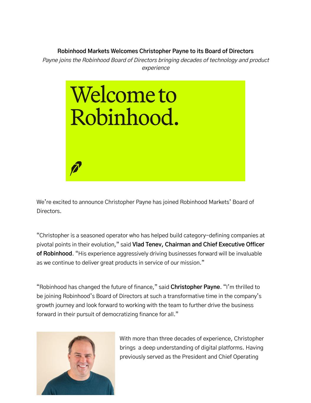 Robinhood Markets Welcomes Christopher Payne to its Board of Directors Payne joins the Robinhood Board of Directors bringing decades of technology and product experience We’re excited to announce Christopher Payne has joined Robinhood Markets’ Board of Directors. “Christopher is a seasoned operator who has helped build category-defining companies at pivotal points in their evolution,” said Vlad Tenev, Chairman and Chief Executive Officer of Robinhood. “His experience aggressively driving businesses forward will be invaluable as we continue to deliver great products in service of our mission.” “Robinhood has changed the future of finance,” said Christopher Payne. “I’m thrilled to be joining Robinhood’s Board of Directors at such a transformative time in the company’s growth journey and look forward to working with the team to further drive the business forward in their pursuit of democratizing finance for all.” With more than three decades of experience, Christopher brings a deep understanding of digital platforms. Having previously served as the President and Chief Operating