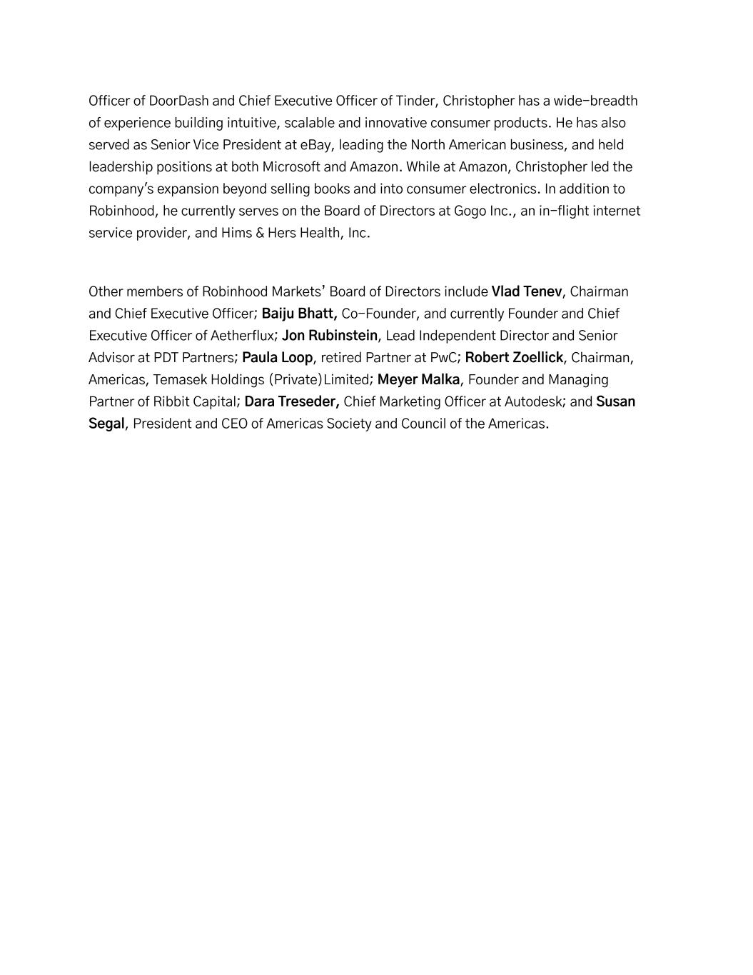 Officer of DoorDash and Chief Executive Officer of Tinder, Christopher has a wide-breadth of experience building intuitive, scalable and innovative consumer products. He has also served as Senior Vice President at eBay, leading the North American business, and held leadership positions at both Microsoft and Amazon. While at Amazon, Christopher led the company's expansion beyond selling books and into consumer electronics. In addition to Robinhood, he currently serves on the Board of Directors at Gogo Inc., an in-flight internet service provider, and Hims & Hers Health, Inc. Other members of Robinhood Markets’ Board of Directors include Vlad Tenev, Chairman and Chief Executive Officer; Baiju Bhatt, Co-Founder, and currently Founder and Chief Executive Officer of Aetherflux; Jon Rubinstein, Lead Independent Director and Senior Advisor at PDT Partners; Paula Loop, retired Partner at PwC; Robert Zoellick, Chairman, Americas, Temasek Holdings (Private)Limited;Meyer Malka, Founder and Managing Partner of Ribbit Capital; Dara Treseder, Chief Marketing Officer at Autodesk; and Susan Segal, President and CEO of Americas Society and Council of the Americas.