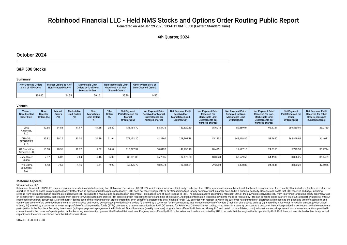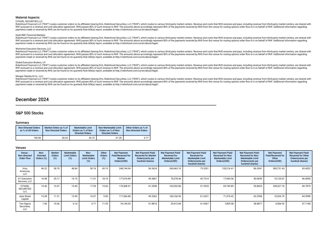 Material Aspects: CITADEL SECURITIES LLC: Robinhood Financial LLC (“RHF”) routes customer orders to its affiliated clearing firm, Robinhood Securities, LLC (“RHS”), which routes to various third-party market centers. Revenue and costs that RHS receives and pays, including revenue from third-party market centers, are shared with RHF pursuant to a revenue and cost allocation agreement. RHS passes 80% of such revenue to RHF. The amounts above accordingly represent 80% of the payments received by RHS from this venue for routing options order flow to it on behalf of RHF. Additional information regarding payments made or received by RHS can be found on its quarterly Rule 606(a) report, available at http://robinhood.com/us/en/about/legal/. Dash/IMC Financial Markets: Robinhood Financial LLC (“RHF”) routes customer orders to its affiliated clearing firm, Robinhood Securities, LLC (“RHS”), which routes to various third-party market centers. Revenue and costs that RHS receives and pays, including revenue from third-party market centers, are shared with RHF pursuant to a revenue and cost allocation agreement. RHS passes 80% of such revenue to RHF. The amounts above accordingly represent 80% of the payments received by RHS from this venue for routing options order flow to it on behalf of RHF. Additional information regarding payments made or received by RHS can be found on its quarterly Rule 606(a) report, available at http://robinhood.com/us/en/about/legal/. Wolverine Execution Services, LLC: Robinhood Financial LLC (“RHF”) routes customer orders to its affiliated clearing firm, Robinhood Securities, LLC (“RHS”), which routes to various third-party market centers. Revenue and costs that RHS receives and pays, including revenue from third-party market centers, are shared with RHF pursuant to a revenue and cost allocation agreement. RHS passes 80% of such revenue to RHF. The amounts above accordingly represent 80% of the payments received by RHS from this venue for routing options order flow to it on behalf of RHF. Additional information regarding payments made or received by RHS can be found on its quarterly Rule 606(a) report, available at http://robinhood.com/us/en/about/legal/. Global Execution Brokers, LP: Robinhood Financial LLC (“RHF”) routes customer orders to its affiliated clearing firm, Robinhood Securities, LLC (“RHS”), which routes to various third-party market centers. Revenue and costs that RHS receives and pays, including revenue from third-party market centers, are shared with RHF pursuant to a revenue and cost allocation agreement. RHS passes 80% of such revenue to RHF. The amounts above accordingly represent 80% of the payments received by RHS from this venue for routing options order flow to it on behalf of RHF. Additional information regarding payments made or received by RHS can be found on its quarterly Rule 606(a) report, available at http://robinhood.com/us/en/about/legal/. Morgan Stanley & Co., LLC: Robinhood Financial LLC (“RHF”) routes customer orders to its affiliated clearing firm, Robinhood Securities, LLC (“RHS”), which routes to various third-party market centers. Revenue and costs that RHS receives and pays, including revenue from third-party market centers, are shared with RHF pursuant to a revenue and cost allocation agreement. RHS passes 80% of such revenue to RHF. The amounts above accordingly represent 80% of the payments received by RHS from this venue for routing options order flow to it on behalf of RHF. Additional information regarding payments made or received by RHS can be found on its quarterly Rule 606(a) report, available at http://robinhood.com/us/en/about/legal/. December 2024 S&P 500 Stocks Summary Non-Directed Orders as % of All Orders Market Orders as % of Non-Directed Orders Marketable Limit Orders as % of Non- Directed Orders Non-Marketable Limit Orders as % of Non- Directed Orders Other Orders as % of Non-Directed Orders 100.00 28.24 30.72 31.28 9.77 Venues Venue - Non-directed Order Flow Non- Directed Orders (%) Market Orders (%) Marketable Limit Orders (%) Non- Marketable Limit Orders (%) Other Orders (%) Net Payment Paid/Received for Market Orders(USD) Net Payment Paid/ Received for Market Orders(cents per hundred shares) Net Payment Paid/ Received for Marketable Limit Orders(USD) Net Payment Paid/ Received for Marketable Limit Orders(cents per hundred shares) Net Payment Paid/ Received for Non- Marketable Limit Orders(USD) Net Payment Paid/ Received for Non- Marketable Limit Orders(cents per hundred shares) Net Payment Paid/Received for Other Orders(USD) Net Payment Paid/ Received for Other Orders(cents per hundred shares) Virtu Americas, LLC 46.22 38.70 48.84 50.76 45.19 248,744.94 56.3624 260,463.10 73.2051 120,216.41 86.5541 385,731.43 43.4022 G1 Execution Services, LLC 16.98 25.17 15.15 11.01 18.19 177,676.89 49.3867 70,378.46 43.7314 17,945.56 40.0039 10,125.67 46.4040 CITADEL SECURITIES LLC 15.40 13.47 15.40 17.05 15.66 170,468.51 41.2058 165,552.86 51.5233 69,749.85 55.8625 328,527.76 40.7879 Jane Street Capital 13.38 11.31 13.95 16.07 9.00 171,566.88 49.3362 160,166.96 61.6231 71,370.42 63.2958 10,526.79 44.5998 Two Sigma Securities, LLC 7.46 10.36 6.16 4.71 11.95 76,144.03 51.8810 29,413.84 41.0367 7,805.58 38.8877 6,506.92 47.7168