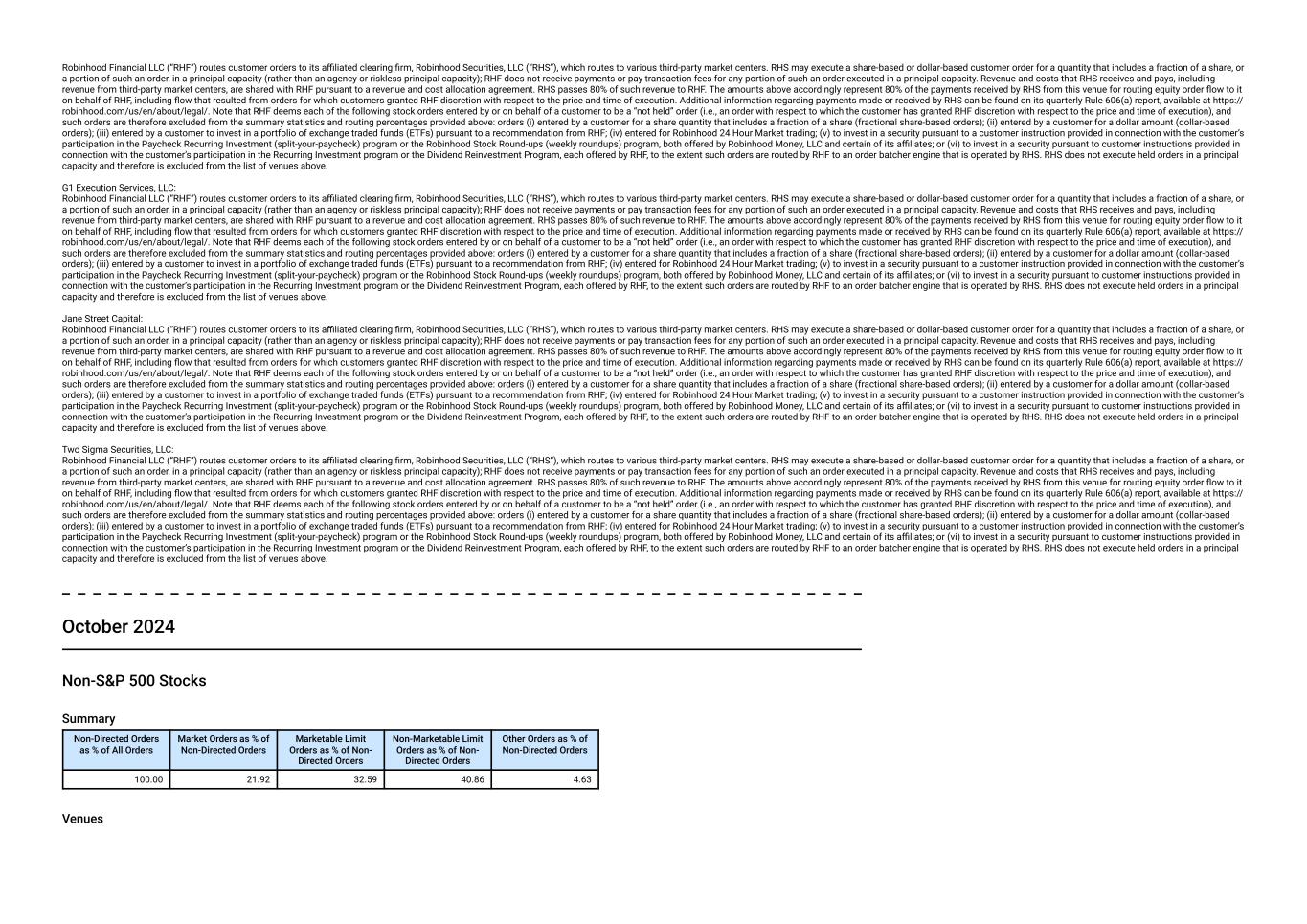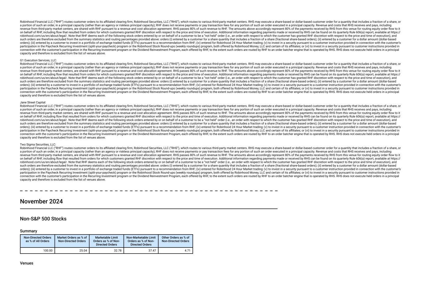 Robinhood Financial LLC (“RHF”) routes customer orders to its affiliated clearing firm, Robinhood Securities, LLC (“RHS”), which routes to various third-party market centers. RHS may execute a share-based or dollar-based customer order for a quantity that includes a fraction of a share, or a portion of such an order, in a principal capacity (rather than an agency or riskless principal capacity); RHF does not receive payments or pay transaction fees for any portion of such an order executed in a principal capacity. Revenue and costs that RHS receives and pays, including revenue from third-party market centers, are shared with RHF pursuant to a revenue and cost allocation agreement. RHS passes 80% of such revenue to RHF. The amounts above accordingly represent 80% of the payments received by RHS from this venue for routing equity order flow to it on behalf of RHF, including flow that resulted from orders for which customers granted RHF discretion with respect to the price and time of execution. Additional information regarding payments made or received by RHS can be found on its quarterly Rule 606(a) report, available at https:// robinhood.com/us/en/about/legal/. Note that RHF deems each of the following stock orders entered by or on behalf of a customer to be a “not held” order (i.e., an order with respect to which the customer has granted RHF discretion with respect to the price and time of execution), and such orders are therefore excluded from the summary statistics and routing percentages provided above: orders (i) entered by a customer for a share quantity that includes a fraction of a share (fractional share-based orders); (ii) entered by a customer for a dollar amount (dollar-based orders); (iii) entered by a customer to invest in a portfolio of exchange traded funds (ETFs) pursuant to a recommendation from RHF; (iv) entered for Robinhood 24 Hour Market trading; (v) to invest in a security pursuant to a customer instruction provided in connection with the customer’s participation in the Paycheck Recurring Investment (split-your-paycheck) program or the Robinhood Stock Round-ups (weekly roundups) program, both offered by Robinhood Money, LLC and certain of its affiliates; or (vi) to invest in a security pursuant to customer instructions provided in connection with the customer’s participation in the Recurring Investment program or the Dividend Reinvestment Program, each offered by RHF, to the extent such orders are routed by RHF to an order batcher engine that is operated by RHS. RHS does not execute held orders in a principal capacity and therefore is excluded from the list of venues above. G1 Execution Services, LLC: Robinhood Financial LLC (“RHF”) routes customer orders to its affiliated clearing firm, Robinhood Securities, LLC (“RHS”), which routes to various third-party market centers. RHS may execute a share-based or dollar-based customer order for a quantity that includes a fraction of a share, or a portion of such an order, in a principal capacity (rather than an agency or riskless principal capacity); RHF does not receive payments or pay transaction fees for any portion of such an order executed in a principal capacity. Revenue and costs that RHS receives and pays, including revenue from third-party market centers, are shared with RHF pursuant to a revenue and cost allocation agreement. RHS passes 80% of such revenue to RHF. The amounts above accordingly represent 80% of the payments received by RHS from this venue for routing equity order flow to it on behalf of RHF, including flow that resulted from orders for which customers granted RHF discretion with respect to the price and time of execution. Additional information regarding payments made or received by RHS can be found on its quarterly Rule 606(a) report, available at https:// robinhood.com/us/en/about/legal/. Note that RHF deems each of the following stock orders entered by or on behalf of a customer to be a “not held” order (i.e., an order with respect to which the customer has granted RHF discretion with respect to the price and time of execution), and such orders are therefore excluded from the summary statistics and routing percentages provided above: orders (i) entered by a customer for a share quantity that includes a fraction of a share (fractional share-based orders); (ii) entered by a customer for a dollar amount (dollar-based orders); (iii) entered by a customer to invest in a portfolio of exchange traded funds (ETFs) pursuant to a recommendation from RHF; (iv) entered for Robinhood 24 Hour Market trading; (v) to invest in a security pursuant to a customer instruction provided in connection with the customer’s participation in the Paycheck Recurring Investment (split-your-paycheck) program or the Robinhood Stock Round-ups (weekly roundups) program, both offered by Robinhood Money, LLC and certain of its affiliates; or (vi) to invest in a security pursuant to customer instructions provided in connection with the customer’s participation in the Recurring Investment program or the Dividend Reinvestment Program, each offered by RHF, to the extent such orders are routed by RHF to an order batcher engine that is operated by RHS. RHS does not execute held orders in a principal capacity and therefore is excluded from the list of venues above. Jane Street Capital: Robinhood Financial LLC (“RHF”) routes customer orders to its affiliated clearing firm, Robinhood Securities, LLC (“RHS”), which routes to various third-party market centers. RHS may execute a share-based or dollar-based customer order for a quantity that includes a fraction of a share, or a portion of such an order, in a principal capacity (rather than an agency or riskless principal capacity); RHF does not receive payments or pay transaction fees for any portion of such an order executed in a principal capacity. Revenue and costs that RHS receives and pays, including revenue from third-party market centers, are sh