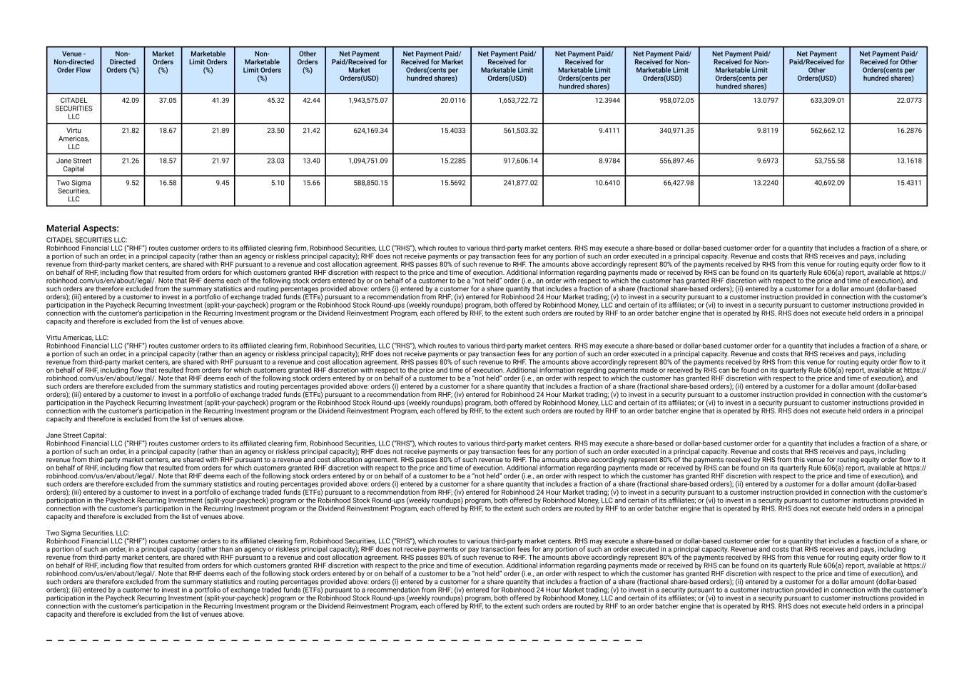 Venue - Non-directed Order Flow Non- Directed Orders (%) Market Orders (%) Marketable Limit Orders (%) Non- Marketable Limit Orders (%) Other Orders (%) Net Payment Paid/Received for Market Orders(USD) Net Payment Paid/ Received for Market Orders(cents per hundred shares) Net Payment Paid/ Received for Marketable Limit Orders(USD) Net Payment Paid/ Received for Marketable Limit Orders(cents per hundred shares) Net Payment Paid/ Received for Non- Marketable Limit Orders(USD) Net Payment Paid/ Received for Non- Marketable Limit Orders(cents per hundred shares) Net Payment Paid/Received for Other Orders(USD) Net Payment Paid/ Received for Other Orders(cents per hundred shares) CITADEL SECURITIES LLC 42.09 37.05 41.39 45.32 42.44 1,943,575.07 20.0116 1,653,722.72 12.3944 958,072.05 13.0797 633,309.01 22.0773 Virtu Americas, LLC 21.82 18.67 21.89 23.50 21.42 624,169.34 15.4033 561,503.32 9.4111 340,971.35 9.8119 562,662.12 16.2876 Jane Street Capital 21.26 18.57 21.97 23.03 13.40 1,094,751.09 15.2285 917,606.14 8.9784 556,897.46 9.6973 53,755.58 13.1618 Two Sigma Securities, LLC 9.52 16.58 9.45 5.10 15.66 588,850.15 15.5692 241,877.02 10.6410 66,427.98 13.2240 40,692.09 15.4311 Material Aspects: CITADEL SECURITIES LLC: Robinhood Financial LLC (“RHF”) routes customer orders to its affiliated clearing firm, Robinhood Securities, LLC (“RHS”), which routes to various third-party market centers. RHS may execute a share-based or dollar-based customer order for a quantity that includes a fraction of a share, or a portion of such an order, in a principal capacity (rather than an agency or riskless principal capacity); RHF does not receive payments or pay transaction fees for any portion of such an order executed in a principal capacity. Revenue and costs that RHS receives and pays, including revenue from third-party market centers, are shared with RHF pursuant to a revenue and cost allocation agreement. RHS passes 80% of such revenue to RHF. The amounts above accordingly represent 80% of the payments received by RHS from this venue for routing equity order flow to it on behalf of RHF, including flow that resulted from orders for which customers granted RHF discretion with respect to the price and time of execution. Additional information regarding payments made or received by RHS can be found on its quarterly Rule 606(a) report, available at https:// robinhood.com/us/en/about/legal/. Note that RHF deems each of the following stock orders entered by or on behalf of a customer to be a “not held” order (i.e., an order with respect to which the customer has granted RHF discretion with respect to the price and time of execution), and such orders are therefore excluded from the summary statistics and routing percentages provided above: orders (i) entered by a customer for a share quantity that includes a fraction of a share (fractional share-based orders); (ii) entered by a customer for a dollar amount (dollar-based orders); (iii) entered by a customer to invest in a portfolio of exchange traded funds (ETFs) pursuant to a recommendation from RHF; (iv) entered for Robinhood 24 Hour Market trading; (v) to invest in a security pursuant to a customer instruction provided in connection with the customer’s participation in the Paycheck Recurring Investment (split-your-paycheck) program or the Robinhood Stock Round-ups (weekly roundups) program, both offered by Robinhood Money, LLC and certain of its affiliates; or (vi) to invest in a security pursuant to customer instructions provided in connection with the customer’s participation in the Recurring Investment program or the Dividend Reinvestment Program, each offered by RHF, to the extent such orders are routed by RHF to an order batcher engine that is operated by RHS. RHS does not execute held orders in a principal capacity and therefore is excluded from the list of venues above. Virtu Americas, LLC: Robinhood Financial LLC (“RHF”) routes customer orders to its affiliated clearing firm, Robinhood Securities, LLC (“RHS”), which routes to various third-party market centers. RHS may execute a share-based or dollar-based customer order for a quantity that includes a fraction of a share, or a portion of such an order, in a principal capacity (rather than an agency or riskless principal capacity); RHF does not receive payments or pay transaction fees for any portion of such an order executed in a principal capacity. Revenue and costs that RHS receives and pays, including revenue from third-party market centers, are shared with RHF pursuant to a revenue and cost allocation agreement. RHS passes 80% of such revenue to RHF. The amounts above accordingly represent 80% of the payments received by RHS from this venue for routing equity order flow to it on behalf of RHF, including flow that resulted from orders for which customers granted RHF discretion with respect to the price and time of execution. Additional information regarding payments made or received by RHS can be found on its quarterly Rule 606(a) report, available at https:// robinhood.com/us/en/about/legal/. Note that RHF deems each of the following stock orders entered by or on behalf of a customer to be a “not held” order (i.e., an order with respect to which the customer has granted RHF discretion with respect to the price and time of execution), and such orders are therefore excluded from the summary statistics and routing percentages provided above: orders (i) entered by a customer for a share quantity that includes a fraction of a share (fractional share-based orders); (ii) entered by a customer for a dollar amount (dollar-based orders); (iii) entered by a customer to invest in a portfolio of exchange traded funds (ETFs) pursuant to a recommendation from RHF; (iv) entered for Robinhood 24 Hour Market trading; (v) to invest in a security pursuant to a customer instruction provided in connection with the customer’s participation in the Paycheck Recurring Investment (split-your-p