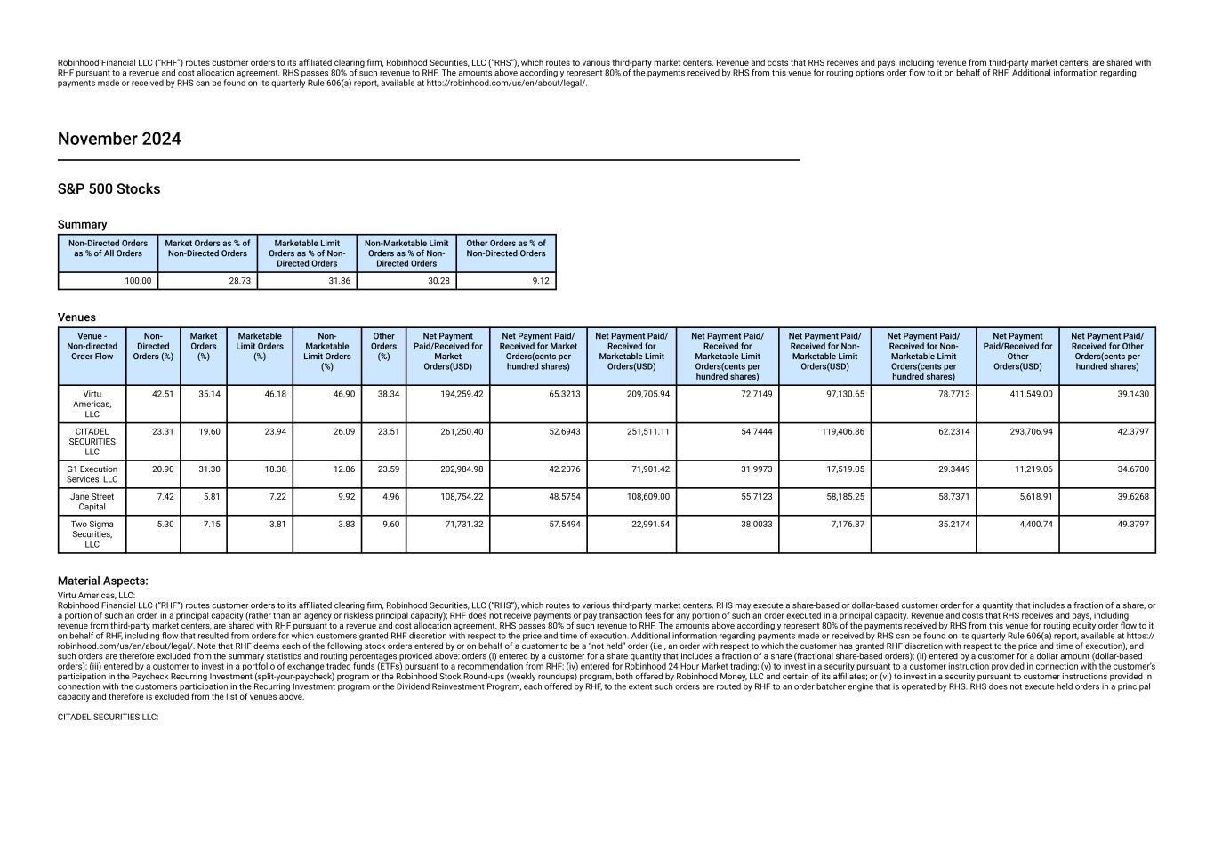 Robinhood Financial LLC (“RHF”) routes customer orders to its affiliated clearing firm, Robinhood Securities, LLC (“RHS”), which routes to various third-party market centers. Revenue and costs that RHS receives and pays, including revenue from third-party market centers, are shared with RHF pursuant to a revenue and cost allocation agreement. RHS passes 80% of such revenue to RHF. The amounts above accordingly represent 80% of the payments received by RHS from this venue for routing options order flow to it on behalf of RHF. Additional information regarding payments made or received by RHS can be found on its quarterly Rule 606(a) report, available at http://robinhood.com/us/en/about/legal/. November 2024 S&P 500 Stocks Summary Non-Directed Orders as % of All Orders Market Orders as % of Non-Directed Orders Marketable Limit Orders as % of Non- Directed Orders Non-Marketable Limit Orders as % of Non- Directed Orders Other Orders as % of Non-Directed Orders 100.00 28.73 31.86 30.28 9.12 Venues Venue - Non-directed Order Flow Non- Directed Orders (%) Market Orders (%) Marketable Limit Orders (%) Non- Marketable Limit Orders (%) Other Orders (%) Net Payment Paid/Received for Market Orders(USD) Net Payment Paid/ Received for Market Orders(cents per hundred shares) Net Payment Paid/ Received for Marketable Limit Orders(USD) Net Payment Paid/ Received for Marketable Limit Orders(cents per hundred shares) Net Payment Paid/ Received for Non- Marketable Limit Orders(USD) Net Payment Paid/ Received for Non- Marketable Limit Orders(cents per hundred shares) Net Payment Paid/Received for Other Orders(USD) Net Payment Paid/ Received for Other Orders(cents per hundred shares) Virtu Americas, LLC 42.51 35.14 46.18 46.90 38.34 194,259.42 65.3213 209,705.94 72.7149 97,130.65 78.7713 411,549.00 39.1430 CITADEL SECURITIES LLC 23.31 19.60 23.94 26.09 23.51 261,250.40 52.6943 251,511.11 54.7444 119,406.86 62.2314 293,706.94 42.3797 G1 Execution Services, LLC 20.90 31.30 18.38 12.86 23.59 202,984.98 42.2076 71,901.42 31.9973 17,519.05 29.3449 11,219.06 34.6700 Jane Street Capital 7.42 5.81 7.22 9.92 4.96 108,754.22 48.5754 108,609.00 55.7123 58,185.25 58.7371 5,618.91 39.6268 Two Sigma Securities, LLC 5.30 7.15 3.81 3.83 9.60 71,731.32 57.5494 22,991.54 38.0033 7,176.87 35.2174 4,400.74 49.3797 Material Aspects: Virtu Americas, LLC: Robinhood Financial LLC (“RHF”) routes customer orders to its affiliated clearing firm, Robinhood Securities, LLC (“RHS”), which routes to various third-party market centers. RHS may execute a share-based or dollar-based customer order for a quantity that includes a fraction of a share, or a portion of such an order, in a principal capacity (rather than an agency or riskless principal capacity); RHF does not receive payments or pay transaction fees for any portion of such an order executed in a principal capacity. Revenue and costs that RHS receives and pays, including revenue from third-party market centers, are shared with RHF pursuant to a revenue and cost allocation agreement. RHS passes 80% of such revenue to RHF. The amounts above accordingly represent 80% of the payments received by RHS from this venue for routing equity order flow to it on behalf of RHF, including flow that resulted from orders for which customers granted RHF discretion with respect to the price and time of execution. Additional information regarding payments made or received by RHS can be found on its quarterly Rule 606(a) report, available at https:// robinhood.com/us/en/about/legal/. Note that RHF deems each of the following stock orders entered by or on behalf of a customer to be a “not held” order (i.e., an order with respect to which the customer has granted RHF discretion with respect to the price and time of execution), and such orders are therefore excluded from the summary statistics and routing percentages provided above: orders (i) entered by a customer for a share quantity that includes a fraction of a share (fractional share-based orders); (ii) entered by a customer for a dollar amount (dollar-based orders); (iii) entered by a customer to invest in a portfolio of exchange traded funds (ETFs) pursuant to a recommendation from RHF; (iv) entered for Robinhood 24 Hour Market trading; (v) to invest in a security pursuant to a customer instruction provided in connection with the customer’s participation in the Paycheck Recurring Investment (split-your-paycheck) program or the Robinhood Stock Round-ups (weekly roundups) program, both offered by Robinhood Money, LLC and certain of its affiliates; or (vi) to invest in a security pursuant to customer instructions provided in connection with the customer’s participation in the Recurring Investment program or the Dividend Reinvestment Program, each offered by RHF, to the extent such orders are routed by RHF to an order batcher engine that is operated by RHS. RHS does not execute held orders in a principal capacity and therefore is excluded from the list of venues above. CITADEL SECURITIES LLC: