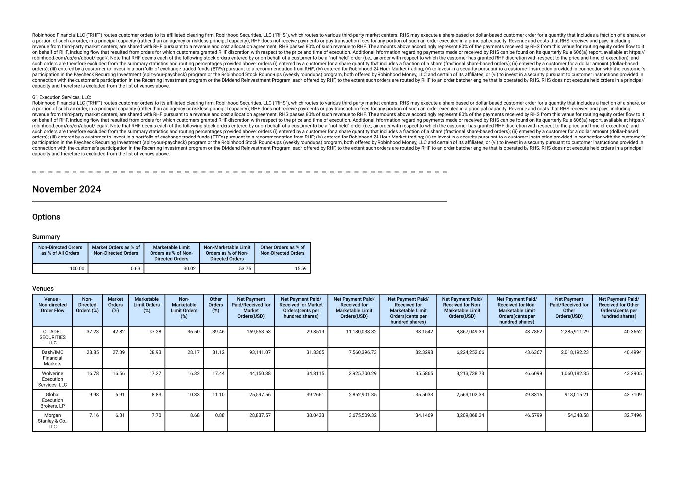 Robinhood Financial LLC (“RHF”) routes customer orders to its affiliated clearing firm, Robinhood Securities, LLC (“RHS”), which routes to various third-party market centers. RHS may execute a share-based or dollar-based customer order for a quantity that includes a fraction of a share, or a portion of such an order, in a principal capacity (rather than an agency or riskless principal capacity); RHF does not receive payments or pay transaction fees for any portion of such an order executed in a principal capacity. Revenue and costs that RHS receives and pays, including revenue from third-party market centers, are shared with RHF pursuant to a revenue and cost allocation agreement. RHS passes 80% of such revenue to RHF. The amounts above accordingly represent 80% of the payments received by RHS from this venue for routing equity order flow to it on behalf of RHF, including flow that resulted from orders for which customers granted RHF discretion with respect to the price and time of execution. Additional information regarding payments made or received by RHS can be found on its quarterly Rule 606(a) report, available at https:// robinhood.com/us/en/about/legal/. Note that RHF deems each of the following stock orders entered by or on behalf of a customer to be a “not held” order (i.e., an order with respect to which the customer has granted RHF discretion with respect to the price and time of execution), and such orders are therefore excluded from the summary statistics and routing percentages provided above: orders (i) entered by a customer for a share quantity that includes a fraction of a share (fractional share-based orders); (ii) entered by a customer for a dollar amount (dollar-based orders); (iii) entered by a customer to invest in a portfolio of exchange traded funds (ETFs) pursuant to a recommendation from RHF; (iv) entered for Robinhood 24 Hour Market trading; (v) to invest in a security pursuant to a customer instruction provided in connection with the customer’s participation in the Paycheck Recurring Investment (split-your-paycheck) program or the Robinhood Stock Round-ups (weekly roundups) program, both offered by Robinhood Money, LLC and certain of its affiliates; or (vi) to invest in a security pursuant to customer instructions provided in connection with the customer’s participation in the Recurring Investment program or the Dividend Reinvestment Program, each offered by RHF, to the extent such orders are routed by RHF to an order batcher engine that is operated by RHS. RHS does not execute held orders in a principal capacity and therefore is excluded from the list of venues above. G1 Execution Services, LLC: Robinhood Financial LLC (“RHF”) routes customer orders to its affiliated clearing firm, Robinhood Securities, LLC (“RHS”), which routes to various third-party market centers. RHS may execute a share-based or dollar-based customer order for a quantity that includes a fraction of a share, or a portion of such an order, in a principal capacity (rather than an agency or riskless principal capacity); RHF does not receive payments or pay transaction fees for any portion of such an order executed in a principal capacity. Revenue and costs that RHS receives and pays, including revenue from third-party market centers, are shared with RHF pursuant to a revenue and cost allocation agreement. RHS passes 80% of such revenue to RHF. The amounts above accordingly represent 80% of the payments received by RHS from this venue for routing equity order flow to it on behalf of RHF, including flow that resulted from orders for which customers granted RHF discretion with respect to the price and time of execution. Additional information regarding payments made or received by RHS can be found on its quarterly Rule 606(a) report, available at https:// robinhood.com/us/en/about/legal/. Note that RHF deems each of the following stock orders entered by or on behalf of a customer to be a “not held” order (i.e., an order with respect to which the customer has granted RHF discretion with respect to the price and time of execution), and such orders are therefore excluded from the summary statistics and routing percentages provided above: orders (i) entered by a customer for a share quantity that includes a fraction of a share (fractional share-based orders); (ii) entered by a customer for a dollar amount (dollar-based orders); (iii) entered by a customer to invest in a portfolio of exchange traded funds (ETFs) pursuant to a recommendation from RHF; (iv) entered for Robinhood 24 Hour Market trading; (v) to invest in a security pursuant to a customer instruction provided in connection with the customer’s participation in the Paycheck Recurring Investment (split-your-paycheck) program or the Robinhood Stock Round-ups (weekly roundups) program, both offered by Robinhood Money, LLC and certain of its affiliates; or (vi) to invest in a security pursuant to customer instructions provided in connection with the customer’s participation in the Recurring Investment program or the Dividend Reinvestment Program, each offered by RHF, to the extent such orders are routed by RHF to an order batcher engine that is operated by RHS. RHS does not execute held orders in a principal capacity and therefore is excluded from the list of venues above. November 2024 Options Summary Non-Directed Orders as % of All Orders Market Orders as % of Non-Directed Orders Marketable Limit Orders as % of Non- Directed Orders Non-Marketable Limit Orders as % of Non- Directed Orders Other Orders as % of Non-Directed Orders 100.00 0.63 30.02 53.75 15.59 Venues Venue - Non-directed Order Flow Non- Directed Orders (%) Market Orders (%) Marketable Limit Orders (%) Non- Marketable Limit Orders (%) Other Orders (%) Net Payment Paid/Received for Market Orders(USD) Net Payment Paid/ Received for Market Orders(cents per hundred shares) Net Payment Paid/ Received for Marketable Limit Orders(USD) Net Payment Paid/ Re