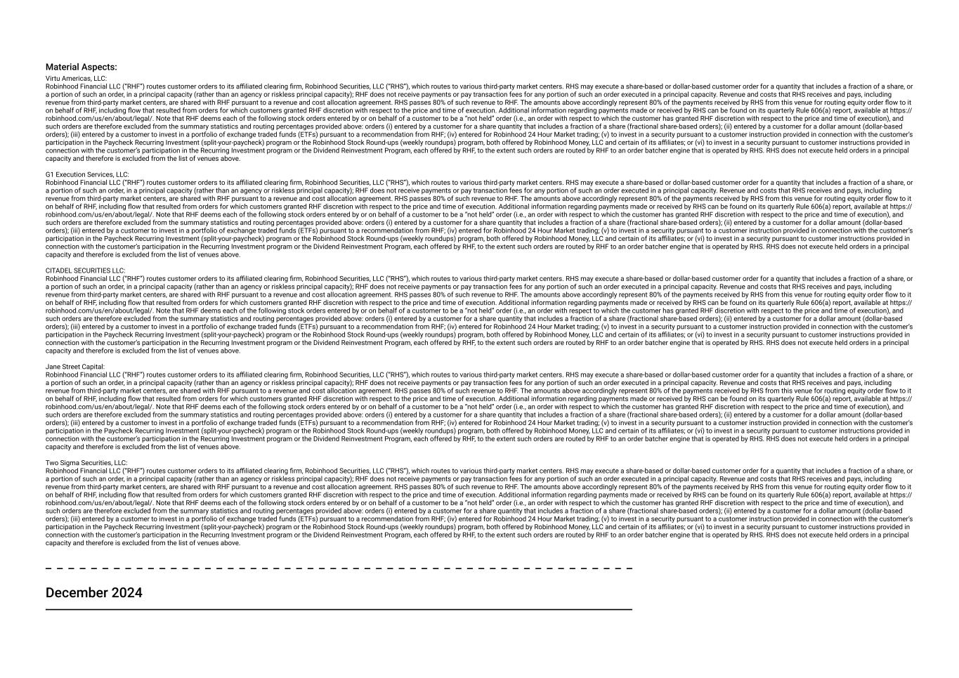 Material Aspects: Virtu Americas, LLC: Robinhood Financial LLC (“RHF”) routes customer orders to its affiliated clearing firm, Robinhood Securities, LLC (“RHS”), which routes to various third-party market centers. RHS may execute a share-based or dollar-based customer order for a quantity that includes a fraction of a share, or a portion of such an order, in a principal capacity (rather than an agency or riskless principal capacity); RHF does not receive payments or pay transaction fees for any portion of such an order executed in a principal capacity. Revenue and costs that RHS receives and pays, including revenue from third-party market centers, are shared with RHF pursuant to a revenue and cost allocation agreement. RHS passes 80% of such revenue to RHF. The amounts above accordingly represent 80% of the payments received by RHS from this venue for routing equity order flow to it on behalf of RHF, including flow that resulted from orders for which customers granted RHF discretion with respect to the price and time of execution. Additional information regarding payments made or received by RHS can be found on its quarterly Rule 606(a) report, available at https:// robinhood.com/us/en/about/legal/. Note that RHF deems each of the following stock orders entered by or on behalf of a customer to be a “not held” order (i.e., an order with respect to which the customer has granted RHF discretion with respect to the price and time of execution), and such orders are therefore excluded from the summary statistics and routing percentages provided above: orders (i) entered by a customer for a share quantity that includes a fraction of a share (fractional share-based orders); (ii) entered by a customer for a dollar amount (dollar-based orders); (iii) entered by a customer to invest in a portfolio of exchange traded funds (ETFs) pursuant to a recommendation from RHF; (iv) entered for Robinhood 24 Hour Market trading; (v) to invest in a security pursuant to a customer instruction provided in connection with the customer’s participation in the Paycheck Recurring Investment (split-your-paycheck) program or the Robinhood Stock Round-ups (weekly roundups) program, both offered by Robinhood Money, LLC and certain of its affiliates; or (vi) to invest in a security pursuant to customer instructions provided in connection with the customer’s participation in the Recurring Investment program or the Dividend Reinvestment Program, each offered by RHF, to the extent such orders are routed by RHF to an order batcher engine that is operated by RHS. RHS does not execute held orders in a principal capacity and therefore is excluded from the list of venues above. G1 Execution Services, LLC: Robinhood Financial LLC (“RHF”) routes customer orders to its affiliated clearing firm, Robinhood Securities, LLC (“RHS”), which routes to various third-party market centers. RHS may execute a share-based or dollar-based customer order for a quantity that includes a fraction of a share, or a portion of such an order, in a principal capacity (rather than an agency or riskless principal capacity); RHF does not receive payments or pay transaction fees for any portion of such an order executed in a principal capacity. Revenue and costs that RHS receives and pays, including revenue from third-party market centers, are shared with RHF pursuant to a revenue and cost allocation agreement. RHS passes 80% of such revenue to RHF. The amounts above accordingly represent 80% of the payments received by RHS from this venue for routing equity order flow to it on behalf of RHF, including flow that resulted from orders for which customers granted RHF discretion with respect to the price and time of execution. Additional information regarding payments made or received by RHS can be found on its quarterly Rule 606(a) report, available at https:// robinhood.com/us/en/about/legal/. Note that RHF deems each of the following stock orders entered by or on behalf of a customer to be a “not held” order (i.e., an order with respect to which the customer has granted RHF discretion with respect to the price and time of execution), and such orders are therefore excluded from the summary statistics and routing percentages provided above: orders (i) entered by a customer for a share quantity that includes a fraction of a share (fractional share-based orders); (ii) entered by a customer for a dollar amount (dollar-based orders); (iii) entered by a customer to invest in a portfolio of exchange traded funds (ETFs) pursuant to a recommendation from RHF; (iv) entered for Robinhood 24 Hour Market trading; (v) to invest in a security pursuant to a customer instruction provided in connection with the customer’s participation in the Paycheck Recurring Investment (split-your-paycheck) program or the Robinhood Stock Round-ups (weekly roundups) program, both offered by Robinhood Money, LLC and certain of its affiliates; or (vi) to invest in a security pursuant to customer instructions provided in connection with the customer’s participation in the Recurring Investment program or the Dividend Reinvestment Program, each offered by RHF, to the extent such orders are routed by RHF to an order batcher engine that is operated by RHS. RHS does not execute held orders in a principal capacity and therefore is excluded from the list of venues above. CITADEL SECURITIES LLC: Robinhood Financial LLC (“RHF”) routes customer orders to its affiliated clearing firm, Robinhood Securities, LLC (“RHS”), which routes to various third-party market centers. RHS may execute a share-based or dollar-based customer order for a quantity that includes a fraction of a share, or a portion of such an order, in a principal capacity (rather than an agency or riskless principal capacity); RHF does not receive payments or pay transaction fees for any portion of such an order executed in a principal capacity. Revenue and costs that RHS receives and pays, including reven