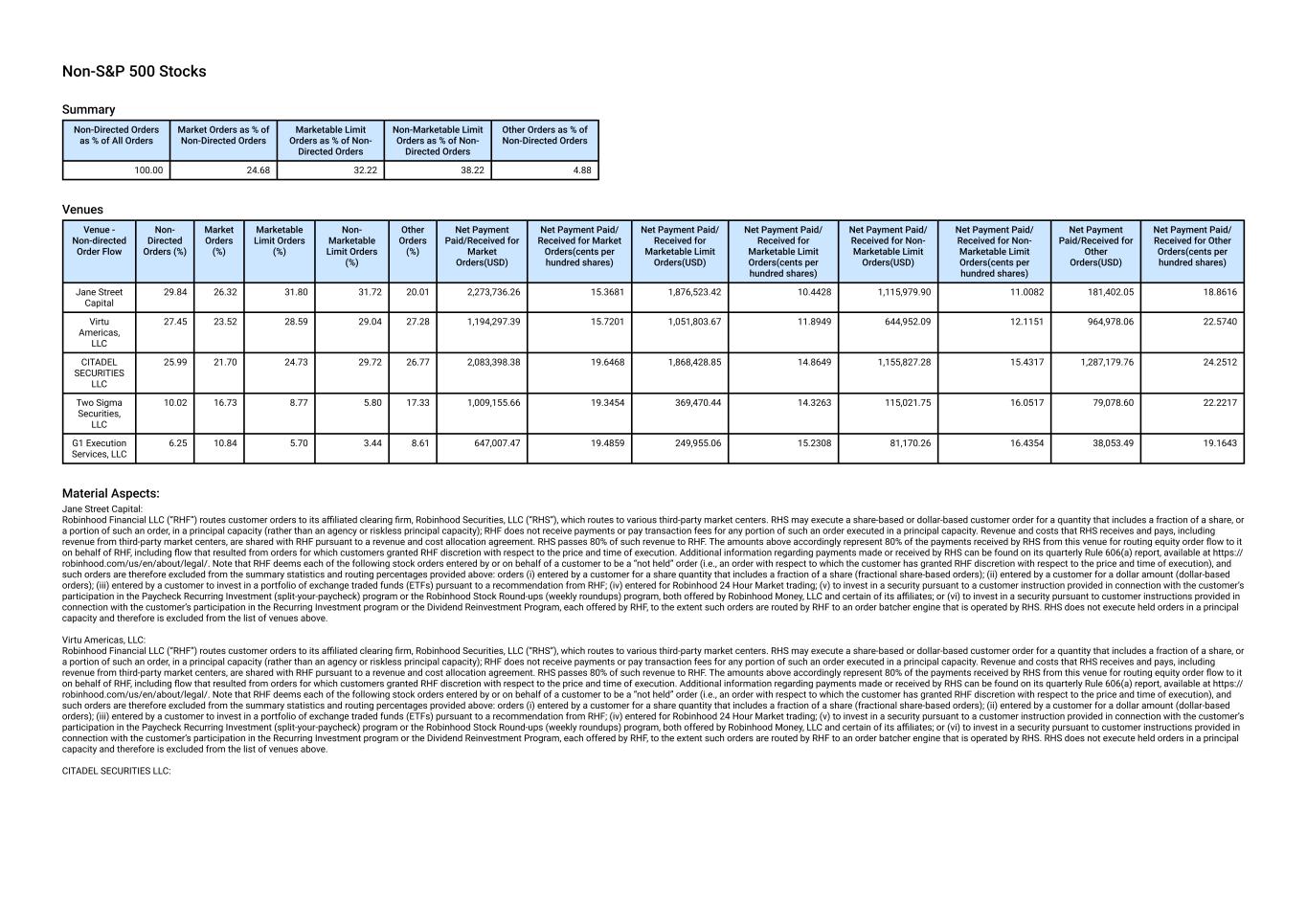 Non-S&P 500 Stocks Summary Non-Directed Orders as % of All Orders Market Orders as % of Non-Directed Orders Marketable Limit Orders as % of Non- Directed Orders Non-Marketable Limit Orders as % of Non- Directed Orders Other Orders as % of Non-Directed Orders 100.00 24.68 32.22 38.22 4.88 Venues Venue - Non-directed Order Flow Non- Directed Orders (%) Market Orders (%) Marketable Limit Orders (%) Non- Marketable Limit Orders (%) Other Orders (%) Net Payment Paid/Received for Market Orders(USD) Net Payment Paid/ Received for Market Orders(cents per hundred shares) Net Payment Paid/ Received for Marketable Limit Orders(USD) Net Payment Paid/ Received for Marketable Limit Orders(cents per hundred shares) Net Payment Paid/ Received for Non- Marketable Limit Orders(USD) Net Payment Paid/ Received for Non- Marketable Limit Orders(cents per hundred shares) Net Payment Paid/Received for Other Orders(USD) Net Payment Paid/ Received for Other Orders(cents per hundred shares) Jane Street Capital 29.84 26.32 31.80 31.72 20.01 2,273,736.26 15.3681 1,876,523.42 10.4428 1,115,979.90 11.0082 181,402.05 18.8616 Virtu Americas, LLC 27.45 23.52 28.59 29.04 27.28 1,194,297.39 15.7201 1,051,803.67 11.8949 644,952.09 12.1151 964,978.06 22.5740 CITADEL SECURITIES LLC 25.99 21.70 24.73 29.72 26.77 2,083,398.38 19.6468 1,868,428.85 14.8649 1,155,827.28 15.4317 1,287,179.76 24.2512 Two Sigma Securities, LLC 10.02 16.73 8.77 5.80 17.33 1,009,155.66 19.3454 369,470.44 14.3263 115,021.75 16.0517 79,078.60 22.2217 G1 Execution Services, LLC 6.25 10.84 5.70 3.44 8.61 647,007.47 19.4859 249,955.06 15.2308 81,170.26 16.4354 38,053.49 19.1643 Material Aspects: Jane Street Capital: Robinhood Financial LLC (“RHF”) routes customer orders to its affiliated clearing firm, Robinhood Securities, LLC (“RHS”), which routes to various third-party market centers. RHS may execute a share-based or dollar-based customer order for a quantity that includes a fraction of a share, or a portion of such an order, in a principal capacity (rather than an agency or riskless principal capacity); RHF does not receive payments or pay transaction fees for any portion of such an order executed in a principal capacity. Revenue and costs that RHS receives and pays, including revenue from third-party market centers, are shared with RHF pursuant to a revenue and cost allocation agreement. RHS passes 80% of such revenue to RHF. The amounts above accordingly represent 80% of the payments received by RHS from this venue for routing equity order flow to it on behalf of RHF, including flow that resulted from orders for which customers granted RHF discretion with respect to the price and time of execution. Additional information regarding payments made or received by RHS can be found on its quarterly Rule 606(a) report, available at https:// robinhood.com/us/en/about/legal/. Note that RHF deems each of the following stock orders entered by or on behalf of a customer to be a “not held” order (i.e., an order with respect to which the customer has granted RHF discretion with respect to the price and time of execution), and such orders are therefore excluded from the summary statistics and routing percentages provided above: orders (i) entered by a customer for a share quantity that includes a fraction of a share (fractional share-based orders); (ii) entered by a customer for a dollar amount (dollar-based orders); (iii) entered by a customer to invest in a portfolio of exchange traded funds (ETFs) pursuant to a recommendation from RHF; (iv) entered for Robinhood 24 Hour Market trading; (v) to invest in a security pursuant to a customer instruction provided in connection with the customer’s participation in the Paycheck Recurring Investment (split-your-paycheck) program or the Robinhood Stock Round-ups (weekly roundups) program, both offered by Robinhood Money, LLC and certain of its affiliates; or (vi) to invest in a security pursuant to customer instructions provided in connection with the customer’s participation in the Recurring Investment program or the Dividend Reinvestment Program, each offered by RHF, to the extent such orders are routed by RHF to an order batcher engine that is operated by RHS. RHS does not execute held orders in a principal capacity and therefore is excluded from the list of venues above. Virtu Americas, LLC: Robinhood Financial LLC (“RHF”) routes customer orders to its affiliated clearing firm, Robinhood Securities, LLC (“RHS”), which routes to various third-party market centers. RHS may execute a share-based or dollar-based customer order for a quantity that includes a fraction of a share, or a portion of such an order, in a principal capacity (rather than an agency or riskless principal capacity); RHF does not receive payments or pay transaction fees for any portion of such an order executed in a principal capacity. Revenue and costs that RHS receives and pays, including revenue from third-party market centers, are shared with RHF pursuant to a revenue and cost allocation agreement. RHS passes 80% of such revenue to RHF. The amounts above accordingly represent 80% of the payments received by RHS from this venue for routing equity order flow to it on behalf of RHF, including flow that resulted from orders for which customers granted RHF discretion with respect to the price and time of execution. Additional information regarding payments made or received by RHS can be found on its quarterly Rule 606(a) report, available at https:// robinhood.com/us/en/about/legal/. Note that RHF deems each of the following stock orders entered by or on behalf of a customer to be a “not held” order (i.e., an order with respect to which the customer has granted RHF discretion with respect to the price and time of execution), and such orders are therefore excluded from the summary statistics and routing percentages provided above: orders (i) entered by a customer for a share quantity that includes a fraction of a share (fraction