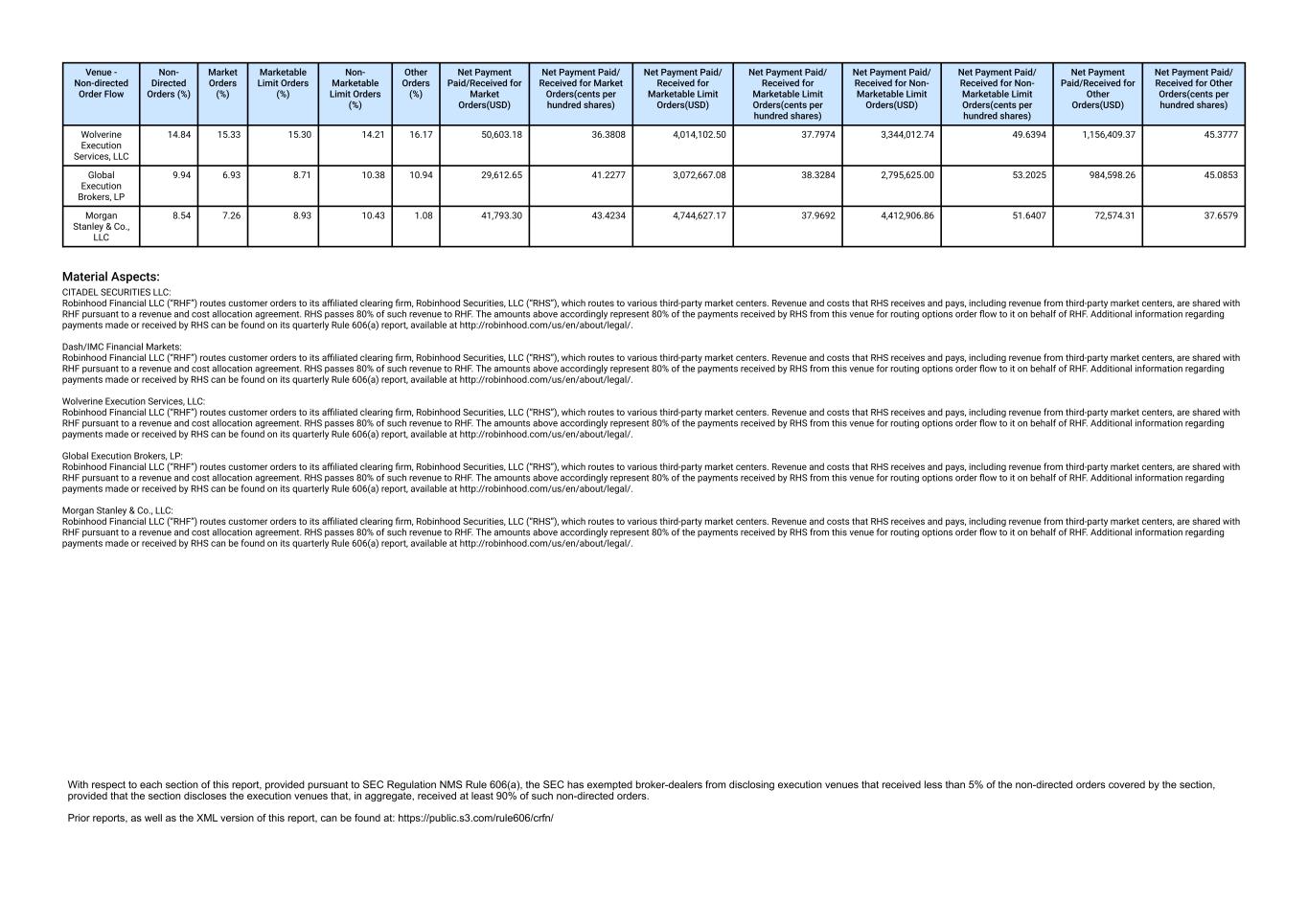 Venue - Non-directed Order Flow Non- Directed Orders (%) Market Orders (%) Marketable Limit Orders (%) Non- Marketable Limit Orders (%) Other Orders (%) Net Payment Paid/Received for Market Orders(USD) Net Payment Paid/ Received for Market Orders(cents per hundred shares) Net Payment Paid/ Received for Marketable Limit Orders(USD) Net Payment Paid/ Received for Marketable Limit Orders(cents per hundred shares) Net Payment Paid/ Received for Non- Marketable Limit Orders(USD) Net Payment Paid/ Received for Non- Marketable Limit Orders(cents per hundred shares) Net Payment Paid/Received for Other Orders(USD) Net Payment Paid/ Received for Other Orders(cents per hundred shares) Wolverine Execution Services, LLC 14.84 15.33 15.30 14.21 16.17 50,603.18 36.3808 4,014,102.50 37.7974 3,344,012.74 49.6394 1,156,409.37 45.3777 Global Execution Brokers, LP 9.94 6.93 8.71 10.38 10.94 29,612.65 41.2277 3,072,667.08 38.3284 2,795,625.00 53.2025 984,598.26 45.0853 Morgan Stanley & Co., LLC 8.54 7.26 8.93 10.43 1.08 41,793.30 43.4234 4,744,627.17 37.9692 4,412,906.86 51.6407 72,574.31 37.6579 Material Aspects: CITADEL SECURITIES LLC: Robinhood Financial LLC (“RHF”) routes customer orders to its affiliated clearing firm, Robinhood Securities, LLC (“RHS”), which routes to various third-party market centers. Revenue and costs that RHS receives and pays, including revenue from third-party market centers, are shared with RHF pursuant to a revenue and cost allocation agreement. RHS passes 80% of such revenue to RHF. The amounts above accordingly represent 80% of the payments received by RHS from this venue for routing options order flow to it on behalf of RHF. Additional information regarding payments made or received by RHS can be found on its quarterly Rule 606(a) report, available at http://robinhood.com/us/en/about/legal/. Dash/IMC Financial Markets: Robinhood Financial LLC (“RHF”) routes customer orders to its affiliated clearing firm, Robinhood Securities, LLC (“RHS”), which routes to various third-party market centers. Revenue and costs that RHS receives and pays, including revenue from third-party market centers, are shared with RHF pursuant to a revenue and cost allocation agreement. RHS passes 80% of such revenue to RHF. The amounts above accordingly represent 80% of the payments received by RHS from this venue for routing options order flow to it on behalf of RHF. Additional information regarding payments made or received by RHS can be found on its quarterly Rule 606(a) report, available at http://robinhood.com/us/en/about/legal/. Wolverine Execution Services, LLC: Robinhood Financial LLC (“RHF”) routes customer orders to its affiliated clearing firm, Robinhood Securities, LLC (“RHS”), which routes to various third-party market centers. Revenue and costs that RHS receives and pays, including revenue from third-party market centers, are shared with RHF pursuant to a revenue and cost allocation agreement. RHS passes 80% of such revenue to RHF. The amounts above accordingly represent 80% of the payments received by RHS from this venue for routing options order flow to it on behalf of RHF. Additional information regarding payments made or received by RHS can be found on its quarterly Rule 606(a) report, available at http://robinhood.com/us/en/about/legal/. Global Execution Brokers, LP: Robinhood Financial LLC (“RHF”) routes customer orders to its affiliated clearing firm, Robinhood Securities, LLC (“RHS”), which routes to various third-party market centers. Revenue and costs that RHS receives and pays, including revenue from third-party market centers, are shared with RHF pursuant to a revenue and cost allocation agreement. RHS passes 80% of such revenue to RHF. The amounts above accordingly represent 80% of the payments received by RHS from this venue for routing options order flow to it on behalf of RHF. Additional information regarding payments made or received by RHS can be found on its quarterly Rule 606(a) report, available at http://robinhood.com/us/en/about/legal/. Morgan Stanley & Co., LLC: Robinhood Financial LLC (“RHF”) routes customer orders to its affiliated clearing firm, Robinhood Securities, LLC (“RHS”), which routes to various third-party market centers. Revenue and costs that RHS receives and pays, including revenue from third-party market centers, are shared with RHF pursuant to a revenue and cost allocation agreement. RHS passes 80% of such revenue to RHF. The amounts above accordingly represent 80% of the payments received by RHS from this venue for routing options order flow to it on behalf of RHF. Additional information regarding payments made or received by RHS can be found on its quarterly Rule 606(a) report, available at http://robinhood.com/us/en/about/legal/.