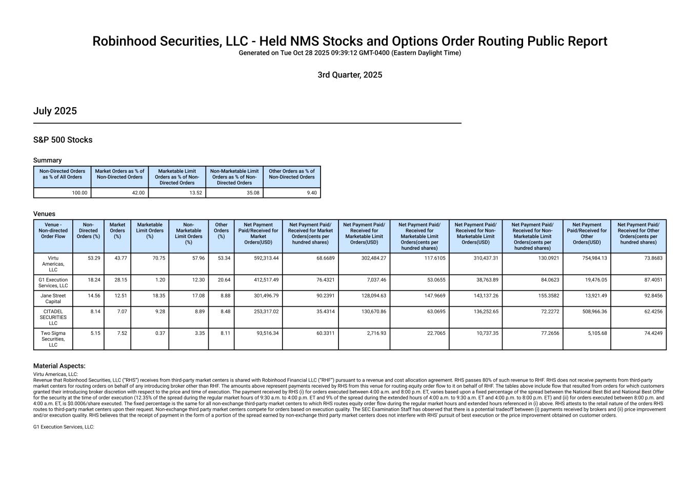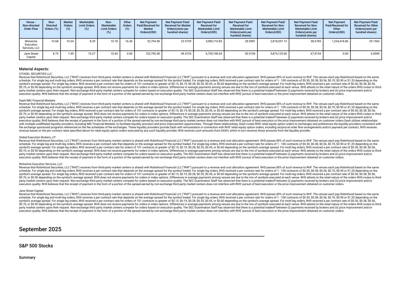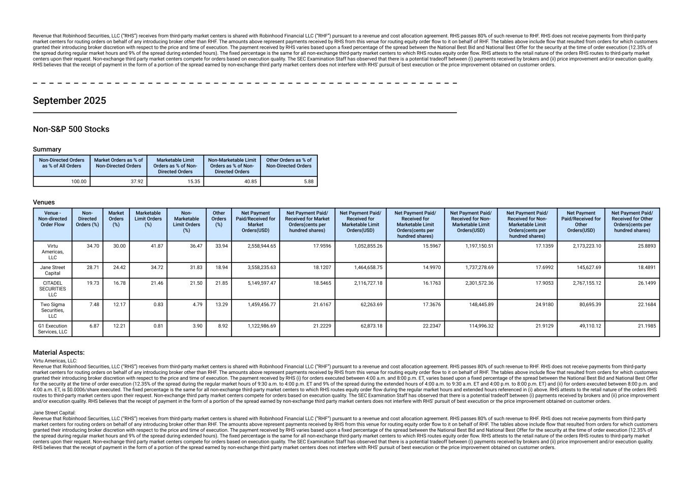 Revenue that Robinhood Securities, LLC (“RHS”) receives from third-party market centers is shared with Robinhood Financial LLC (“RHF”) pursuant to a revenue and cost allocation agreement. RHS passes 80% of such revenue to RHF. RHS does not receive payments from third-party market centers for routing orders on behalf of any introducing broker other than RHF. The amounts above represent payments received by RHS from this venue for routing equity order flow to it on behalf of RHF. The tables above include flow that resulted from orders for which customers granted their introducing broker discretion with respect to the price and time of execution. The payment received by RHS varies based upon a fixed percentage of the spread between the National Best Bid and National Best Offer for the security at the time of order execution (12.35% of the spread during regular market hours and 9% of the spread during extended hours). The fixed percentage is the same for all non-exchange third-party market centers to which RHS routes equity order flow. RHS attests to the retail nature of the orders RHS routes to third-party market centers upon their request. Non-exchange third party market centers compete for orders based on execution quality. The SEC Examination Staff has observed that there is a potential tradeoff between (i) payments received by brokers and (ii) price improvement and/or execution quality. RHS believes that the receipt of payment in the form of a portion of the spread earned by non-exchange third party market centers does not interfere with RHS' pursuit of best execution or the price improvement obtained on customer orders. September 2025 Non-S&P 500 Stocks Summary Non-Directed Orders as % of All Orders Market Orders as % of Non-Directed Orders Marketable Limit Orders as % of Non- Directed Orders Non-Marketable Limit Orders as % of Non- Directed Orders Other Orders as % of Non-Directed Orders 100.00 37.92 15.35 40.85 5.88 Venues Venue - Non-directed Order Flow Non- Directed Orders (%) Market Orders (%) Marketable Limit Orders (%) Non- Marketable Limit Orders (%) Other Orders (%) Net Payment Paid/Received for Market Orders(USD) Net Payment Paid/ Received for Market Orders(cents per hundred shares) Net Payment Paid/ Received for Marketable Limit Orders(USD) Net Payment Paid/ Received for Marketable Limit Orders(cents per hundred shares) Net Payment Paid/ Received for Non- Marketable Limit Orders(USD) Net Payment Paid/ Received for Non- Marketable Limit Orders(cents per hundred shares) Net Payment Paid/Received for Other Orders(USD) Net Payment Paid/ Received for Other Orders(cents per hundred shares) Virtu Americas, LLC 34.70 30.00 41.87 36.47 33.94 2,558,944.65 17.9596 1,052,855.26 15.5967 1,197,150.51 17.1359 2,173,223.10 25.8893 Jane Street Capital 28.71 24.42 34.72 31.83 18.94 3,558,235.63 18.1207 1,464,658.75 14.9970 1,737,278.69 17.6992 145,627.69 18.4891 CITADEL SECURITIES LLC 19.73 16.78 21.46 21.50 21.85 5,149,597.47 18.5465 2,116,727.18 16.1763 2,301,572.36 17.9053 2,767,155.12 26.1499 Two Sigma Securities, LLC 7.48 12.17 0.83 4.79 13.29 1,459,456.77 21.6167 62,263.69 17.3676 148,445.89 24.9180 80,695.39 22.1684 G1 Execution Services, LLC 6.87 12.21 0.81 3.90 8.92 1,122,986.69 21.2229 62,873.18 22.2347 114,996.32 21.9129 49,110.12 21.1985 Material Aspects: Virtu Americas, LLC: Revenue that Robinhood Securities, LLC (“RHS”) receives from third-party market centers is shared with Robinhood Financial LLC (“RHF”) pursuant to a revenue and cost allocation agreement. RHS passes 80% of such revenue to RHF. RHS does not receive payments from third-party market centers for routing orders on behalf of any introducing broker other than RHF. The amounts above represent payments received by RHS from this venue for routing equity order flow to it on behalf of RHF. The tables above include flow that resulted from orders for which customers granted their introducing broker discretion with respect to the price and time of execution. The payment received by RHS (i) for orders executed between 4:00 a.m. and 8:00 p.m. ET, varies based upon a fixed percentage of the spread between the National Best Bid and National Best Offer for the security at the time of order execution (12.35% of the spread during the regular market hours of 9:30 a.m. to 4:00 p.m. ET and 9% of the spread during the extended hours of 4:00 a.m. to 9:30 a.m. ET and 4:00 p.m. to 8:00 p.m. ET) and (ii) for orders executed between 8:00 p.m. and 4:00 a.m. ET, is $0.0006/share executed. The fixed percentage is the same for all non-exchange third-party market centers to which RHS routes equity order flow during the regular market hours and extended hours referenced in (i) above. RHS attests to the retail nature of the orders RHS routes to third-party market centers upon their request. Non-exchange third party market centers compete for orders based on execution quality. The SEC Examination Staff has observed that there is a potential tradeoff between (i) payments received by brokers and (ii) price improvement and/or execution quality. RHS believes that the receipt of payment in the form of a portion of the spread earned by non-exchange third party market centers does not interfere with RHS' pursuit of best execution or the price improvement obtained on customer orders. Jane Street Capital: Revenue that Robinhood Securities, LLC (“RHS”) receives from third-party market centers is shared with Robinhood Financial LLC (“RHF”) pursuant to a revenue and cost allocation agreement. RHS passes 80% of such revenue to RHF. RHS does not receive payments from third-party market centers for routing orders on behalf of any introducing broker other than RHF. The amounts above represent payments received by RHS from this venue for routing equity order flow to it on behalf of RHF. The tables above include flow that resulted from orders for which customers granted their introducing broker discretion with respect to the price and time o