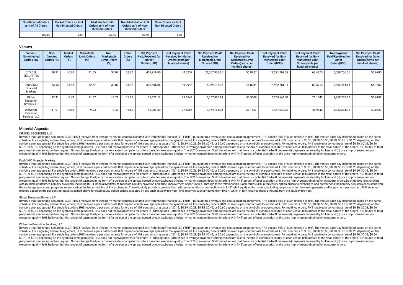 Non-Directed Orders as % of All Orders Market Orders as % of Non-Directed Orders Marketable Limit Orders as % of Non- Directed Orders Non-Marketable Limit Orders as % of Non- Directed Orders Other Orders as % of Non-Directed Orders 100.00 1.07 28.42 53.93 16.58 Venues Venue - Non-directed Order Flow Non- Directed Orders (%) Market Orders (%) Marketable Limit Orders (%) Non- Marketable Limit Orders (%) Other Orders (%) Net Payment Paid/Received for Market Orders(USD) Net Payment Paid/ Received for Market Orders(cents per hundred shares) Net Payment Paid/ Received for Marketable Limit Orders(USD) Net Payment Paid/ Received for Marketable Limit Orders(cents per hundred shares) Net Payment Paid/ Received for Non- Marketable Limit Orders(USD) Net Payment Paid/ Received for Non- Marketable Limit Orders(cents per hundred shares) Net Payment Paid/Received for Other Orders(USD) Net Payment Paid/ Received for Other Orders(cents per hundred shares) CITADEL SECURITIES LLC 38.91 40.74 41.05 37.97 38.20 437,918.86 44.3257 21,267,928.16 56.0727 18,291,792.32 68.4275 4,038,766.05 55.6995 Dash/IMC Financial Markets 33.13 35.45 32.67 33.07 33.97 336,465.86 43.9948 15,969,112.15 46.0704 14,932,781.11 63.3713 3,883,464.64 54.1650 Global Execution Brokers, LP 12.41 6.47 11.67 13.28 11.23 73,522.12 73.3849 6,157,980.81 56.5608 5,269,143.51 73.1043 1,360,232.75 55.6192 Wolverine Execution Services, LLC 11.91 12.59 9.93 11.49 16.59 48,084.30 27.6004 3,974,183.31 38.1527 3,457,042.27 46.9642 1,133,224.72 30.0327 Material Aspects: CITADEL SECURITIES LLC: Revenue that Robinhood Securities, LLC (“RHS”) receives from third-party market centers is shared with Robinhood Financial LLC (“RHF”) pursuant to a revenue and cost allocation agreement. RHS passes 80% of such revenue to RHF. The venues each pay Robinhood based on the same schedule. For single leg and multi-leg orders, RHS receives a per contract rate that depends on the average spread for the symbol traded. For single leg orders, RHS received a per contract rate for orders of 1 - 100 contracts of $0.30, $0.38, $0.56, $0.70, $0.90 or $1.20 depending on the symbol’s average spread. For single leg orders, RHS received a per contract rate for orders of 101 contracts or greater of $0.15, $0.19, $0.28, $0.35, $0.45, or $0.60 depending on the symbol’s average spread. For multi-leg orders, RHS received a per contract rate of $0.30, $0.38, $0.56, $0.70, or $0.90 depending on the symbol’s average spread. RHS does not receive payments for orders in index options. Differences in average payments among venues are due to the mix of symbols executed at each venue. RHS attests to the retail nature of the orders RHS routes to third- party market centers upon their request. Non-exchange third party market centers compete for orders based on execution quality. The SEC Examination Staff has observed that there is a potential tradeoff between (i) payments received by brokers and (ii) price improvement and/or execution quality. RHS believes that the receipt of payment in the form of a portion of the spread earned by non-exchange third party market centers does not interfere with RHS' pursuit of best execution or the price improvement obtained on customer orders. Dash/IMC Financial Markets: Revenue that Robinhood Securities, LLC (“RHS”) receives from third-party market centers is shared with Robinhood Financial LLC (“RHF”) pursuant to a revenue and cost allocation agreement. RHS passes 80% of such revenue to RHF. The venues each pay Robinhood based on the same schedule. For single leg and multi-leg orders, RHS receives a per contract rate that depends on the average spread for the symbol traded. For single leg orders, RHS received a per contract rate for orders of 1 - 100 contracts of $0.30, $0.38, $0.56, $0.70, $0.90 or $1.20 depending on the symbol’s average spread. For single leg orders, RHS received a per contract rate for orders of 101 contracts or greater of $0.15, $0.19, $0.28, $0.35, $0.45, or $0.60 depending on the symbol’s average spread. For multi-leg orders, RHS received a per contract rate of $0.30, $0.38, $0.56, $0.70, or $0.90 depending on the symbol’s average spread. RHS does not receive payments for orders in index options. Differences in average payments among venues are due to the mix of symbols executed at each venue. RHS attests to the retail nature of the orders RHS routes to third- party market centers upon their request. Non-exchange third party market centers compete for orders based on execution quality. The SEC Examination Staff has observed that there is a potential tradeoff between (i) payments received by brokers and (ii) price improvement and/or execution quality. RHS believes that the receipt of payment in the form of a portion of the spread earned by non-exchange third party market centers does not interfere with RHS' pursuit of best execution or the price improvement obtained on customer orders.Dash utilizes relationships with multiple unaffiliated liquidity providers, including IMC Financial Markets, to facilitate liquidity provision and price improvement opportunities. Through these relationships, Dash routes RHS’ retail equity option orders to exchanges and preferences the liquidity providers consistent with the exchange sponsored programs referenced on the fee schedules of the exchanges. These liquidity providers provide Dash with remuneration in connection with RHS’ retail equity option orders, including reciprocal order flow arrangements and/or payment per contract. RHS receives revenue based on the per contract rates specified above for retail equity option orders executed by any such liquidity provider; RHS receives such amounts from DASH, which in turn receives those amounts from the liquidity provider. Global Execution Brokers, LP: Revenue that Robinhood Securities, LLC (“RHS”) receives from third-party market centers is shared with Robinhood Financial LLC (“RHF”) pursuant to a revenue and cost alloca